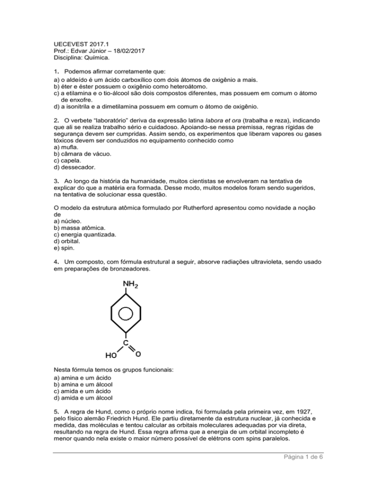 UECEVEST 2017.1 Prof.: Edvar Júnior – 18/02/2017 Disciplina: Química. 1. Podemos afirmar corretamente que: a) o aldeído é um ácido carboxílico com dois átomos de oxigênio a mais. b) éter e éster possuem o oxigênio como heteroátomo. c) a etilamina e o tio-álcool são dois compostos diferentes, mas possuem em comum o átomo de enxofre. d) a isonitrila e a dimetilamina possuem em comum o átomo de oxigênio. 2. O verbete “laboratório” deriva da expressão latina labora et ora (trabalha e reza), indicando que ali se realiza trabalho sério e cuidadoso. Apoiando-se nessa premissa, regras rígidas de segurança devem ser cumpridas. Assim sendo, os experimentos que liberam vapores ou gases tóxicos devem ser conduzidos no equipamento conhecido como a) mufla. b) câmara de vácuo. c) capela. d) dessecador. 3. Ao longo da história da humanidade, muitos cientistas se envolveram na tentativa de explicar do que a matéria era formada. Desse modo, muitos modelos foram sendo sugeridos, na tentativa de solucionar essa questão. O modelo da estrutura atômica formulado por Rutherford apresentou como novidade a noção de a) núcleo. b) massa atômica. c) energia quantizada. d) orbital. e) spin. 4. Um composto, com fórmula estrutural a seguir, absorve radiações ultravioleta, sendo usado em preparações de bronzeadores. Nesta fórmula temos os grupos funcionais: a) amina e um ácido b) amina e um álcool c) amida e um ácido d) amida e um álcool 5. A regra de Hund, como o próprio nome indica, foi formulada pela primeira vez, em 1927, pelo físico alemão Friedrich Hund. Ele partiu diretamente da estrutura nuclear, já conhecida e medida, das moléculas e tentou calcular as orbitais moleculares adequadas por via direta, resultando na regra de Hund. Essa regra afirma que a energia de um orbital incompleto é menor quando nela existe o maior número possível de elétrons com spins paralelos. Página 1 de 6 Considerando a distribuição eletrônica do átomo de enxofre em seu estado fundamental (Z 16), assinale a opção que apresenta a aplicação correta da regra de Hund. a) 1s2 2s2 2p6 3s2 3px2 3py2 3pz0 b) 1s2 2s2 2p6 3s2 3px2 3py1 3pz1 c) 1s2 2s2 2p6 3s2 3px2 3py0 3pz2 d) 1s2 2s2 2p6 3s2 3px1 3py2 3pz1 6. Com relação à solubilidade dos compostos orgânicos, verifica-se que a maioria (que é constituída de compostos apolares) não se dissolve em água (que é um líquido polar). Pelo contrário, os compostos orgânicos são, em geral, solúveis nos chamados solventes orgânicos, como os hidrocarbonetos e éteres. Um caso interessante a considerar é a solubilidade dos alcoóis. Os monoálcoois mais simples são totalmente miscíveis com a água e essa solubilidade é atribuída a) à parte apolar das moléculas dos monoálcoois mais simples. b) ao forte caráter iônico das ligações covalentes das moléculas do monoálcool e as da água. c) às ligações de hidrogênio formadas entre as moléculas do monoálcool e as da água. d) aos monoálcoois mais simples serem formados por grupos orgânicos R, polar, e pelo grupo OH, fracamente apolar. 7. A massa específica ou densidade absoluta de um gás nas CNTP é 1,25 g/L. Sua massa molecular é, aproximadamente, igual à do a) monóxido de mononitrogênio. b) etano. c) monóxido de carbono. d) sulfeto de hidrogênio. 8. Há cerca de dois mil e quinhentos anos, o filósofo grego Demócrito disse que se dividirmos a matéria em pedacinhos, cada vez menores, chegaremos a grãozinhos indivisíveis, que são os átomos (a = não e tomo = parte). Em 1897, o físico inglês Joseph Thompson (1856-1940) descobriu que os átomos eram divisíveis: lá dentro havia o elétron, partícula com carga elétrica negativa. Em 1911, o neozelandês Ernest Rutherford (1871-1937) mostrou que os átomos tinham uma região central compacta chamada núcleo e que lá dentro encontravam-se os prótons, partículas com carga positiva. Atente à figura a seguir, que representa o núcleo e a eletrosfera do átomo. Com relação à figura acima, é correto afirmar que a) o núcleo é muito pequeno, por isso, tem pouca massa se comparado à massa do átomo. b) mais de 90% de toda a massa do átomo está na eletrosfera. c) considerando as reais grandezas do núcleo e da eletrosfera do átomo, se comparadas às suas representações na figura, o tamanho da eletrosfera está desproporcional ao tamanho do núcleo. d) a massa do núcleo é bem maior do que a massa da eletrosfera, cuja relação fica em torno de 100 vezes. Página 2 de 6 9. Na visão de Sommerfeld, o átomo é a) uma esfera maciça, indivisível, homogênea e indestrutível. b) uma esfera de carga positiva que possui elétrons de carga negativa nela incrustados. c) constituído por camadas eletrônicas contendo órbita circular e órbitas elípticas. d) constituído por núcleo e eletrosfera, em que todos os elétrons estão em órbitas circulares. 10. Uma revisão de estudos prova que a vitamina K preserva a saúde dos ossos, previne contra doenças do coração e pode até afastar tumores. A vitamina K1 (filoquinona, fitonadiona) encontra-se principalmente nos vegetais de folhas verdes, tais como folhas de nabo, espinafres, brócolis, couve e alface. Outras fontes ricas são as sementes de soja, fígado de vaca e chá verde. Boas fontes incluem a gema de ovo, aveia, trigo integral, batatas, tomates, aspargos, manteiga e queijo. Com respeito à filoquinona, cuja fórmula estrutural se encontra a seguir, assinale a afirmação verdadeira. a) Possui em sua composição química 31 átomos de carbono. b) Seis é o número de carbonos terciários em sua estrutura. c) É um composto aromático polinuclear condensado com uma função mista de um aldeído. d) Possui 74 ligações sigma (σ ) e 7 ligações pi ( π). 11. Sobre os conceitos elementares de química, é incorreto afirmar-se que a) substância simples é aquela formada por átomos iguais. b) substâncias simples sofrem decomposição por se