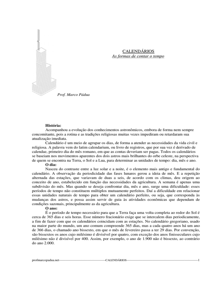 CALENDÁRIOS As formas de contar o tempo Prof. Marco Pádua História: Acompanhou a evolução dos conhecimentos astronômicos, embora de forma nem sempre concomitante, pois a rotina e as tradições religiosas muitas vezes impediram ou retardaram sua atualização imediata. Calendário é um meio de agrupar os dias, de forma a atender as necessidades da vida civil e religiosa. A palavra vem do latim calendarium, ou livro de registros, que por sua vez é derivado de calendae, primeiro dia do mês romano, em que as contas deveriam ser pagas. Todos os calendários se baseiam nos movimentos aparentes dos dois astros mais brilhantes do orbe celeste, na perspectiva de quem se encontra na Terra, o Sol e a Lua, para determinar as unidades de tempo: dia, mês e ano. O dia: Nasceu do contraste entre a luz solar e a noite, é o elemento mais antigo e fundamental do calendário. A observação da periodicidade das fases lunares gerou a ideia de mês. E a repetição alternada das estações, que variavam de duas a seis, de acordo com os climas, deu origem ao conceito de ano, estabelecido em função das necessidades da agricultura. A semana é apenas uma subdivisão do mês. Mas quando se deseja confrontar dia, mês e ano, surge uma dificuldade: esses períodos de tempo não constituem múltiplos mutuamente perfeitos. Daí a dificuldade em relacionar essas unidades naturais de tempo para obter um calendário perfeito, ou seja, que corresponda às mudanças dos astros, e possa assim servir de guia às atividades econômicas que dependam de condições sazonais, principalmente as da agricultura. O ano: É o período de tempo necessário para que a Terra faça uma volta completa ao redor do Sol é cerca de 365 dias e seis horas. Esse número fracionário exige que se intercalem dias periodicamente, a fim de fazer com que os calendários coincidam com as estações. No calendário gregoriano, usado na maior parte do mundo, um ano comum compreende 365 dias, mas a cada quatro anos há um ano de 366 dias, o chamado ano bissexto, em que o mês de fevereiro passa a ter 29 dias. Por convenção, são bissextos os anos cujo milésimo é divisível por quatro, com exceção dos anos finisseculares cujo milésimo não é divisível por 400. Assim, por exemplo, o ano de 1.900 não é bissexto, ao contrário do ano 2.000. profmarcopadua.net-----------------------------------------CALENDÁRIOS ---------------------------------------------------------------1 Astronomia: Distinguem-se várias espécies de ano, com pequenas diferenças de duração. O ano trópico, também chamado de ano solar ou ano das estações, tem 365 dias, cinco horas, 48 minutos e 46 segundos. Compreende o tempo decorrido entre duas ocorrências sucessivas do equinócio vernal, ou seja, do momento em que o Sol aparentemente cruza o equador celeste na direção norte. Em virtude do fenômeno de precessão dos equinócios, causado por uma pequena oscilação na rotação terrestre, o ano trópico é mais curto que o ano sideral, que tem 365 dias, seis horas, nove minutos e dez segundos, tempo que o Sol leva para voltar ao mesmo ponto, em sua aparente trajetória anual. O ano anomalístico compreende o período de 365 dias, seis horas, 13 minutos e 53 segundos, entre duas passagens da Terra pelo periélio, ponto de sua órbita em que está mais próxima do Sol. Dada a facilidade de observação das fases lunares, e também devido aos cultos religiosos que frequentemente se associaram a elas, muitas sociedades estruturaram seus calendários de acordo com os movimentos da Lua. O ano lunar, de 12 meses sinódicos, correspondentes aos 12 ciclos da fase lunar, tem cerca de 364 dias. Conforme a escala de tempo seja baseada nos movimentos do Sol, da Lua, ou de ambos, o calendário será respectivamente solar, lunar ou lunissolar. Calendário Gregoriano: Os anos começam a ser contado a partir do nascimento de Jesus Cristo, em função da data calculada, no ano 525 da era cristã, pelo historiador Dionísio o Pequeno. Todavia, seus cálculos não estavam corretos, pois é mais provável que Jesus Cristo tenha nascido quatro ou cinco anos antes, no ano 749 da fundação de Roma, e não no 753, como sugeriu Dionísio. Para a moderna historiografia, o fundador do cristianismo teria na verdade nascido no ano 4 a.C. Classificação dos calendários: Em sentido amplo, todo calendário é astronômico, variando apenas seu grau de exatidão matemática. Classificam-se eles em siderais, lunares, solares e lunissolares. Calendário sideral: Baseia-se o calendário sideral no retorno periódico de uma estrela ou constelação a determinada posição na configuração celeste. Para o estabelecimento do calendário sideral, há milênios, utilizou-se a observação do nascer ou do ocaso helíaco (ou cósmico) de uma estrela ou asterismo. Além do nascer ou do ocaso real de uma estrela, respectivamente, pelo horizonte leste ou oeste, chama-se nascer ou ocaso helíaco (ou cósmico) a passagem de um astro pelo horizonte oriental ou ocidental no momento do nascer ou do pôr do sol, respectivamente. Quando o astro nasce no momento do pôr do sol, ou se põe no momento em que o Sol nasce, diz-se que há nascer ou ocaso acrônicos. Nascer helíaco, portanto, é a primeira aparição anual de uma estrela sobre o horizonte oriental, quando surgem os primeiros raios de sol. Para evitar atraso no registro da data do nascer helíaco, os sacerdotes egípcios, que determinavam as estações em função desse fenômeno, eram obrigados a vigílias rigorosas. Algumas tribos do Brasil e da América do Sul serviam-se do nascer helíaco das Plêiades para indicar o início do ano. O primeiro calendário assírio se baseava no nascer helíaco da constelação de Canis Majoris (Cão Maior), cuja estrela principal, Siriús, tinha importante papel em sua mitologia. Calendário lunar: A base do calendário lunar é o movimento da Lua em torno da Terra, isto é, o mês lunar sinódico, que 