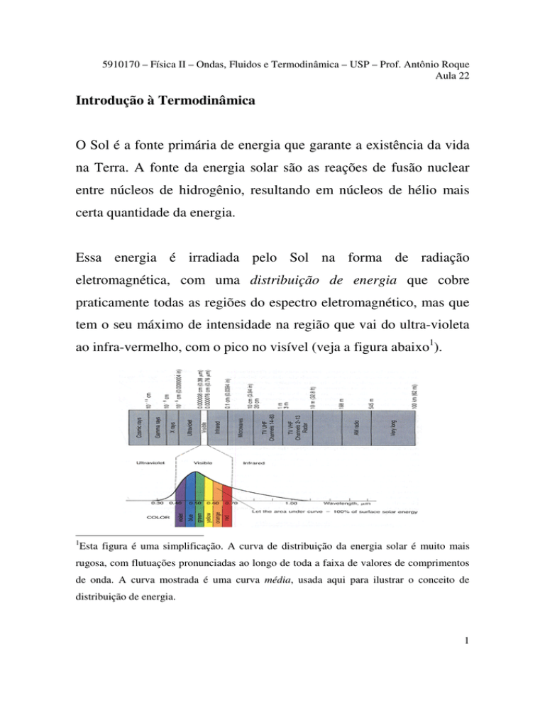 5910170 – Física II – Ondas, Fluidos e Termodinâmica – USP – Prof. Antônio Roque Aula 22 Introdução à Termodinâmica O Sol é a fonte primária de energia que garante a existência da vida na Terra. A fonte da energia solar são as reações de fusão nuclear entre núcleos de hidrogênio, resultando em núcleos de hélio mais certa quantidade da energia. Essa energia é irradiada pelo Sol na forma de radiação eletromagnética, com uma distribuição de energia que cobre praticamente todas as regiões do espectro eletromagnético, mas que tem o seu máximo de intensidade na região que vai do ultra-violeta ao infra-vermelho, com o pico no visível (veja a figura abaixo1). 1 Esta figura é uma simplificação. A curva de distribuição da energia solar é muito mais rugosa, com flutuações pronunciadas ao longo de toda a faixa de valores de comprimentos de onda. A curva mostrada é uma curva média, usada aqui para ilustrar o conceito de distribuição de energia. 1 5910170 – Física II – Ondas, Fluidos e Termodinâmica – USP – Prof. Antônio Roque Aula 22 A energia do Sol que chega à Terra (cerca de 1,7 x 1017 J.s-1) é capturada pelas plantas, bactérias fotossintéticas (cianobactérias) e pelo oceano. A parte absorvida pelas plantas corresponde, aproximadamente, a apenas 0,025% da energia solar total que chega à superfície da Terra. Quando uma molécula de clorofila de uma planta absorve um fóton, um dos seus elétrons ligados sofre uma transição para um nível de energia mais alta. O estado excitado não é estável e o elétron decai para o seu estado inicial. A energia liberada pelo elétron quando ele decai não é emitida como um fóton, mas é aproveitada pela planta que, em uma cadeia complexa de eventos, combina a energia com dióxido de carbono (CO2) e água (H2O) para produzir glicose (C6H12O6), oxigênio (O2) e calor. Desta forma, a energia produzida pela fusão nuclear no interior do Sol e transportada até a Terra na forma de radiação eletromagnética (fótons) é transformada em energia química e armazenada na forma de ligações químicas nas moléculas das plantas. Os animais se alimentam de plantas e de outros animais comedores de plantas para adquirir parte da energia armazenada nas moléculas das plantas para produzir suas próprias moléculas e manter suas 2 5910170 – Física II – Ondas, Fluidos e Termodinâmica – USP – Prof. Antônio Roque Aula 22 células funcionando. Os animais utilizam a energia adquirida pelo alimento para se locomover, respirar, controlar a temperatura corporal, manter seus órgãos e sistema imunológico funcionando, crescer, se reproduzir, etc. Cada um desses processos biológicos requer um grande número de reações bioquímicas complexas que tem por efeito a transformação da energia química armazenada nas moléculas em energia mecânica, elétrica, calor, etc. Existe um fluxo contínuo de energia (e matéria) entre as plantas e animais da Terra e seu meio-ambiente, incluindo o Sol e a atmosfera terrestre (e o resto do universo). A energia que chega à Terra vinda do Sol e das demais fontes cósmicas pode assumir diferentes formas durante esse fluxo, mas ela nunca é criada ou destruída, apenas transformada. A sua quantidade total permanece constante. Uma dada quantidade de energia pode ser distribuída de um grande número de maneiras entre os vários tipos de energia possíveis: energia gravitacional, energia cinética, energia térmica (calor), energia elástica, energia elétrica, energia química, energia radiante, energia nuclear e energia de massa. Em um dado momento, a quantidade de energia pode estar toda concentrada em apenas uma ou duas formas, como energia nuclear e 3 5910170 – Física II – Ondas, Fluidos e Termodinâmica – USP – Prof. Antônio Roque Aula 22 de massa, por exemplo, mas em outro momento ela pode estar distribuída por todas as formas. Em outro momento, a sua distribuição pode ser alterada e a maior parte dela pode estar nas formas cinética, elástica e química. Porém, em um momento posterior ela poderá se redistribuir novamente por todos os tipos. Esse processo continua indefinidamente, dependendo das interações entre os elementos constituintes do sistema. Porém, a quantidade total de energia sempre permanece a mesma. O que muda ao longo do tempo são as quantidades de energia em cada uma das suas formas específicas. A termodinâmica é a parte da física que estuda as transformações de energia e suas conseqüências. A palavra termodinâmica foi cunhada nos anos 1840 pelo físico escocês William Thomson (1824-1907), mais conhecido como Lord Kelvin, e é formada por duas palavras de origem grega: therme = calor, e dynamis = poder. Portanto, a termodinâmica é a ciência que estuda o poder, isto é, os efeitos do calor. 4 5910170 – Física II – Ondas, Fluidos e Termodinâmica – USP – Prof. Antônio Roque Aula 22 O conceito de calor está intimamente relacionado com o de temperatura, mas eles são conceitos distintos e é importante que se saiba diferenciar claramente o que cada um quer dizer. A temperatura depende do estado físico de um corpo e o seu valor indica se o corpo está quente ou frio. Já o calor, em física, indica a quantidade de energia que é transferida de um corpo para outro em função de uma diferença de temperatura entre eles. Portanto, o termo calor não é usado para indicar a quantidade de energia contida em um dado sistema, mas a energia que é transferida para ele, ou cedida por ele, quando ele fica em contato com outro corpo a uma temperatura diferente. Para entender melhor os conceitos modernos de calor e temperatura, é preciso reconhecer que a matéria é feita de átomos e moléculas em constante movimento. O movimento dos átomos e moléculas que constituem um material é chamado de movimento térmico. Podemos imaginar a soma de todas as energias associadas ao movimento térmico dos átomos e moléculas de