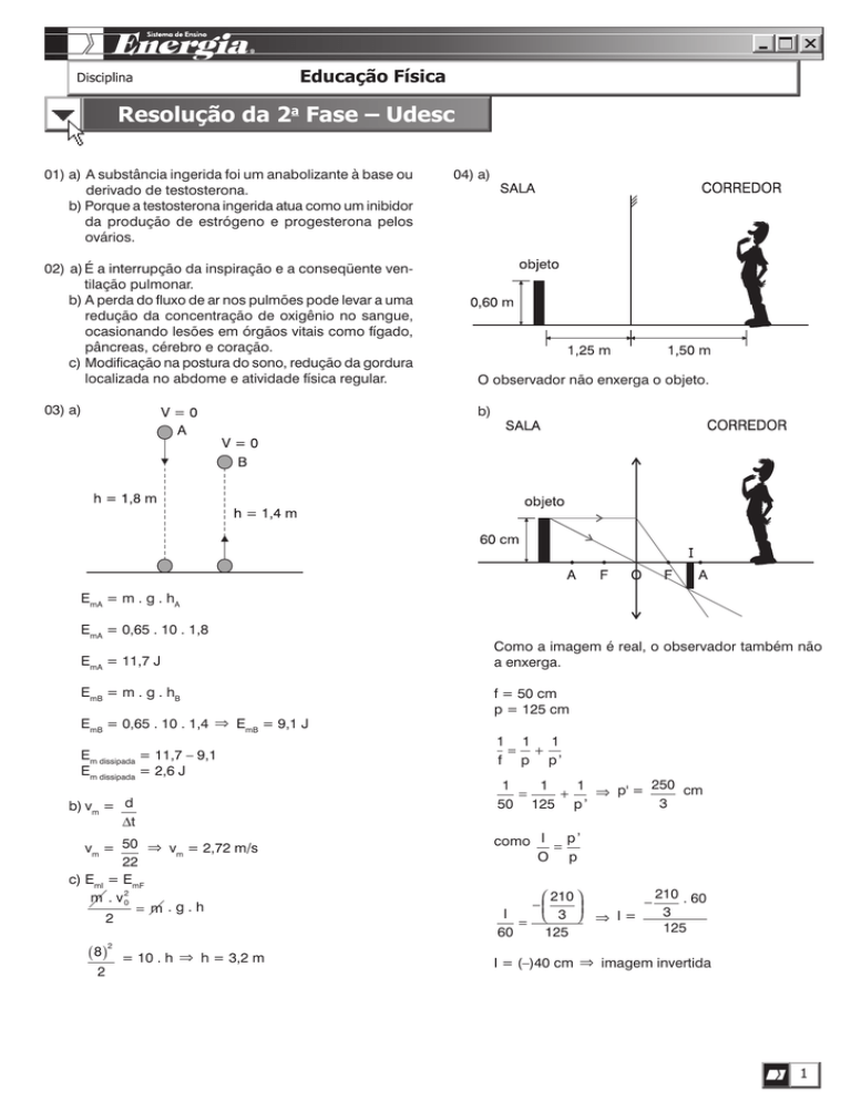 Educação Física Resolução da 2a Fase – Udesc 01)a)A substância ingerida foi um anabolizante à base ou derivado de testosterona. b)Porque a testosterona ingerida atua como um inibidor da produção de estrógeno e progesterona pelos ovários. 04)a) 02)a)É a interrupção da inspiração e a conseqüente ventilação pulmonar. b)A perda do fluxo de ar nos pulmões pode levar a uma redução da concentração de oxigênio no sangue, ocasionando lesões em órgãos vitais como fígado, pâncreas, cérebro e coração. c)Modificação na postura do sono, redução da gordura localizada no abdome e atividade física regular. O observador não enxerga o objeto. 03)a) b) EmA = m . g . hA EmA = 0,65 . 10 . 1,8 EmA = 11,7 J EmB = m . g . hB Em dissipada = 11,7 – 9,1 Em dissipada = 2,6 J EmB = 0,65 . 10 . 1,4 ⇒ EmB = 9,1 J b)vm = d ∆t vm = 50 ⇒ vm = 2,72 m/s 22 c) EmI = EmF m . v 20 = m .g.h 2 (8) 2 2 = 10 . h ⇒ h = 3,2 m Como a imagem é real, o observador também não a enxerga. f = 50 cm p = 125 cm 1 1 1 = + f p p’ 1 1 1 ⇒ p' = 250 cm = + 3 50 125 p ’ como I = p ’ O p 210 . 60 210 − − 3 I 3 ⇒ I = = 125 60 125 I = (–)40 cm ⇒ imagem invertida c) A imagem é virtual e formada na lente, logo, é vista pelo observador. A imagem é formada entre o foco e o centro óptico da lente. 05)a)N2 → nitrogênio → ligação covalente apolar O2 → oxigênio → ligação covalente apolar CO2 → dióxido de carbono → ligação covalente polar H2O → água → ligação covalente polar Ar → argônio → não apresenta ligação química, pois é uma substância simples, formada por unidades atômicas, c)Nitrogênio: Oxigênio: Dióxido de carbono: Água: Argônio: não é molécula b)Somente a água apresenta ligação (ponte) de hidrogênio. As pontes de hidrogênio são forças intermoleculares que ocorrem entre moléculas polares que possuem hidrogênio ligado aos elementos flúor, oxigênio e/ou nitrogênio. 06)a)Ferro (Fe) 4o período ou série ⇒ camada de valência: N Grupo ou família 8 ⇒ Metal de transição Cálcio (Ca) 4o período ou série ⇒ camada de valência: N Grupo ou família 2 (2A) ⇒ Metais alcalino-terrosos: 2 e– na camada de valência Níquel (Ni) 4o período ou série ⇒ camada de valência: N Grupo ou família 10 ⇒ Metal de transição externa Oxigênio (O) 2o período ou série ⇒ camada de valência: L Grupo ou família 16 (6A) ⇒ Calcogênios: 6 e– na camada de valência Silício (Si) 3o período ou série ⇒ camada de valência: M Grupo ou família 14 (4A) ⇒ Grupo do carbono: 4 e– na camada de valência Sódio (Na) 3o período ou série ⇒ camada de valência: M Grupo ou família 1 (1A) ⇒ Metais alcalinos: 1 e– na camada de valência Magnésio (Mg) 3o período ou série ⇒ camada de valência: M Grupo ou família 2 (2A) ⇒ Metais alcalino-terrosos Enxofre (S) 3o período ou série ⇒ camada de valência: M Grupo ou família 16 (6A) ⇒ Calcogênios: 6 e– na camada de valência Alumínio ( A ) 3o período ou série ⇒ camada de valência: M Grupo ou família 13 (3A) ⇒ Grupo do boro: 3 e– na camada de valência Titânio (Ti) 4o período ou série ⇒ camada de valência: N Grupo ou família 4 ⇒ Metal de transição b)Metais: magnésio, alumínio, cálcio, níquel, sódio e titânio Não-metais: oxigênio, enxofre c)Ferro Propriedades físicas: alto ponto de ebulição Propriedades químicas: facilidade para perder elétrons Cálcio Propriedades físicas: alto ponto de fusão Propriedades químicas: facilidade para perder elétrons Magnésio Propriedades físicas: alto ponto de fusão Propriedades químicas: alto potencial de oxidação Níquel Propriedades físicas: alto ponto de ebulição Oxigênio Propriedades físicas: baixo ponto de ebulição Propriedades químicas: alta capacidade para receber elétrons Sódio Propriedades físicas: alto ponto de fusão Propriedades químicas: alta reatividade Enxofre Propriedades físicas: sólido em condições ambiente Propriedades químicas: alta capacidade para receber elétrons Silício Propriedades físicas: alto ponto de fusão entre os não-metais Propriedades químicas: tetravalente, necessidade de quatro ligações Alumínio Propriedades físicas: alto ponto de ebulição Propriedades químicas: capacidade para fazer ligação iônica e covalente Titânio Propriedades físicas: alto ponto de fusão Propriedades químicas: alta eletropositividade, ou seja, facilidade para perder elétrons