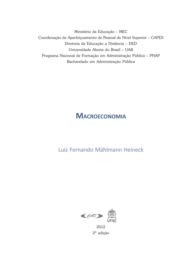 Ministério da Educação – MEC Coordenação de Aperfeiçoamento de Pessoal de Nível Superior – CAPES Diretoria de Educação a Distância – DED Universidade Aberta do Brasil – UAB Programa Nacional de Formação em Administração Pública – PNAP Bacharelado em Administração Pública MACROECONOMIA Luiz Fernando Mählmann Heineck 2012 2ª edição © 2012. Universidade Federal de Santa Catarina – UFSC. Todos os direitos reservados. A responsabilidade pelo conteúdo e imagens desta obra é do(s) respectivo(s) autor(es). O conteúdo desta obra foi licenciado temporária e gratuitamente para utilização no âmbito do Sistema Universidade Aberta do Brasil, através da UFSC. O leitor se compromete a utilizar o conteúdo desta obra para aprendizado pessoal, sendo que a reprodução e distribuição ficarão limitadas ao âmbito interno dos cursos. A citação desta obra em trabalhos acadêmicos e/ou profissionais poderá ser feita com indicação da fonte. A cópia desta obra sem autorização expressa ou com intuito de lucro constitui crime contra a propriedade intelectual, com sanções previstas no Código Penal, artigo 184, Parágrafos 1º ao 3º, sem prejuízo das sanções cíveis cabíveis à espécie. H468m Heineck, Luiz Fernando Mählmann Macroeconomia / Luiz Fernando Mahlmann Heineck. – 2. ed. reimp. – Florianópolis : Departamento de Ciências da Administração / UFSC, 2012. 258p. : il. Inclui bibliografia Bacharelado em Administração Pública ISBN: 978-85-7988-008-7 1. Macroeconomia. 2. História econômica. 3. Política monetária. 4. Educação a distância. I. Coordenação de Aperfeiçoamento de Pessoal de Nível Superior (Brasil). II. Universidade Aberta do Brasil. III. Título. CDU: 330.101.541 Catalogação na publicação por: Onélia Silva Guimarães CRB-14/071 PRESIDÊNCIA DA REPÚBLICA MINISTÉRIO DA EDUCAÇÃO COORDENAÇÃO DE APERFEIÇOAMENTO DE PESSOAL DE NÍVEL SUPERIOR – CAPES DIRETORIA DE EDUCAÇÃO A DISTÂNCIA DESENVOLVIMENTO DE RECURSOS DIDÁTICOS Universidade Federal de Santa Catarina METODOLOGIA PARA EDUCAÇÃO A DISTÂNCIA Universidade Federal de Mato Grosso AUTOR DO CONTEÚDO Luiz Fernando Mählmann Heineck EQUIPE TÉCNICA Coordenador do Projeto – Alexandre Marino Costa Coordenação de Produção de Recursos Didáticos – Denise Aparecida Bunn Capa – Alexandre Noronha Ilustração – Igor Baranenko Projeto Gráfico e Finalização – Annye Cristiny Tessaro Editoração – Rita Castelan Revisão Textual – Claudia Leal Estevão Brites Ramos Créditos da imagem da capa: extraída do banco de imagens Stock.xchng sob direitos livres para uso de imagem. SUMÁRIO Apresentação.................................................................................................... 9 Unidade 1 – Macroeconomia Introdução........................................................................................15 Definição de Macroeconomia............................................................................. 19 Um pouco de cinismo em relação à Macroeconomia....................................... 23 Uma última trincheira.......................................................................... 26 Problemas macroeconômicos fundamentais: uma lista curta e uma lista longa..... 29 Sucessos e fracassos macroeconômicos.......................................................32 Antecedentes da Macroeconomia.................................................................34 O reconhecimento da visão de mercado.............................................34 O funcionamento dos mecanismos de mercado............................................36 O surgimento da Macroeconomia Moderna – John Maynard Keynes...........40 Os condicionantes para o surgimento de uma nova disciplina no campo da Economia......................................................................................40 Um desdobramento importante: as curvas IS-LM...................................46 Unidade 2 – Contabilidade Nacional Introdução........................................................................................53 Fluxo circular da renda..................................................................................57 A ótica de mensuração do produto............................................................59 Os agregados macroeconômicos........................................................61 Identidades contábeis.............................................................................64 Economia fechada e sem governo..............................................................66 Economia fechada e com governo..............................................................67 Economia aberta e com governo..............................................................69 Sistema de Contas Nacionais................................................................71 Balanço de pagamentos........................................................................76 Unidade 3 – Oferta e Demanda Agregadas Introdução..........................................................................................85 Oferta agregada.......................................................................................86 Uma discussão sobre curto e longo prazo......................................................86 Formatos das curvas de oferta.......................................................................89 Deslocamentos e movimentos ao longo da curva de oferta........................97 A curva de oferta de curto prazo no entorno da curva de produto potencial de longo prazo.....................................................................................101 Demanda agregada............................................................................105 A curva de demanda...................................................................106 Deslocamentos da curva de demanda e movimentos ao longo da curva de demanda............................