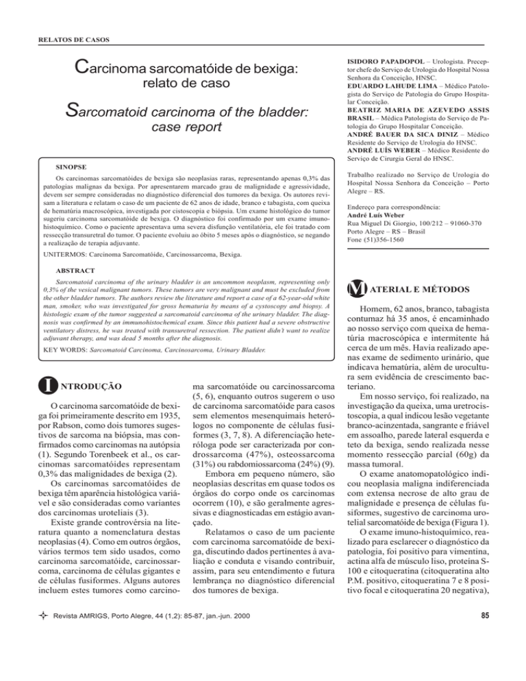 RELATOS DE CASOS Carcinoma sarcomatóide de bexiga: relato de caso Sarcomatoid carcinoma of the bladder: case report ISIDORO PAPADOPOL – Urologista. Preceptor chefe do Serviço de Urologia do Hospital Nossa Senhora da Conceição, HNSC. EDUARDO LAHUDE LIMA – Médico Patologista do Serviço de Patologia do Grupo Hospitalar Conceição. BEATRIZ MARIA DE AZEVEDO ASSIS BRASIL – Médica Patologista do Serviço de Patologia do Grupo Hospitalar Conceição. ANDRÉ BAUER DA SICA DINIZ – Médico Residente do Serviço de Urologia do HNSC. ANDRÉ LUÍS WEBER – Médico Residente do Serviço de Cirurgia Geral do HNSC. SINOPSE Os carcinomas sarcomatóides de bexiga são neoplasias raras, representando apenas 0,3% das patologias malignas da bexiga. Por apresentarem marcado grau de malignidade e agressividade, devem ser sempre consideradas no diagnóstico diferencial dos tumores da bexiga. Os autores revisam a literatura e relatam o caso de um paciente de 62 anos de idade, branco e tabagista, com queixa de hematúria macroscópica, investigada por cistoscopia e biópsia. Um exame histológico do tumor sugeriu carcinoma sarcomatóide de bexiga. O diagnóstico foi confirmado por um exame imunohistoquímico. Como o paciente apresentava uma severa disfunção ventilatória, ele foi tratado com ressecção transuretral do tumor. O paciente evoluiu ao óbito 5 meses após o diagnóstico, se negando a realização de terapia adjuvante. Trabalho realizado no Serviço de Urologia do Hospital Nossa Senhora da Conceição – Porto Alegre – RS. Endereço para correspondência: André Luís Weber Rua Miguel Di Giorgio, 100/212 – 91060-370 Porto Alegre – RS – Brasil Fone (51)356-1560 UNITERMOS: Carcinoma Sarcomatóide, Carcinossarcoma, Bexiga. ABSTRACT Sarcomatoid carcinoma of the urinary bladder is an uncommon neoplasm, representing only 0,3% of the vesical malignant tumors. These tumors are very malignant and must be excluded from the other bladder tumors. The authors review the literature and report a case of a 62-year-old white man, smoker, who was investigated for gross hematuria by means of a cystoscopy and biopsy. A histologic exam of the tumor suggested a sarcomatoid carcinoma of the urinary bladder. The diagnosis was confirmed by an immunohistochemical exam. Since this patient had a severe obstructive ventilatory distress, he was treated with transuretral ressection. The patient didn’t want to realize adjuvant therapy, and was dead 5 months after the diagnosis. KEY WORDS: Sarcomatoid Carcinoma, Carcinosarcoma, Urinary Bladder. I NTRODUÇÃO O carcinoma sarcomatóide de bexiga foi primeiramente descrito em 1935, por Rabson, como dois tumores sugestivos de sarcoma na biópsia, mas confirmados como carcinomas na autópsia (1). Segundo Torenbeek et al., os carcinomas sarcomatóides representam 0,3% das malignidades de bexiga (2). Os carcinomas sarcomatóides de bexiga têm aparência histológica variável e são consideradas como variantes dos carcinomas uroteliais (3). Existe grande controvérsia na literatura quanto a nomenclatura destas neoplasias (4). Como em outros órgãos, vários termos tem sido usados, como carcinoma sarcomatóide, carcinossarcoma, carcinoma de células gigantes e de células fusiformes. Alguns autores incluem estes tumores como carcino- ma sarcomatóide ou carcinossarcoma (5, 6), enquanto outros sugerem o uso de carcinoma sarcomatóide para casos sem elementos mesenquimais heterólogos no componente de células fusiformes (3, 7, 8). A diferenciação heteróloga pode ser caracterizada por condrossarcoma (47%), osteossarcoma (31%) ou rabdomiossarcoma (24%) (9). Embora em pequeno número, são neoplasias descritas em quase todos os órgãos do corpo onde os carcinomas ocorrem (10), e são geralmente agressivas e diagnosticadas em estágio avançado. Relatamos o caso de um paciente com carcinoma sarcomatóide de bexiga, discutindo dados pertinentes à avaliação e conduta e visando contribuir, assim, para seu entendimento e futura lembrança no diagnóstico diferencial dos tumores de bexiga. Revista AMRIGS, Porto Alegre, 44 (1,2): 85-87, jan.-jun. 2000 M ATERIAL E MÉTODOS Homem, 62 anos, branco, tabagista contumaz há 35 anos, é encaminhado ao nosso serviço com queixa de hematúria macroscópica e intermitente há cerca de um mês. Havia realizado apenas exame de sedimento urinário, que indicava hematúria, além de urocultura sem evidência de crescimento bacteriano. Em nosso serviço, foi realizado, na investigação da queixa, uma uretrocistoscopia, a qual indicou lesão vegetante branco-acinzentada, sangrante e friável em assoalho, parede lateral esquerda e teto da bexiga, sendo realizada nesse momento ressecção parcial (60g) da massa tumoral. O exame anatomopatológico indicou neoplasia maligna indiferenciada com extensa necrose de alto grau de malignidade e presença de células fusiformes, sugestivo de carcinoma urotelial sarcomatóide de bexiga (Figura 1). O exame imuno-histoquímico, realizado para esclarecer o diagnóstico da patologia, foi positivo para vimentina, actina alfa de músculo liso, proteína S100 e citoqueratina (citoqueratina alto P.M. positivo, citoqueratina 7 e 8 positivo focal e citoqueratina 20 negativa), 85 CARCINOMA SARCOMATÓIDE... Weber et al. RELATOS DE CASOS Figura 1 – Histologia do carcinoma sarcomatóide de bexiga, caracterizada por células fusiformes (HE, 40x). confirmando um perfil morfológico e imuno-histoquímico consistente com carcinoma sarcomatóide. Foi realizada, então, tomografia computadorizada, que demonstrou lesão vegetante, a qual causava espessamento e deformidade em parede lateral esquerda e posterior da bexiga, infiltrando gordura perivesical, vesícula seminal e canal deferente à esquerda. Não se observou alteração de calibre de ureteres ou linfonodomegalias. Foi feita também uma cintilografia óssea, sem evidência de lesões. Apesar da indicação de cistectomia radical, o paciente não pode s