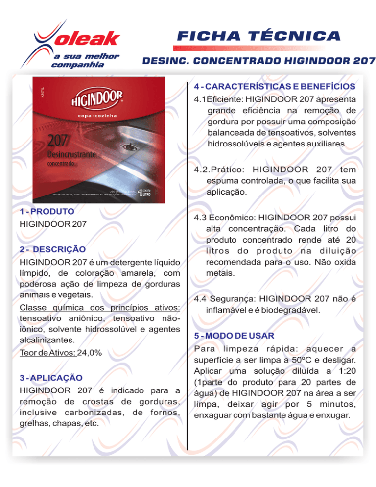 FICHA TÉCNICA DESINC. CONCENTRADO HIGINDOOR 207 H2071L 4 - CARACTERÍSTICAS E BENEFÍCIOS 207 Desincrustrante concentrado USO INSTITUCIONAL. ANTES DE USAR, LEIA ATENTAMENTE AS INSTRUÇÕES DO RÓTULO. 1 - PRODUTO HIGINDOOR 207 2 - DESCRIÇÃO HIGINDOOR 207 é um detergente líquido límpido, de coloração amarela, com poderosa ação de limpeza de gorduras animais e vegetais. Classe química dos princípios ativos: tensoativo aniônico, tensoativo nãoiônico, solvente hidrossolúvel e agentes alcalinizantes. Teor de Ativos: 24,0% 3 - APLICAÇÃO HIGINDOOR 207 é indicado para a remoção de crostas de gorduras, inclusive carbonizadas, de fornos, grelhas, chapas, etc. 4.1Eficiente: HIGINDOOR 207 apresenta grande eficiência na remoção de gordura por possuir uma composição balanceada de tensoativos, solventes hidrossolúveis e agentes auxiliares. 4.2.Prático: HIGINDOOR 207 tem espuma controlada, o que facilita sua aplicação. 4.3 Econômico: HIGINDOOR 207 possui alta concentração. Cada litro do produto concentrado rende até 20 litros do produto na diluição recomendada para o uso. Não oxida metais. 4.4 Segurança: HIGINDOOR 207 não é inflamável e é biodegradável. 5 - MODO DE USAR Para limpeza rápida: aquecer a superfície a ser limpa a 50ºC e desligar. Aplicar uma solução diluída a 1:20 (1parte do produto para 20 partes de água) de HIGINDOOR 207 na área a ser limpa, deixar agir por 5 minutos, enxaguar com bastante água e enxugar. Para limpeza profunda: aquecer a peça a 70ºC e desligar. Aplicar uma solução diluída a 1:20 (1parte do produto para 20 partes de água) de HIGINDOOR 207 na área a ser limpa, deixar agir de 15 minutos à 1 hora. Enxaguar com bastante água e enxugar. Para limpeza em superfícies especiais ou utensílios muito impregnados, fazer teste com HIGINDOOR 207, em diluições diferentes, para saber em qual diluição o produto deve ser utilizado. 7 - ANÁLISES TÍPICAS - Cor ................................amarela - Odor característico ........glicólico - Dens. a 20/4°C (g/cm³)...1,035 a 1,045 - pH do produto puro ........11,5 a 12,5 8 - COMPOSIÇÃO ! Nonilfenol etoxilado 9,5 MOE; ! Butilglicol; ! Ácido dodecilbenzeno sulfônico; ! EDTA tetrassódico;; ! Hidróxido de sódio; ! Conservante; 6 - MANUSEIO E ESTOCAGEM ! Corante CI19140; - Manter a embalagem sempre bem fechada; ! Água. - Evitar estocar sob temperaturas elevadas e em presença de luz; 9 - APRESENTAÇÃO - Não reutilizar a embalagem vazia; - Enxaguar bem as mãos após o uso; - Em caso de contato com os olhos, lavá-los com água em abundância; - Em caso de ingestão, não provocar o vômito. Consultar o centro de intoxicações ou serviço de saúde (0xx11 50115111) mais próximo; ! Caixas contendo 12 frascos plásticos com 1 litro cada. 11 - REGISTRO E DOCUMENTAÇÃO • Produto notificado na ANVISA/MS. • Ficha de segurança - MSDS (Material Safety Data Sheet) disponível. - Evite o contato do produto com superfícies pigmentadas, como roupas coloridas, pois o cloro é um oxidante forte e pode danificá-las. Oleak Indústria e Comércio Ltda Rua Rondônia, 186 - Cotia - SP - CEP 06703.710 - Fax: (11) 4616.0138 [email protected] tel: (11) 4616.0855
