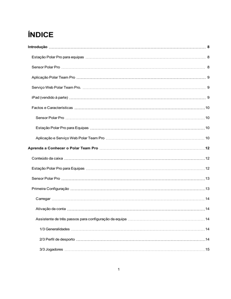 ÍNDICE Introdução 8 Estação Polar Pro para equipas 8 Sensor Polar Pro 8 Aplicação Polar Team Pro 9 Serviço Web Polar Team Pro. 9 iPad (vendido à parte) 9 Factos e Características 10 Sensor Polar Pro 10 Estação Polar Pro para Equipas 10 Aplicação e Serviço Web Polar Team Pro 10 Aprenda a Conhecer o Polar Team Pro 12 Conteúdo da caixa 12 Estação Polar Pro para Equipas 12 Sensor Polar Pro 13 Primeira Configuração 13 Carregar 14 Ativação da conta 14 Assistente de três passos para configuração da equipa 14 1/3 Generalidades 14 2/3 Perfil de desporto 14 3/3 Jogadores 15 1 Transferir a aplicação Polar Team Pro para o seu iPad Carregamento 15 15 Carregar a Estação Polar Pro para equipas 15 Carregar os Sensores Polar Pro 16 Atualizar o Firmware 16 Como atualizar o firmware 16 Atualizar dados 16 Idiomas 16 Navegação 16 Serviço Web Polar Team Pro. 16 Atividades 17 Relatórios 17 Aplicação Polar Team Pro 17 Página inicial da equipa 17 Jogadores 18 Sensores e estação 18 Iniciar sessão 18 Manual do utilizador 18 Definições da organização 19 Editar as definições da organização 19 Adicionar treinador à organização 19 Adicionar treinador já existente à equipa 19 Definições da equipa 19 2 Editar definições da equipa 20 Adicionar treinador à equipa 20 Adicionar um novo jogador à equipa 20 Adicionar um jogador existente à equipa 20 Editar definições de um jogador 21 Definições do perfil 21 Editar as definições do perfil 21 Colocar o sensor Polar Pro 22 Iniciar a sessão de treino 23 Visualizar dados em direto 23 Ver dados detalhados de um jogador 24 Sugestões 24 Adicionar marcadores 25 Adicionar marcador de equipa 25 Adicionar marcador de jogador 25 Comparar Jogadores 25 Adicionar jogador à vista comparação 25 Libertar um jogador da comparação 25 Libertar todos os jogadores da comparação 25 Terminar a sessão de treino 26 Terminar a sessão de treino e guardar 26 Terminar a sessão de treino e eliminar 26 Sincronizar dados dos sensores com o serviço Web através da estação 3 27 Sincronizar informação 27 Dados não sincronizados 27 Analisar dados na aplicação Team Pro 27 Editar a hora do início ou do fim da sessão 28 Resumo 28 Ordenar jogadores 28 Vista resumo da sessão do jogador 28 Análise 28 Comparar dados de um jogador com a média da equipa 28 Comparar dois jogadores entre si 28 Ver marcadores 28 Editar marcadores 28 Mapa térmico 29 Criar campo de treino para mapa térmico 29 Analisar dados no serviço Web Team Pro 29 Vista resumo 29 Vista análise 30 Adicionar marcador 30 Ver marcador 30 Exportar dados 30 Exportar dados da sessão 30 Exportar dados não processados dos jogadores 31 Relatórios 31 4 Gerar um relatório 31 Criar um modelo personalizado de relatório 32 Guardar o modelo de relatório 32 Remover um modelo 32 Comparação 32 Comparar Jogadores 32 Comparar dados específicos de uma fase 33 Fazer zoom na vista de comparação 33 Cortar 33 Cortar a sessão 33 Fases 33 Adicionar fase 33 Ver dados da fase 34 Zonas de frequência cardíaca Polar 35 Editar zonas de frequência cardíaca 35 Treino individual 37 Conta Flow individual e dispositivo Polar 37 Guia Como Começar para o Treinador 38 Guia Como Começar para o Jogador 39 1. Leia o Guia Como Começar do seu dispositivo 39 2. Sincronize o seu dispositivo Polar diariamente 39 Vista Mês do Calendário de Jogador Individual Team Pro 40 Vista Dia do Calendário de Jogador Individual Team Pro 42 5 Desassociar a Conta Flow Individual de um Jogador do Serviço Web Polar Team Pro Zonas de velocidade Polar 42 43 Editar zonas de velocidade 43 Sprints 43 Limiar de sprint 44 Carga de treino 44 Pontuação da Carga de Treino 45 Cuidados a ter com a sua Solução Polar Team Pro 46 Sensor Polar Pro 46 Tiras elásticas: 46 Estação Polar Pro 46 Especificações técnicas 46 Sensor Polar Pro 46 Estação Polar Pro para Equipas 47 Informações importantes sobre segurança 47 Dispositivos alimentados por corrente alternada (CA) 47 Dispositivos alimentados por baterias 48 Dispositivos sem fios 48 Todos os dispositivos 48 Perigo de asfixia 48 Informações referentes à regulamentação 49 Estação Polar Pro para Equipas 49 Declaração de Conformidade 49 6 Canadá 49 EUA 49 Informações referentes à regulamentação FCC 50 Sensor Polar Pro 50 Declaração de Conformidade 50 Canadá 50 EUA 51 Precauções 52 Interferências durante o treino 52 Minimizar riscos durante o treino 52 Garantia limitada internacional Polar 53 Termo de responsabilidade 55 7 INTRODUÇÃO Obrigado por escolher a Polar! Neste manual do utilizador, vamos orientá-lo nos aspetos básicos da utilização e cuidados a ter com a solução de treino Polar Team Pro, concebida para a monitorização e análise do desempenho em desporto de equipas de qualidade superior. Devido ao desenvolvimento contínuo, este manual do utilizador é atualizado sempre que ficam disponíveis novas versões de software/firmware. A versão mais recente do manual do utilizador está disponível em www.polar.com/support. No serviço Web e aplicação Polar Team Pro também estão disponíveis links para este manual. ESTAÇÃO POLAR PRO PARA EQUIPAS A estação é utilizada para carregar sensores Polar Pro e para sincronizar dados de treino entre estes e a aplicação e o serviço Web Polar Team Pro. Também serve de base e carregador para o seu iPad®. SENSOR POLAR PRO O sensor Polar Pro mede dados abrangentes do desempenho dos jogadores, regista-os detalhadamente e envia-os em tempo real para um iPad®, via Bluetooth® Smart, permitindo-lhe um acesso imediato aos dados durante o treino. Depois de cada sessão de treino, coloque o sensor na estação Polar Pro para equipas, para carregar e sincronizar os dados com a aplicação Polar Team Pro iPad e com o serviço Web, para permitir uma análise mais detalhada. 8 APLICAÇÃO POLAR TEAM PRO Visualize um vasto número de dados chave do desempenho em tempo real. Compare jogadores e 
