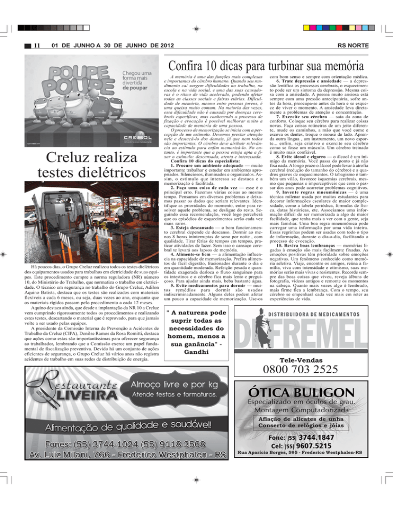 11 01 DE JUNHO A 30 DE JUNHO DE 2012 RS NORTE Confira 10 dicas para turbinar sua memória Creluz realiza testes dielétricos Há poucos dias, o Grupo Creluz realizou todos os testes dielétricos dos equipamentos usados para trabalhos em eletricidade de suas equipes. Este procedimento cumpre a norma reguladora (NR) número 10, do Ministério do Trabalho, que normatiza o trabalho em eletricidade. O técnico em segurança no trabalho do Grupo Creluz, Adilon Aquino Batista, destaca que os testes são realizados com materiais flexíveis a cada 6 meses, ou seja, duas vezes ao ano, enquanto que os materiais rígidos passam pelo procedimento a cada 12 meses. Aquino destaca ainda, que desde a implantação da NR 10 a Creluz vem cumprindo rigorosamente todos os procedimentos e realizando estes testes, descartando o material que é reprovado, para que jamais volte a ser usado pelas equipes. A presidente da Comissão Interna de Prevenção a Acidentes de Trabalho da Creluz (CIPA), Denilse Ramos da Rosa Romitti, destaca que ações como estas são importantíssimas para oferecer segurança ao trabalhador, lembrando que a Comissão exerce um papel fundamental de fiscalização preventiva. Devido há um conjunto de ações eficientes de segurança, o Grupo Creluz há vários anos não registra acidentes de trabalho em suas redes de distribuição de energia. A memória é uma das funções mais complexas e importantes do cérebro humano. Quando seu rendimento cai surgem dificuldades no trabalho, na escola e na vida social, e uma das suas causadoras é o ritmo de vida acelerado, podendo afetar todas as classes sociais e faixas etárias. Dificuldade de memória, mesmo entre pessoas jovens, é uma queixa muito comum. Na maioria das vezes, essa dificuldade não é causada por doenças cerebrais específicas, mas conhecendo o processo de fixação e evocação é possível melhorar muito a capacidade de memória de uma pessoa. O processo de memorização se inicia com a percepção de um estímulo. Devemos prestar atenção nele e destacá-lo dos demais, já que nem todos são importantes. O cérebro deve atribuir relevância ao estímulo para enfim memorizá-lo. No entanto, é importante que a pessoa esteja apta a fixar o estímulo: descansada, atenta e interessada. Confira 10 dicas do especialista: 1. Procure um ambiente adequado — muito importante trabalhar e estudar em ambientes apropriados. Silenciosos, iluminados e organizados. Assim, o estímulo que interessa se destaca e a memorização é facilitada. 2. Faça uma coisa de cada vez — esse é o principal erro. Fazemos várias coisas ao mesmo tempo. Pensamos em diversos problemas e deixamos passar os dados que seriam relevantes. Identifique as prioridades do momento, entre para resolver aquele problema, se desligue do resto. Seguindo essa recomendação, você logo perceberá que os episódios de esquecimentos serão cada vez mais raros. 3. Esteja descansado — o bom funcionamento cerebral depende de descanso. Dormir ao menos 8 horas ininterruptas de sono por noite , com qualidade. Tirar férias de tempos em tempos, praticar atividades de lazer. Sem isso o cansaço cerebral te levará aos lapsos de memória. 4. Alimente-se bem — a alimentação influencia na capacidade de memorização. Prefira alimentos de fácil digestão, fracionados durante o dia e em quantidade moderada. Refeição pesada e quantidade exagerada desloca o fluxo sanguíneo para os intestinos e o cérebro fica mais lento e preguiçoso. Para ajudar ainda mais, beba bastante água. 5. Evite medicamentos para dormir — muitos remédios para dormir são usados indiscriminadamente. Alguns deles podem afetar um pouco a capacidade de memorização. Use-os com bom senso e sempre com orientação médica. 6. Trate depressão e ansiedade — a depressão lentifica os processos cerebrais, o esquecimento pode ser um sintoma da depressão. Mesma coisa com a ansiedade. A pessoa muito ansiosa está sempre com uma pressão antecipatória, sofre antes da hora, preocupa-se antes da hora e se esquece de viver o momento. A ansiedade leva diretamente a problemas de atenção e concentração. 7. Exercite seu cérebro — saia da zona de conforto. Coloque seu cérebro para realizar coisas novas. Faça coisas rotineiras de um jeito diferente, mude os caminhos, a mão que você come e escova os dentes, troque o mouse de lado. Aprenda outra língua , um instrumento, um novo esporte... enfim, seja criativo e exercite seu cérebro como se fosse um músculo. Um cérebro treinado é muito mais confiável. 8. Evite álcool e cigarro — o álcool é um inimigo da memória. Você passa do ponto e já não fixa nada. A longo prazo o álcool pode levar à atrofia cerebral (redução do tamanho do cérebro) e a quadros graves de esquecimentos. O tabagismo é também um vilão, favorece isquemias cerebrais, mesmo que pequenas e imperceptíveis que com o passar dos anos pode acarretar problemas cognitivos. 9. Invente regras mneumônicas — é uma técnica milenar usada por muitos estudantes para decorar informações escolares de maior complexidade, como a tabela periódica, formulas de física, datas históricas, etc. Associamos uma informação difícil de ser memorizada a algo de maior facilidade, que tenha mais a ver com a gente, seja mais familiar. Uma boa regra mneumônica pode carregar uma informação por uma vida inteira. Essas regrinhas podem ser usadas com todo o tipo de informação, durante o dia-a-dia, facilitando o processo de evocação. 10. Reviva boas lembranças — memórias ligadas à emoção são mais facilmente fixadas. As emoções positivas têm prioridade sobre emoções negativas. Um fenômeno conhecido como memória seletiva. Viaje, encontre os amigos, reúna a família, viva com intensidade e otimismo, suas memórias serão mais vivas e resistentes. Recorde sempre das boas coisas que viveu, reveja álbuns de fotografia, vídeos antigos e remonte os momentos na cabeça. Quanto mai