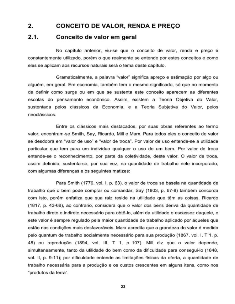 2. CONCEITO DE VALOR, RENDA E PREÇO 2.1. Conceito de valor em geral No capítulo anterior, viu-se que o conceito de valor, renda e preço é constantemente utilizado, porém o que realmente se entende por estes conceitos e como eles se aplicam aos recursos naturais será o tema deste capítulo. Gramaticalmente, a palavra “valor” significa apreço e estimação por algo ou alguém, em geral. Em economia, também tem o mesmo significado, só que no momento de definir como surge ou em que se sustenta este conceito aparecem as diferentes escolas do pensamento econômico. Assim, existem a Teoria Objetiva do Valor, sustentada pelos clássicos da Economia, e a Teoria Subjetiva do Valor, pelos neoclássicos. Entre os clássicos mais destacados, por suas obras referentes ao termo valor, encontram-se Smith, Say, Ricardo, Mill e Marx. Para todos eles o conceito de valor se desdobra em “valor de uso” e “valor de troca”. Por valor de uso entende-se a utilidade particular que tem para um indivíduo qualquer o uso de um bem. Por valor de troca entende-se o reconhecimento, por parte da coletividade, deste valor. O valor de troca, assim definido, sustenta-se, por sua vez, na quantidade de trabalho nele incorporado, com algumas diferenças e os seguintes matizes: Para Smith (1776, vol. I, p. 63), o valor de troca se baseia na quantidade de trabalho que o bem pode comprar ou comandar. Say (1803, p. 67-8) também concorda com isto, porém enfatiza que sua raiz reside na utilidade que têm as coisas. Ricardo (1817, p. 43-68), ao contrário, considera que o valor dos bens deriva da quantidade de trabalho direto e indireto necessário para obtê-lo, além da utilidade e escassez daquele, e este valor é sempre regulado pela maior quantidade de trabalho aplicado por aqueles que estão nas condições mais desfavoráveis. Marx acredita que a grandeza do valor é medida pelo quantum de trabalho socialmente necessário para sua produção (1867, vol. I, T 1, p. 48) ou reprodução (1894, vol. III, T 1, p. 107). Mill diz que o valor depende, simultaneamente, tanto da utilidade do bem como da dificuldade para consegui-lo (1848, vol. II, p. 9-11); por dificuldade entende as limitações físicas da oferta, a quantidade de trabalho necessária para a produção e os custos crescentes em alguns itens, como nos “produtos da terra”. 23 Entre os neoclássicos analisados estão Jevons, Menger, Böhm-Bawerk, Marshall e Wicksell. Em geral, para todos eles o valor é um conceito subjetivo e abstrato a respeito da importância que os bens têm para os indivíduos, e neste sentido o valor de troca de um bem depende da utilidade marginal do bem, que, por sua vez, sustenta-se na sua utilidade e escassez, sendo que o trabalho necessário para elaborar um bem não é decisivo na determinação de seu valor, embora cada autor tenha também suas particularidades adicionais. Jevons (1871, p. 66-4) enfatiza que o valor de troca expressa unicamente uma relação entre as quantidades dos bens trocados, e que esta relação será correspondente à utilidade marginal (“grau final de utilidade”) dos bens disponíveis para o consumo. Menger (1871, p. 285) considera que só os bens econômicos (demanda maior que a oferta) têm valor e que existem bens não econômicos (demanda menor que a oferta) que não têm valor. Böhm-Bawerk (1889) indica que quando um bem tem várias possibilidades de consumo final, seu valor é fixado por aqueles que lhe dão maior utilidade marginal (p. 180), e quando se trata de um insumo, seu valor é igual àquele bem final, de menor utilidade marginal, que é sacrificado para poder se elaborar este bem (p. 194). Marshall (1890, vol. II, p. 35-65) assinala que, a curto prazo, a procura determina o valor e, a longo prazo, são os custos de produção, e que no caso das matérias-primas seu valor é derivado do produto final em que eles participam. Para Wicksell (1911, p. 3145), o valor de troca de um bem em particular é função de sua utilidade marginal correspondente, e que este valor de troca deve ser fixado num nível em que se igualem o desejo por consumir este bem (utilidade) e a dificuldade existente para produzi-lo (utilidade negativa ou desutilidade). Em equilíbrio, a utilidade marginal do bem adquirido deve ser igual à utilidade marginal do bem cedido. Dentro do pensamento dos neoclássicos, outros economistas posteriores concordam que o valor é resultado da interação simultânea do comportamento de todos os agentes consumidores e produtores da economia, os quais, dentro de um ambiente concorrencial, conduzem ao equilíbrio geral, continuamente, e estão interagindo para definir o valor de cada um dos bens e as trocas correspondentes. Esta escola, chamada do equilíbrio geral, exige uma série de axiomas e hipóteses, próprias de uma economia concorrencial, e o valor é formulado numa linguagem formalizada (matemática). Entre estes economistas encontram-se Walras (1874), Pareto (1909), Hicks (1939), Samuelson (1945) e Debreu (1959). 24 Existem alguns itens de concordância sobre o valor entre os clássicos e os neoclássicos. Assim, por exemplo, os clássicos afirmam, de uma ou outra forma, que são os custos de produção (trabalho) os que definem o valor dos bens. Existem também, neoclássicos que aceitam parcialmente esta tese, tais como Jevons (p. 106), BöhmBawerk (vol. I, p. 192-6), Wicksell (p. 20), Walras (p. 107), Hicks (p. 73) e Samuelson (p. 85). Mais ainda, no caso dos bens de capital, Robinson afirma que eles podem ser avaliados tanto por seu custo de produção, como por seu poder de compra ou pelos retornos futuros que estes oferecem; numa situação de equilíbrio, os três resultados são equivalentes. 10 Percebe-se, então, como este conceito de valor é bastante discutível e dificilmente encontra-se consenso entre todas as escolas. Alguns autores utilizam a noção de utilidade dos objetos e os sacrifícios efetuados para se ter acesso a eles, conforme cita