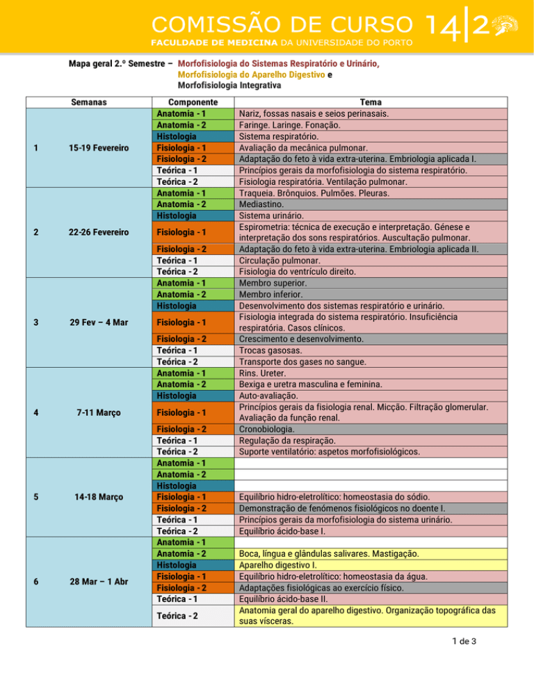 Mapa geral 2.º Semestre – Morfofisiologia do Sistemas Respiratório e Urinário, Morfofisiologia do Aparelho Digestivo e Morfofisiologia Integrativa Semanas 1 15-19 Fevereiro 2 22-26 Fevereiro Componente Anatomia - 1 Anatomia - 2 Histologia Fisiologia - 1 Fisiologia - 2 Teórica - 1 Teórica - 2 Anatomia - 1 Anatomia - 2 Histologia Fisiologia - 1 Fisiologia - 2 Teórica - 1 Teórica - 2 Anatomia - 1 Anatomia - 2 Histologia 3 29 Fev – 4 Mar Fisiologia - 1 Fisiologia - 2 Teórica - 1 Teórica - 2 Anatomia - 1 Anatomia - 2 Histologia 4 5 6 7-11 Março 14-18 Março 28 Mar – 1 Abr Fisiologia - 1 Fisiologia - 2 Teórica - 1 Teórica - 2 Anatomia - 1 Anatomia - 2 Histologia Fisiologia - 1 Fisiologia - 2 Teórica - 1 Teórica - 2 Anatomia - 1 Anatomia - 2 Histologia Fisiologia - 1 Fisiologia - 2 Teórica - 1 Teórica - 2 Tema Nariz, fossas nasais e seios perinasais. Faringe. Laringe. Fonação. Sistema respiratório. Avaliação da mecânica pulmonar. Adaptação do feto à vida extra-uterina. Embriologia aplicada I. Princípios gerais da morfofisiologia do sistema respiratório. Fisiologia respiratória. Ventilação pulmonar. Traqueia. Brônquios. Pulmões. Pleuras. Mediastino. Sistema urinário. Espirometria: técnica de execução e interpretação. Génese e interpretação dos sons respiratórios. Auscultação pulmonar. Adaptação do feto à vida extra-uterina. Embriologia aplicada II. Circulação pulmonar. Fisiologia do ventrículo direito. Membro superior. Membro inferior. Desenvolvimento dos sistemas respiratório e urinário. Fisiologia integrada do sistema respiratório. Insuficiência respiratória. Casos clínicos. Crescimento e desenvolvimento. Trocas gasosas. Transporte dos gases no sangue. Rins. Ureter. Bexiga e uretra masculina e feminina. Auto-avaliação. Princípios gerais da fisiologia renal. Micção. Filtração glomerular. Avaliação da função renal. Cronobiologia. Regulação da respiração. Suporte ventilatório: aspetos morfofisiológicos. Equilíbrio hidro-eletrolítico: homeostasia do sódio. Demonstração de fenómenos fisiológicos no doente I. Princípios gerais da morfofisiologia do sistema urinário. Equilíbrio ácido-base I. Boca, língua e glândulas salivares. Mastigação. Aparelho digestivo I. Equilíbrio hidro-eletrolítico: homeostasia da água. Adaptações fisiológicas ao exercício físico. Equilíbrio ácido-base II. Anatomia geral do aparelho digestivo. Organização topográfica das suas vísceras. 1 de 3 Anatomia - 1 Anatomia - 2 Histologia 7 4-8 Abril Fisiologia - 1 Fisiologia - 2 8 9 11-15 Abril 18-22 Abril Teórica - 1 Teórica - 2 Anatomia - 1 Anatomia - 2 Histologia Fisiologia - 1 Fisiologia - 2 Teórica - 1 Teórica - 2 Anatomia - 1 Anatomia - 2 Histologia Fisiologia - 1 Fisiologia - 2 Teórica - 1 Teórica - 2 Anatomia - 1 Anatomia - 2 Histologia 10 11 25-29 Abril 9-13 Maio Fisiologia - 1 Fisiologia - 2 Teórica - 1 Teórica - 2 Anatomia - 1 Anatomia - 2 Histologia Fisiologia - 1 Fisiologia - 2 Teórica - 1 Teórica - 2 Anatomia - 1 Anatomia - 2 Histologia 12 16-20 Maio Fisiologia - 1 Fisiologia - 2 Teórica - 1 Teórica - 2 Faringe e esófago. Deglutição. Face. Fossas temporal, infratemporal e pterigopalatina. Aparelho digestivo II. Fisiologia ácido-base. Compensação de distúrbios ácido-base. Regulação do pH intracelular. Fisiologia digestiva - introdução. Regulação neuroendócrina da motilidade e secreções gastrointestinais. Fisiologia do aparelho estomatognático. Mastigação e deglutição. Região anterolateral do pescoço. Estômago. Intestino Delgado. Intestino Grosso. Glândulas anexas ao aparelho digestivo. Equilíbrio ácido-base: casos clínicos. Fisiologia esofagogástrica. Fígado e vias biliares. Pâncreas e canais pancreáticos. Desenvolvimento do aparelho digestivo. Equilíbrio do potássio, fósforo e cálcio. Equilíbrio fosfocálcio. Intestino delgado. Cólon e defecação. Transporte intestinal de água e eletrólitos. Imagiologia do tubo digestivo. Irrigação arterial das vísceras abdominais. Sistema porta-hepático. Anatomia geral do peritoneu. Auto-avaliação. Fisiologia integrada do sistema urinário. Insuficiência renal. Casos clínicos. Digestão e absorção de nutrientes I: glícidos e proteínas. Patologia gastrointestinal: principais aspetos fisiopatológicos. Abdómen I. Abdómen II. Pele e anexos. Adaptações fisiológicas à altitude e submersão. Digestão e absorção de nutrientes II - lipídeos, vitaminas e outros nutrientes. Seminário – Envelhecimento dos Tecidos. Peritoneu pélvico masculino e feminino. Região retroperitoneal. Peritoneu pélvico masculino e feminino. Órgãos hematopoiéticos. Fisiologia integrativa cardiovascular, respiratória e renal: casos clínicos. Fisiologia hepática e das vias biliares. 2 de 3 Anatomia - 1 Anatomia - 2 Histologia 13 14 23-27 Maio 30 Mai – 3 Jun Fisiologia - 1 Fisiologia - 2 Teórica - 1 Teórica - 2 Anatomia - 1 Anatomia - 2 Histologia Fisiologia - 1 Fisiologia - 2 Teórica - 1 Teórica - 2 Pelve e períneo. Sistema linfático. Desenvolvimento pré-natal. Princípios fisiológicos subjacentes à substituição médica de funções vitais. Fisiologia do pâncreas exócrino. Fisiologia da secreção salivar. Revisões. Dor. Demonstração de fenómenos fisiológicos no doente. Fisiologia integrada do aparelho digestivo - casos problema. 3 de 3