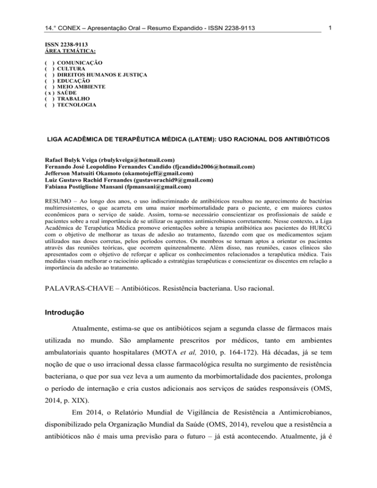 14.° CONEX – Apresentação Oral – Resumo Expandido - ISSN 2238-9113 1 ISSN 2238-9113 ÁREA TEMÁTICA: ( ) ( ) ( ) ( ) ( ) (x) ( ) ( ) COMUNICAÇÃO CULTURA DIREITOS HUMANOS E JUSTIÇA EDUCAÇÃO MEIO AMBIENTE SAÚDE TRABALHO TECNOLOGIA LIGA ACADÊMICA DE TERAPÊUTICA MÉDICA (LATEM): USO RACIONAL DOS ANTIBIÓTICOS Rafael Bulyk Veiga ([email protected]) Fernando José Leopoldino Fernandes Candido ([email protected]) Jefferson Matsuiti Okamoto ([email protected]) Luiz Gustavo Rachid Fernandes ([email protected]) Fabiana Postiglione Mansani ([email protected]) RESUMO – Ao longo dos anos, o uso indiscriminado de antibióticos resultou no aparecimento de bactérias multirresistentes, o que acarreta em uma maior morbimortalidade para o paciente, e em maiores custos econômicos para o serviço de saúde. Assim, torna-se necessário conscientizar os profissionais de saúde e pacientes sobre a real importância de se utilizar os agentes antimicrobianos corretamente. Nesse contexto, a Liga Acadêmica de Terapêutica Médica promove orientações sobre a terapia antibiótica aos pacientes do HURCG com o objetivo de melhorar as taxas de adesão ao tratamento, fazendo com que os medicamentos sejam utilizados nas doses corretas, pelos períodos corretos. Os membros se tornam aptos a orientar os pacientes através das reuniões teóricas, que ocorrem quinzenalmente. Além disso, nas reuniões, casos clínicos são apresentados com o objetivo de reforçar e aplicar os conhecimentos relacionados a terapêutica médica. Tais medidas visam melhorar o raciocínio aplicado a estratégias terapêuticas e conscientizar os discentes em relação a importância da adesão ao tratamento. PALAVRAS-CHAVE – Antibióticos. Resistência bacteriana. Uso racional. Introdução Atualmente, estima-se que os antibióticos sejam a segunda classe de fármacos mais utilizada no mundo. São amplamente prescritos por médicos, tanto em ambientes ambulatoriais quanto hospitalares (MOTA et al, 2010, p. 164-172). Há décadas, já se tem noção de que o uso irracional dessa classe farmacológica resulta no surgimento de resistência bacteriana, o que por sua vez leva a um aumento da morbimortalidade dos pacientes, prolonga o período de internação e cria custos adicionais aos serviços de saúdes responsáveis (OMS, 2014, p. XIX). Em 2014, o Relatório Mundial de Vigilância de Resistência a Antimicrobianos, disponibilizado pela Organização Mundial da Saúde (OMS, 2014), revelou que a resistência a antibióticos não é mais uma previsão para o futuro – já está acontecendo. Atualmente, já é 14.° CONEX – Apresentação Oral – Resumo Expandido - ISSN 2238-9113 possível encontrar bactérias comunitárias, em infecções 2 urinárias, pneumonias, hematológicas, dentre outras, com diversos mecanismos de resistência a agentes antimicrobianos. A resistência bacteriana decorre do uso indiscriminado de antibióticos ao longo de vários anos. Esse uso indiscriminado, por sua vez, decorre de diversos outros fatores. Dentre esses fatores, podem ser citados: amplo acesso a antibióticos pela população geral, dúvida diagnóstica médica entre infecções virais e bacterianas, ausência de uma comissão hospitalar que implemente protocolos específicos para o uso racional desses fármacos, a ideia errônea de que o tratamento antimicrobiano é mais eficaz quando se utiliza um fármaco que possua um amplo espectro, dentre outros (MOTA et al, 2010, p. 164-172). Associado ao surgimento desses microrganismos resistentes, existe o problema de que a indústria farmacêutica, nos últimos anos, vem reduzindo a quantidade de investimentos para pesquisas de novos antibióticos. Isso provavelmente decorre do fato de que o retorno financeiro desses investimentos é menor do que o retorno financeiro de fármacos de outras classes farmacológicas – o que desestimula novos investimentos (NORRBY, NORD, FINCH, 2005, p. 115). Quaisquer que sejam os motivos para isso, a ausência de novos antimicrobianos, quando associada à perda da eficácia dos antibióticos atuais, pode criar um grande problema para a saúde pública no futuro, a não ser que algo seja feito imediatamente. Com o exposto acima, torna-se evidente a necessidade de se preparar futuros profissionais de saúde para que façam um uso racional dos antibióticos disponíveis. É evidente que a população também poderia se beneficiar com a criação de novos medicamentos, e com a implementação de protocolos terapêuticos para as infecções mais prevalentes (WANNMACHER, 2004, p. 1-6). Entretanto, também é importante que os médicos sejam capazes de escolher a melhor classe de antimicrobiano para a situação em questão, e de esclarecer para o paciente a importância de fazer o uso do antibiótico na dose correta, pelo período de tempo apropriado. Objetivos A Liga Acadêmica de Terapêutica Aplicada tem como objetivos: o aprofundamento teórico-prático dos discentes do Curso de Medicina na disciplina de Terapêutica Médica; estimular o raciocínio clínico aplicando conhecimentos teóricos a situações clínicas; estimular o raciocínio clínico em relação a indústria farmacêutica; participar de projetos de pesquisa que possam promover o desenvolvimento científico e acadêmico; estimular reflexões sobre o olhar médico voltado ao paciente e sobre os serviços de saúde e suas reais necessidades; 14.° CONEX – Apresentação Oral – Resumo Expandido - ISSN 2238-9113 3 organização de cursos, palestras, jornadas, simpósios, entre outras atividades informativas relacionadas a Terapêutica; divulgação de conhecimentos teóricos a comunidade na tentativa de servi-la; divulgações dos conhecimentos teóricos adquiridos na LATEM no Hospital Universitário Regional dos Campos Gerais (HURCG), outros hospitais e unidades básicas de saúde (UBS) com o intuito de melhorar o atendimento e a qualidade de vida dos pacientes atendidos nesses serviços. Ref