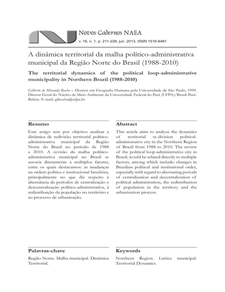 Novos Cadernos NAEA v. 16, n. 1, p. 211-228, jun. 2013, ISSN 1516-6481 A dinâmica territorial da malha político-administrativa municipal da Região Norte do Brasil (1988-2010) The territorial dynamics of the political loop-administrative municipality in Northern Brazil (1988-2010) Gilberto de Miranda Rocha – Doutor em Geografia Humana pela Universidade de São Paulo, 1999. Diretor Geral do Núcleo de Meio Ambiente da Universidade Federal do Pará (UFPA)/Brasil-ParáBelém. E-mail: [email protected] Resumo Abstract Este artigo tem por objetivo analisar a dinâmica de redivisão territorial políticoadministrativa municipal da Região Norte do Brasil no período de 1988 a 2010. A revisão da malha políticoadministrativa municipal no Brasil se associa diretamente a múltiplos fatores, entre os quais destacamos: as mudanças na ordem política e institucional brasileira, principalmente no que diz respeito à alternância de períodos de centralização e descentralização político-administrativa, à redistribuição da população no território e ao processo de urbanização. This article aims to analyze the dynamics of territorial re-division politicaladministrative city in the Northern Region of Brazil from 1988 to 2010. The review of the political loop-administrative city in Brazil, would be related directly to multiple factors, among which include: changes in Brazilian political and institutional order, especially with regard to alternating periods of centralization and decentralization of political administration, the redistribution of population in the territory and the urbanization process. Palavras-chave Keywords Região Norte. Malha municipal. Dinâmica Territorial. Northern Region. Lattice Territorial Dynamics. municipal. 212 Gilberto de Miranda Rocha INTRODUÇÃO O Município1 é uma organização jurídica, política e territorial, de caráter político-administrativo, que compõe a federação brasileira. Muito embora constitua uma unidade político-administrativa que remonta ao período colonial, a estruturação da malha municipal brasileira ocorre somente a partir do século XX, por meio do Decreto-Lei n. 311, de 02 de março de 1938 – um marco legal de configuração do mapa político do país, ao determinar a obrigatoriedade do mapeamento municipal e de definição de seus limites (BRASIL, 2010). A evolução da malha municipal do Brasil, conforme Lima (2007, p. 35), é um elemento fundamental para a compreensão da realidade territorial brasileira, uma vez que constitui um traço central não só da história da divisão do poder local no país, bem como serve de referência e, ao mesmo tempo, revela a dinâmica de ocupação demográfica, econômica e territorial das diversas regiões ao longo do tempo. Trata-se, portanto, de uma referência obrigatória para a compreensão da geografia brasileira, seja nos espaços territoriais consolidados, como aqueles de ocupação recente e em vias de consolidação. E, igualmente, revela a dinâmica de centralização e descentralização que tem marcado os diversos ordenamentos político-institucionais e as relações intergovernamentais, influenciado diretamente na gestão territorial no país. Segundo a Base de Informação Territorial e o Censo Demográfico (IBGE, 2010), o Brasil conta atualmente com 5.565 municípios. Entre 1940 a 2010, em 70 anos, o Brasil criou 3.991 municípios. Esse grande dinamismo da malha políticoadministrativa municipal no Brasil está associado a uma conjunção de fatores, entre os quais dois fatores que consideramos fundamentais: em primeiro lugar, a criação de municípios é um processo eminentemente político e, como tal, envolve a organização (e interesses) de atores sociais e políticos situados em escalas geográficas distintas, e depende de alterações na ordem institucional. Nesse caso, relaciona-se diretamente a mudanças na sociedade e no estado brasileiro, em especial, nas relações intergovernamentais e no pacto federalista. Em segundo lugar, a alteração na malha municipal tem relação estreita com as mudanças na estrutura espacial do território nacional, em especial da Região Norte e do estado do Pará. Destacamos aqui os processos de urbanização e de interiorização do 1 O município é a menor unidade territorial brasileira com governo próprio. É formado pelo distritosede, onde se localiza a cidade, que é a sede municipal e que leva o mesmo nome do município, e que corresponde à zona urbana municipal e, também, pelo território ao seu entorno – a zona rural municipal, que pode ser dividida em distritos, cuja maior povoação recebe geralmente o nome de vila (PINTO, 2003, p. 29). Novos Cadernos NAEA • v. 16 n. 1 • p. 211-228 • jun. 2013 A dinâmica territorial da malha político-administrativa municipal da Região Norte do Brasil (1988-2010) 213 povoamento no país ocorrido nos últimos 50 anos, responsáveis pelo surgimento de novas vilas e cidades. 1 CENTRALIZAÇÃO, DESCENTRALIZAÇÃO E MUNICIPALIZAÇÃO Considerando o primeiro fator, o contexto político nacional e a ordem institucional, no Brasil, têm se expressado em muito pelos processos de centralização do poder, dos recursos, de decisões e de descentralização. De acordo com o Instituto Brasileiro de Geografia e Estatística (IBGE, 2010), apesar do grande dinamismo da malha municipal brasileira, há períodos em que novos municípios são criados em grande quantidade, e outros períodos nos quais esse processo é bastante reduzido. O Atlas Nacional do Brasil Milton Santos (BRASIL, 2010), aponta que os maiores aumentos em valores absolutos do número de municípios ocorreram ao longo das décadas de 1950, 1960 e 1990. Já em termos percentuais, as maiores elevações ocorreram entre 1950 e 1960 (32%) e entre 1960 e 1970 (30%). Observa-se um vínculo estreito entre as mudanças de natureza política e institucional no país e a intensidade da alteração no quadro municipal brasileiro. 