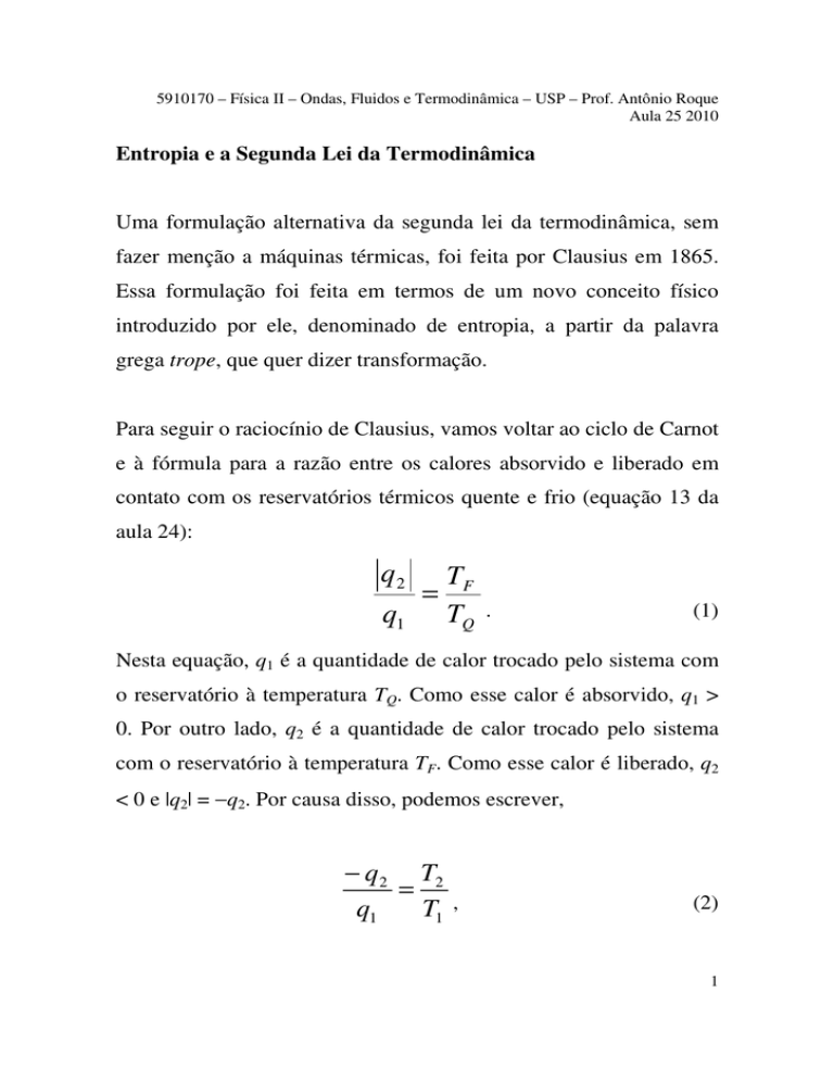 5910170 – Física II – Ondas, Fluidos e Termodinâmica – USP – Prof. Antônio Roque Aula 25 2010 Entropia e a Segunda Lei da Termodinâmica Uma formulação alternativa da segunda lei da termodinâmica, sem fazer menção a máquinas térmicas, foi feita por Clausius em 1865. Essa formulação foi feita em termos de um novo conceito físico introduzido por ele, denominado de entropia, a partir da palavra grega trope, que quer dizer transformação. Para seguir o raciocínio de Clausius, vamos voltar ao ciclo de Carnot e à fórmula para a razão entre os calores absorvido e liberado em contato com os reservatórios térmicos quente e frio (equação 13 da aula 24): q2 TF = q1 TQ . (1) Nesta equação, q1 é a quantidade de calor trocado pelo sistema com o reservatório à temperatura TQ. Como esse calor é absorvido, q1 > 0. Por outro lado, q2 é a quantidade de calor trocado pelo sistema com o reservatório à temperatura TF. Como esse calor é liberado, q2 < 0 e |q2| = −q2. Por causa disso, podemos escrever, − q 2 T2 = q1 T1 , (2) 1 5910170 – Física II – Ondas, Fluidos e Termodinâmica – USP – Prof. Antônio Roque Aula 25 2010 onde passamos a escrever TQ = T1 e TF = T2 para tornar a notação independente do fato de a temperatura de um processo ser quente ou fria e dependente apenas da sua ordem na sequência de processos. A equação (2) pode ser reescrita como, − q2 q1 q q = ⇒ 1 + 2 = 0, T2 T1 T1 T2 ou, 2 qi = 0. ∑ i =1 Ti (3) Esta equação nos diz que a soma, por todos os processos isotérmicos de um ciclo de Carnot, da razão entre o calor trocado no processo e a temperatura do processo é nula. O ciclo de Carnot é um processo reversível. Clausius então argumentou que qualquer ciclo reversível pode ser aproximado com precisão arbitrária por uma sucessão de ciclos de Carnot (veja a figura a seguir). 2 5910170 – Física II – Ondas, Fluidos e Termodinâmica – USP – Prof. Antônio Roque Aula 25 2010 Uma trajetória cíclica geral pode ser aproximada pela soma de um grande número de pequenos ciclos de Carnot. No limite em que os ciclos de Carnot tornam-se infinitesimalmente pequenos a aproximação é exata. Notem que as trajetórias dos pequenos ciclos no interior do grande ciclo se cancelam e apenas as trajetórias no perímetro sobram, igualando a curva do grande ciclo. Como para cada ciclo de Carnot vale a relação, 2 qi =0, ∑ T i =1 i para N ciclos de Carnot deve valer a relação, 3 5910170 – Física II – Ondas, Fluidos e Termodinâmica – USP – Prof. Antônio Roque Aula 25 2010 2N qi i =1 i ∑T = 0. (4) dq = 0, ∫ T R (5) No limite em que N → ∞, onde o símbolo R foi incluído junto ao símbolo de integral para indicar que o ciclo é reversível e dq representa a quantidade infinitesimal de calor trocada a cada uma das etapas dos ciclos infinitesimais usados na integral acima. Clausius imaginou que o ciclo reversível R pode ser dividido em duas partes, uma trajetória reversível R1 entre dois estados de equilíbrio i e f seguida por outra trajetória reversível R2 levando o sistema do estado f de volta ao estado i. Podemos representar este ciclo como, R dq ∫T= R 1 f dq ∫i T + R 2 i dq ∫f T = 0 . (6) Esta equação implica que, f i dq dq = − ∫i T ∫f T , R R 1 i 2 f ou, lembrando que − ∫f g (x )dx = ∫i g (x )dx : 4 5910170 – Física II – Ondas, Fluidos e Termodinâmica – USP – Prof. Antônio Roque Aula 25 2010 f f dq dq = ∫ T ∫i T . R i R 1 (7) 2 Esta última igualdade nos diz que a integral de dq/T entre dois estados i e f por trajetórias reversíveis é independente da trajetória. Portanto, a integral entre i e f por uma trajetória reversível só depende dos estados inicial i e final f. Isto implica que podemos definir uma função de estado S tal que, f S f − Si = dq ∫i T . R (8) A função de estado S foi chamada por Clausius de entropia do sistema. A entropia de um sistema é uma função de estado cuja variação entre dois estados é igual à integral de dq/T entre os dois estados por qualquer processo reversível. É importante ter bem claro que somente uma variação de entropia é definida, não uma entropia absoluta. O mesmo vale para e energia interna de um sistema. O próprio Clausius escreveu: “Eu cunhei a palavra entropia deliberadamente para que ela se pareça com energia, pois estas duas quantidades são análogas em seu significado físico de maneira que uma analogia de denominação parece útil”. 5 5910170 – Física II – Ondas, Fluidos e Termodinâmica – USP – Prof. Antônio Roque Aula 25 2010 A partir da definição de entropia, pode-se definir uma variação infinitesimal de entropia de um sistema por, dq R dS = T , (9) onde o subscrito R indica que a troca infinitesimal de calor deve ser feita de maneira reversível. Como primeiro exemplo de cálculo de entropia, vamos calcular a variação na entropia de um sistema durante uma transição de fase. Em uma transição de fase, a temperatura T e a pressão P permanecem constantes até que toda a substância tenha passado pela transição. Portanto, uma transição de fase pode ser vista como um processo isotérmico. Para calcular a variação na entropia, vamos supor que a transferência de calor entre o sistema e o seu ambiente durante o processo ocorre de maneira suficientemente lenta para que o processo possa ser considerado um processo reversível. Então, f f q dq 1 mL ∆S = ∫ = ∫ dq = R = T TRi T T , R i (10) onde m é a massa do material e L é o seu calor latente para o tipo específico de transição de fase que ele está sofrendo. 6 5910170 – Física II – Ondas, Fluidos e Termodinâmica – USP – Prof. Antônio Roque Aula 25 2010 Por exemplo, vamos calcular a variação na entropia em um processo de fusão de 1 kg de gelo. O calor latente de fusão do gelo, a T = 0°C (273 K) e P = 1 atm, é Lf = 79,6 cal/g. Portanto, a variação na entropia é: (10 g ).(79,6 cal/g ) = 292 cal/K