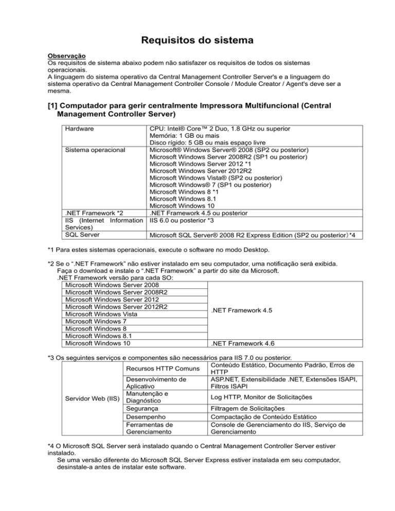 Requisitos do sistema Observação Os requisitos de sistema abaixo podem não satisfazer os requisitos de todos os sistemas operacionais. A linguagem do sistema operativo da Central Management Controller Server's e a linguagem do sistema operativo da Central Management Controller Console / Module Creator / Agent's deve ser a mesma. [1] Computador para gerir centralmente Impressora Multifuncional (Central Management Controller Server) Hardware CPU: Intel® Core™ 2 Duo, 1.8 GHz ou superior Memória: 1 GB ou mais Disco rígido: 5 GB ou mais espaço livre Sistema operacional Microsoft® Windows Server® 2008 (SP2 ou posterior) Microsoft Windows Server 2008R2 (SP1 ou posterior) Microsoft Windows Server 2012 *1 Microsoft Windows Server 2012R2 Microsoft Windows Vista® (SP2 ou posterior) Microsoft Windows® 7 (SP1 ou posterior) Microsoft Windows 8 *1 Microsoft Windows 8.1 Microsoft Windows 10 .NET Framework *2 .NET Framework 4.5 ou posterior IIS (Internet Information IIS 6.0 ou posterior *3 Services) SQL Server Microsoft SQL Server® 2008 R2 Express Edition (SP2 ou posterior)*4 *1 Para estes sistemas operacionais, execute o software no modo Desktop. *2 Se o “.NET Framework” não estiver instalado em seu computador, uma notificação será exibida. Faça o download e instale o “.NET Framework” a partir do site da Microsoft. .NET Framework versão para cada SO: Microsoft Windows Server 2008 Microsoft Windows Server 2008R2 Microsoft Windows Server 2012 Microsoft Windows Server 2012R2 .NET Framework 4.5 Microsoft Windows Vista Microsoft Windows 7 Microsoft Windows 8 Microsoft Windows 8.1 Microsoft Windows 10 .NET Framework 4.6 *3 Os seguintes serviços e componentes são necessários para IIS 7.0 ou posterior. Conteúdo Estático, Documento Padrão, Erros de Recursos HTTP Comuns HTTP Desenvolvimento de ASP.NET, Extensibilidade .NET, Extensões ISAPI, Aplicativo Filtros ISAPI Manutenção e Log HTTP, Monitor de Solicitações Servidor Web (IIS) Diagnóstico Segurança Filtragem de Solicitações Desempenho Compactação de Conteúdo Estático Ferramentas de Console de Gerenciamento do IIS, Serviço de Gerenciamento Gerenciamento *4 O Microsoft SQL Server será instalado quando o Central Management Controller Server estiver instalado. Se uma versão diferente do Microsoft SQL Server Express estiver instalada em seu computador, desinstale-a antes de instalar este software. [2] Computador do administrador (Central Management Controller Console / Module Creator) Computadores ligados á Impressora Multifuncional (Central Management Controller Agent) Hardware Sistema operacional .NET Framework *2 Navegador da web CPU: Intel® Core™ 2 Duo, 1,8 GHz ou superior Memória: 1 GB ou mais Disco rígido: 5 GB ou mais espaço livre Microsoft Windows XP (SP3 ou posterior) Microsoft Windows Vista (SP1 ou posterior) Microsoft Windows 7 Microsoft Windows 8 *1 Microsoft Windows 8.1 Microsoft Windows 10 Microsoft Windows Server 2008 Microsoft Windows Server 2008R2 Microsoft Windows Server 2012 *1 Microsoft Windows Server 2012R2 .NET Framework 4.5 ou posterior *3 Microsoft Internet Explorer® 8.0 ou posterior *4 Microsoft Edge Google Chrome 40.0.2214.111m ou posterior Mozilla Firefox 35.01 ou posterior *1 Para estes sistemas operacionais, execute o software no modo Desktop. *2 Se o “.NET Framework” não estiver instalado em seu computador, uma notificação será exibida. Faça o download e instale o “.NET Framework” a partir do site da Microsoft. .NET Framework versão para cada SO: Microsoft Windows XP Microsoft Windows Vista .NET Framework 4.0 Microsoft Windows Server 2008 Microsoft Windows Vista (SP2 ou posterior) Microsoft Windows 7 Microsoft Windows 8 Microsoft Windows 8.1 .NET Framework 4.5 Microsoft Windows Server 2008 (SP2 ou posterior) Microsoft Windows Server 2008R2 Microsoft Windows Server 2012 *1 Microsoft Windows Server 2012R2 Microsoft Windows 10 .NET Framework 4.6 *3 Se o “Windows XP”, “Window Vista SP1” ou o “Window Server 2008 SP1” estiver instalado em seu computador, instale o “.NET Framework 4.0” e a atualização “KB2468871”. *4 Para a visualização de estatisticas no modo gráfico exigido pelo Canvas, o Internet Explorer 9 ou superior deve estar instalado. Marcas comerciais Microsoft, Windows, Windows Vista, Windows Server, SQL Server e Internet Explorer são marcas ou marcas registradas da Microsoft Corporation nos Estados Unidos e/ou outros países. Intel e Intel Core são marcas da Intel Corporation nos Estados Unidos e outros países. Todas as outras marcas registradas identificadas neste material são de propriedade de seus respectivos proprietários.