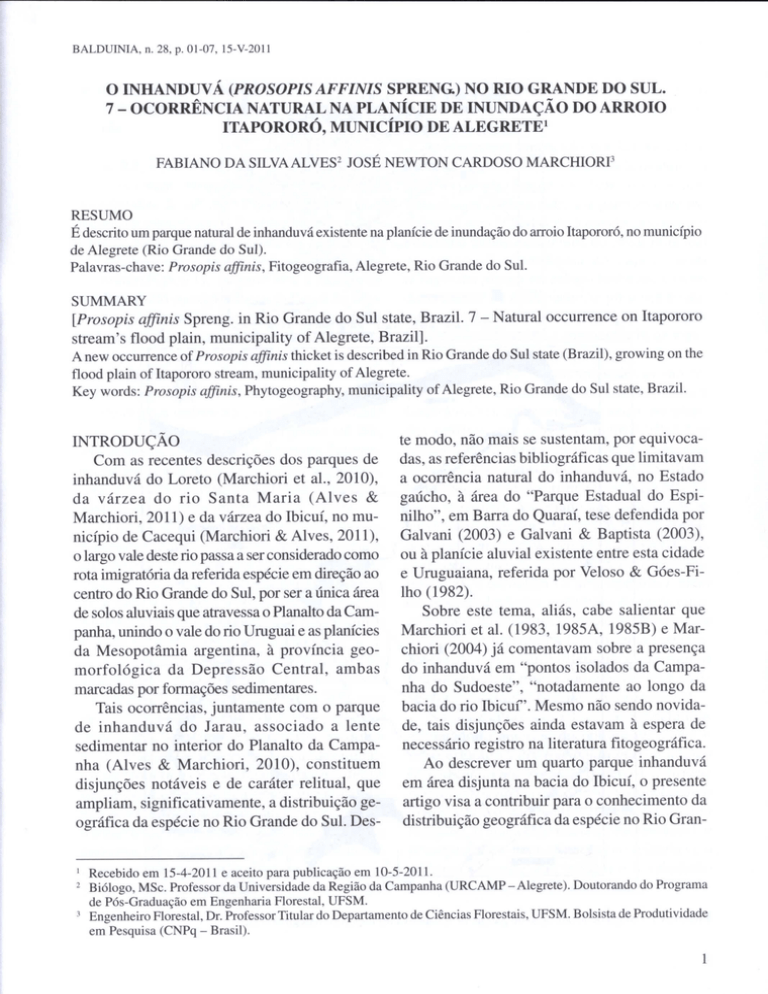 BALDUINIA, n. 28, p. 01-07, IS-V-2011 o INHANDUV Á (PROSOPIS AFFINIS SPRENG) NO RIO GRANDE DO SUL. 7 - OCORRÊNCIA NATURAL NA PLANÍCIE DE INUNDAÇÃO DO ARROIO ITAPORORÓ, MUNICíPIO DE ALEGRETE) FABIANO DA SILVAALVES2 JOSÉ NEWTON CARDOSO MARCHIORP RESUMO É descritoum parque naturalde inhanduváexistentenaplaníciede inundaçãodo arroioItapororó,no município de Alegrete (Rio Grande do Sul). Palavras-chave: Prosopis affinis, Fitogeografia, Alegrete, Rio Grande do Sul. SUMMARY [Prosopis affinis Spreng. in Rio Grande do Sul state, Brazil. 7 - Natural occurrence on Itapororo stream's flood plain, municipality of Alegrete, Brazil]. A new occurrence of Prosopis affinis thicket is described in Rio Grande do Sul state (Brazil), growing on the flood plain of Itapororo stream, municipality of Alegrete. Key words: Prosopis affinis, Phytogeography, municipality of Alegrete, Rio Grande do Sul state, Brazil. INTRODUÇÃO Com as recentes descrições dos parques de inhanduvá do Loreto (Marchiori et aI., 2010), da várzea do rio Santa Maria (Alves & Marchiori, 2011) e da várzea do Ibicuí, no município de Cacequi (Marchiori & Alves, 2011), o largo vale deste rio passa a ser considerado como rota imigratória da referida espécie em direção ao centro do Rio Grande do Sul, por ser a única área de solos aluviais que atravessa o Planalto da Campanha, unindo o vale do rio Uruguai e as planícies da Mesopotâmia argentina, à província geomorfológica da Depressão Central, ambas marcadas por formações sedimentares. Tais ocorrências, juntamente com o parque de inhanduvá do J arau, associado a lente sedimentar no interior do Planalto da Campanha (Alves & Marchiori, 2010), constituem disjunções notáveis e de caráter relitual, que ampliam, significativamente, a distribuição geográfica da espécie no Rio Grande do Sul. Des- 1 2 J te modo, não mais se sustentam, por equivocadas, as referências bibliográficas que limitavam a ocorrência natural do inhanduvá, no Estado gaúcho, à área do "Parque Estadual do Espinilho", em Barra do Quaraí, tese defendida por Galvani (2003) e Galvani & Baptista (2003), ou à planície aluvial existente entre esta cidade e Uruguaiana, referida por Veloso & Góes-Filho (1982). Sobre este tema, aliás, cabe salientar que Marchiori et aI. (1983, 1985A, 1985B) e Marchiori (2004) já comentavam sobre a presença do inhanduvá em "pontos isolados da Campanha do Sudoeste", "notadamente ao longo da bacia do rio Ibicuí". Mesmo não sendo novidade, tais disjunções ainda estavam à espera de necessário registro na literatura fitogeográfica. Ao descrever um quarto parque inhanduvá em área disjunta na bacia do Ibicuí, o presente artigo visa a contribuir para o conhecimento da distribuição geográfica da espécie no Rio Gran- Recebido em 15-4-2011 e aceito para publicação em 10-5-2011. Biólogo, MSc. Professor da Universidade da Região da Campanha (URCAMP - Alegrete). Doutorando do Programa de Pós-Graduação em Engenharia Florestal, UFSM. Engenheiro Florestal, Dr. Professor Titular do Departamento de Ciências Florestais, UFSM. Bolsista de Produtividade em Pesquisa (CNPq - Brasil). • N Escala: WS2·00' 1:50 km W5'·00' WSO°OO' • N 29' 26' Fazenda Itapororó ...•. ...-- ;' i ; ~ ., \. " \. 29' 28' , i i ~ Parque de Inhanduvá I-:~I Rede hidrográfica 55' 22' 55'18' FIGURA 1 - Mapa de localização do parque de inhanduvá do Itapororó (Alegrete - RS). 2 de do Sul, bem como lançar novos olhares sobre a abrangência da Província do Espinhal no Estado. DESCRIÇÃO DO PARQUE Posicionado, geograficamente, em tomo das coordenadas de 29° 26' 51"S e 56° 19' 14" O, o parque de inhanduvá do Itapororó se encontra a 55m de altitude e ocupa parte da planície de inundação da margem direita do arroio de mesmo nome (Figura 1), distando 6km à sudeste de sua foz, 43km da confluência do Ibicuí no Uruguai e 133km a oeste do parque de inhanduvá de Cacequi. A área em estudo pertence à Fazenda Itapororó, propriedade do Sr. Nestor de Moura Jardim Neto, e se encontra no município de Alegrete, Rio Grande do Sul. De origem sedimentar, o terreno é formado por depósitos aluviais, com areia grossa até [ma, sedimentos síltico-argilosos e diminutos fragmentos de rocha oriundos das coxilhas adjacentes, caracterizando um Planos solo Háplico Eutrófico Arênico, de acordo com Streck et alo(2OOS). O clima, do tipo Cfa, apresenta chuvas regulares em todos os meses do ano, temperatura do mês mais frio entre 3 e 1SoC, e verões com temperatura média do mês mais quente superior a 22°C (Moreno, 1961). De acordo com Nimer (1977), corresponde ao tipo Mesotérrnico Brando Super-Úmido, sem estação seca. A vegetação reúne algumas centenas de inhanduvás isolados (Figura 2A) ou dispostos em pequenos agrupamentos (Figura 2B), com indivíduos velhos e numerosas regenerações (Figura 2C), bem como espécies arbóreas oriundas da mata ciliar adjacente. Apesar dos impactos na fisionomia e estrutura do parque, decorrentes da intensa ação antrópica, mesmo assim não pode ser questionada a sua origem natural: tratam-se de fragmentos remanescentes de um pequeno, mas verdadeiro parque de inhanduvá, que se estende por llOOm de comprimento, ao longo do arroio, com largura máxima de 400m, tendo por limite, a leste, o afloramento de solos regolíticos eutróficos, típicos do Planalto da Campanha gaúcha. Severamente ameaçado por lavoura arrozeira, são numerosos os inhanduvás mortos em meio ao parque (Figura 3A), bem como os indivíduos com sistema radicular parcialmente exposto (Figura 3C), devido à erosão causada por eventuais transbordamentos do canal principal do arroio. A abundância do capim anoni (Eragrostis plana) no estrato herbáceo é outro claro indício de antropismo. A presença de numerosos inhanduvás jovens, por sua vez, depõe favoravelmente sobre a permanência da espécie na região, à médio prazo (Figura 2C). Os troncos de velhos inhanduvás
