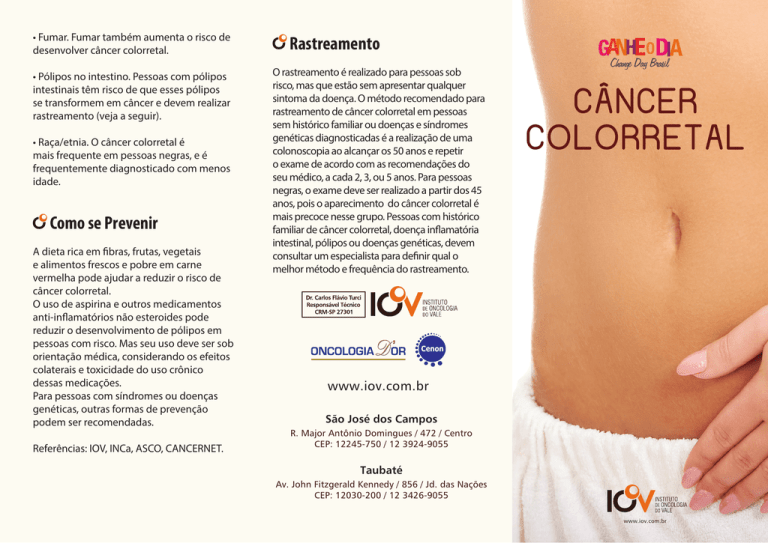 • Fumar. Fumar também aumenta o risco de desenvolver câncer colorretal. • Pólipos no intestino. Pessoas com pólipos intestinais têm risco de que esses pólipos se transformem em câncer e devem realizar rastreamento (veja a seguir). • Raça/etnia. O câncer colorretal é mais frequente em pessoas negras, e é frequentemente diagnosticado com menos idade. Como se Prevenir A dieta rica em fibras, frutas, vegetais e alimentos frescos e pobre em carne vermelha pode ajudar a reduzir o risco de câncer colorretal. O uso de aspirina e outros medicamentos anti-inflamatórios não esteroides pode reduzir o desenvolvimento de pólipos em pessoas com risco. Mas seu uso deve ser sob orientação médica, considerando os efeitos colaterais e toxicidade do uso crônico dessas medicações. Para pessoas com síndromes ou doenças genéticas, outras formas de prevenção podem ser recomendadas. Referências: IOV, INCa, ASCO, CANCERNET. Rastreamento O rastreamento é realizado para pessoas sob risco, mas que estão sem apresentar qualquer sintoma da doença. O método recomendado para rastreamento de câncer colorretal em pessoas sem histórico familiar ou doenças e síndromes genéticas diagnosticadas é a realização de uma colonoscopia ao alcançar os 50 anos e repetir o exame de acordo com as recomendações do seu médico, a cada 2, 3, ou 5 anos. Para pessoas negras, o exame deve ser realizado a partir dos 45 anos, pois o aparecimento do câncer colorretal é mais precoce nesse grupo. Pessoas com histórico familiar de câncer colorretal, doença inflamatória intestinal, pólipos ou doenças genéticas, devem consultar um especialista para definir qual o melhor método e frequência do rastreamento. CÂNCER COLORRETAL Cenon www.iov.com.br São José dos Campos R. Major Antônio Domingues / 472 / Centro CEP: 12245-750 / 12 3924-9055 Taubaté Av. John Fitzgerald Kennedy / 856 / Jd. das Nações CEP: 12030-200 / 12 3426-9055 www.iov.com.br O que é o Câncer Colorretal O câncer colorretal (ou de intestino grosso) começa na maioria das vezes como um pólipo, um tumor não canceroso que se desenvolve na parede do intestino grosso (formado pelo cólon e pelo reto). Com o passar do tempo, esses pólipos podem sofrer mutações e passar a crescer descontroladamente, desenvolvendo um tumor maligno do cólon ou reto. A maior parte dos cânceres colorretais é do tipo “adenocarcinoma”. Um tumor maligno do intestino grosso pode se espalhar para outras partes do corpo, o que chamamos de metástases. Os linfonodos regionais são os lugares mais comuns de metástases do câncer colorretal. Quando o câncer se espalha através do corpo, ele acomete mais comumente o fígado e os pulmões, o que chamamos de metástases distantes. Tratamento As opções de tratamento para o câncer colorretal dependem do estágio, tamanho e localização do tumor, se o câncer se espalhou e a condição de saúde da pessoa. A cirurgia para remover o tumor é usualmente o primeiro tratamento. Quando há risco alto da doença retornar, pode ser indicada a combinação com a quimioterapia ou com a radioterapia e quimioterapia para tumores do reto (chamado de tratamento adjuvante). Em alguns casos, o tratamento para tumores do reto envolve o uso de quimioterapia e radioterapia para reduzir o tamanho do tumor antes de indicar a cirurgia (chamado de tratamento neoadjuvante). Se a doença retornar ou em casos onde o câncer se espalhou, o tratamento pode incluir radioterapia, quimioterapia e terapia alvo. A terapia alvo é uma modalidade de tratamento dirigida aos genes ou à proteínas específicas do câncer que atuam para o seu crescimento. Uma cirurgia adicional também pode ser recomendada para remover o câncer que se espalhou pelo cólon e reto ou para o fígado. Consulte o GUIA BEM VIVER para mais informações sobre o seu tratamento Fatores de Risco Sabemos que existem fatores que aumentam a chance de uma pessoa desenvolver câncer, mas uma pessoa pode ter diversos fatores de risco e nunca desenvolver o câncer. • Idade. O risco de desenvolver o câncer colorretal aumenta com a idade. Mais de 90% das pessoas com câncer colorretal tem mais de 50 anos. • Doença inflamatória intestinal. Pessoas com doença de Crohn ou colite ulcerativa também têm risco aumentado. • História familiar e genética. Apesar de 95% dos casos serem esporádicos (desenvolvidos por fatores não genéticos), existem algumas síndromes e doenças hereditárias que predispõem o desenvolvimento do câncer colorretal. Os mais prevalentes são a Polipose Adenomatosa Familiar e a Síndrome de Lynch (câncer colorretal hereditário não poliposo). • Sedentarismo e obesidade. Pessoas que não praticam exercícios físicos regularmente e com sobrepeso ou obesidade têm risco aumentado de desenvolver câncer colorretal. • Dieta. Pessoas que comem mais carne vermelha e carne processada têm maior risco.