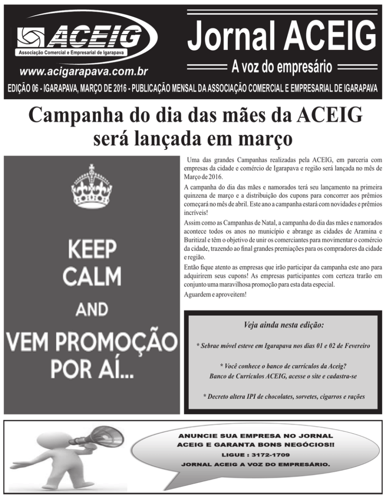 Jornal ACEIG www.acigarapava.com.br A voz do empresário EDIÇÃO 06 - IGARAPAVA, MARÇO DE 2016 - PUBLICAÇÃO MENSAL DA ASSOCIAÇÃO COMERCIAL E EMPRESARIAL DE IGARAPAVA Campanha do dia das mães da ACEIG será lançada em março Uma das grandes Campanhas realizadas pela ACEIG, em parceria com empresas da cidade e comércio de Igarapava e região será lançada no mês de Março de 2016. A campanha do dia das mães e namorados terá seu lançamento na primeira quinzena de março e a distribuição dos cupons para concorrer aos prêmios começará no mês de abril. Este ano a campanha estará com novidades e prêmios incríveis! Assim como as Campanhas de Natal, a campanha do dia das mães e namorados acontece todos os anos no município e abrange as cidades de Aramina e Buritizal e têm o objetivo de unir os comerciantes para movimentar o comércio da cidade, trazendo ao final grandes premiações para os compradores da cidade e região. Então fique atento as empresas que irão participar da campanha este ano para adquirirem seus cupons! As empresas participantes com certeza trarão em conjunto uma maravilhosa promoção para esta data especial. Aguardem e aproveitem! Veja ainda nesta edição: * Sebrae móvel esteve em Igarapava nos dias 01 e 02 de Fevereiro * Você conhece o banco de currículos da Aceig? Banco de Currículos ACEIG, acesse o site e cadastra-se * Decreto altera IPI de chocolates, sorvetes, cigarros e rações 2 Jornal ACEIG IGARAPAVA, MARÇO DE 2016 Sebrae móvel esteve em Igarapava nos dias 01 e 02 de Fevereiro A unidade móvel do Serviço de Apoio às Micro e Pequenas Empresas (Sebrae) esteve na cidade de Igarapava na Av. Maciel 460 em frente a Associação Comercial e Empresarial de Igarapava (ACEIG), prestando atendimento nos dias 01 e 02 de fevereiro. Empresários e empreendedores formais e informais puderam esclarecer dúvidas e obter informações para formalizar o negócio, além de receber dicas para melhorar a gestão empresarial de forma estratégica e inovadora. O Sebrae Móvel é um escritório itinerante montado em uma van personalizada e conta com internet móvel, celular, notebooks, impressora, rede wi-fi, TV de LED, mesas e cadeiras. A equipe do Sebrae presta consultorias individuais e coletivas, gratuitas, a empresários e a quem planeja ser dono do seu próprio negócio. A finalidade do atendimento itinerante é ampliar a área de atuação do Sebrae, levando consultorias, informações e a cultura empreendedora a locais que representam um potencial de mercado. A agenda do Sebrae Móvel pode ser consultada pela internet. Banco de Currículos ACEIG, acesse o site e cadastra-se O Banco de Currículos On Line da ACEIG é um banco de dados que armazena informações de todos os candidatos que se registraram no site da Aceig, foi criado para que os associados possam consultar talentos disponíveis em Igarapava, ajudando o RH de sua empresa a encontrar perfis adequados às necessidades da empresa. Através do banco de currículos o associado poderá ter uma maior agilidade nos processos seletivos, acessando todos os currículos em um só lugar e em uma base mais atualizada, pois no banco de currículos a Aceig vários currículos são cadastrados todos os dias. A consulta aos currículos só pode ser efetuada por intermédio da área restrita disponível apenas aos associados devidamente cadastrados. Como funciona o banco de currículos: 1 - O candidato, através do site www.aceig.com.br, cadastra seu currículo. Esse currículo permanecerá por tempo indeterminado no banco de currículos, sendo aconselhável exclusão do currículo quando o candidato conseguir a recolocação no mercado de trabalho, sendo que a exclusão pode ser feita pelo próprio candidato. Ele também tem a possibilidade de consultar as vagas disponíveis. 2 - O associado tem duas maneiras de encontrar novos talentos através da ferramenta: O primeiro é buscar pelos novos currículos cadastrados em nosso banco, fazendo os devidos filtros. O segundo é cadastrar uma vaga. As vagas cadastradas pelos associados ficarão disponíveis para consulta pública no site. É importante retirar a vaga do site assim que ela for preenchida. Perguntas frequentes dos candidatos: 1 - Como posso verificar se meu currículo foi realmente cadastrado? R.: Assim que você solicitar o cadastro e efetuar o login em nosso sistema você poderá verificar os dados que foram gravados em nossa base de dados, portanto é importante que todos os dados estejam preenchidos corretamente, pois assim que surgir uma oportunidade compatível com seu perfil, a empresa interessada entrará em contato com você. Ressaltamos que seu currículo permanecerá cadastrado em nosso sistema por prazo indeterminado. Lembre-se de mantê-lo sempre atualizado! 2 - Fiz meu cadastro no Banco de Currículos da Aceig. Em quanto tempo me contatarão para iniciar um processo seletivo? R.: Este período é muito variável, pois dependerá do surgimento das vagas para profissionais com o seu perfil, e também dependerá do interesse de cada empresa. Cadastrar o currículo não é garantia de ser chamado para alguma seleção. 3 - Se eu participar de uma seleção e não for classificado, meu cadastro será excluído do Banco de Currículos? R.: Não, seu cadastro permanece em nosso Banco de Currículos para que você possa participar de futuras seleções, inclusive, para o mesmo cargo. O currículo só pode ser excluído pelo próprio candidato. 4 - Quanto tempo meu currículo ficará cadastrado no sistema? R.: Seu currículo permanecerá em nosso sistema por tempo indeterminado. Você poderá atualizar seus dados sempre que for necessário. 5 - Como funciona o painel de Vagas Disponíveis? R.: Neste painel serão informadas as oportunidades de vagas e seus detalhes. Você deve ficar atento às divulgações para que possa se candidatar a uma vaga. 6 – Se eu me candidatar a uma vaga quer dizer que serei chamado para o processo seletivo? R