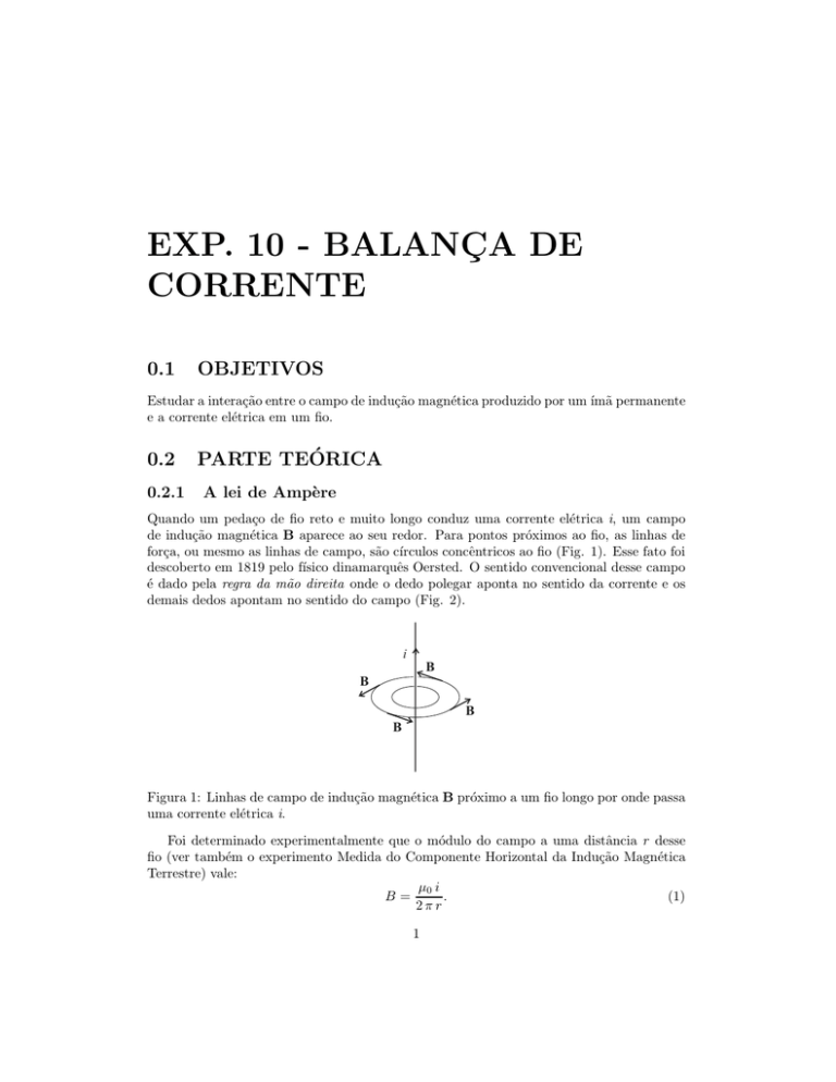 EXP. 10 - BALANÇA DE CORRENTE 0.1 OBJETIVOS Estudar a interação entre o campo de indução magnética produzido por um ı́mã permanente e a corrente elétrica em um fio. 0.2 0.2.1 PARTE TEÓRICA A lei de Ampère Quando um pedaço de fio reto e muito longo conduz uma corrente elétrica i, um campo de indução magnética B aparece ao seu redor. Para pontos próximos ao fio, as linhas de força, ou mesmo as linhas de campo, são cı́rculos concêntricos ao fio (Fig. 1). Esse fato foi descoberto em 1819 pelo fı́sico dinamarquês Oersted. O sentido convencional desse campo é dado pela regra da mão direita onde o dedo polegar aponta no sentido da corrente e os demais dedos apontam no sentido do campo (Fig. 2). i B B B B Figura 1: Linhas de campo de indução magnética B próximo a um fio longo por onde passa uma corrente elétrica i. Foi determinado experimentalmente que o módulo do campo a uma distância r desse fio (ver também o experimento Medida do Componente Horizontal da Indução Magnética Terrestre) vale: μ0 i . (1) B= 2πr 1 N. B. de Oliveira — DFES-I. FÍSICA-UFBA-Rev. 2010.1 2 i B Figura 2: Regra da mão direita aplicada a um fio por onde passa uma corrente elétrica i. Integrando o vetor B ao longo de um caminho circular C de raio r em torno do fio temos: μ0 i μ0 i 2 π r = μ0 i B · dl = dl = 2 π r 2 πr C C ∴ B · dl = μ0 i. (2) C Essa equação é conhecida como a lei de Ampère e diz “a integral de caminho fechado C do campo de indução magnética é proporcional à corrente que fura qualquer superfı́cie apoiada nesse caminho”. 0.3 Força de Lorentz Quando um portador de carga elétrica q em movimento com uma velocidade v penetra uma região do espaço onde existe um campo elétrico E e um campo de indução magnética B, ele fica submetido a uma força F conhecida por força de Lorentz dada por: B = q(E + v × B). (3) Na ausência do campo elétrico, resta apenas a força magnética Fm = q v × B. (4) Um caso simples e importante é o do movimento das cargas elétricas no interior de um fio condutor retilı́neo, imerso em um campo de indução magnética B uniforme e perpendicular a esse fio. A figura (Fig. 3) mostra um segmento infinitesimal desse fio nessa condição. A corrente elétrica i nesse elemento de fio é dada por: i= dq dt 0.4. PARTE EXPERIMENTAL 3 B dFm v i dl Figura 3: Força magnética dFm sobre um elemento infinitesimal de um fio por onde passa uma corrente elétrica i. onde dq é o elemento infinitesimal de carga distribuı́do ao longo do elemento de fio e suposto ter uma velocidade média v. A força dF que atua nesse elemento de fio é dada pela equação (4) substituido-se q por dq = i dt dFm = i dt v × B. Considerando que no intervalo de tempo dt a carga dq terá percorrido o comprimento dl podemos expressar a velocidade v como v= dl . dt Portanto, dl × B = i dl × B. dt Para um pedaço de fio reto de comprimento l imerso num campo de indução magnética uniforme B e conduzindo uma corrente i teremos, após integrar essa expressão, que dFm = i dt Fm = i l × B. 0.3.1 (5) Teoria da medida Consideremos agora que esse pedaço de fio esteja na horizontal e submetido, simultaneamente, ao campo gravitacional e ao campo de indução magnética uniforme entre os polos de um ı́mã como mostra a figura (Fig. 4). A depender do sentido da corrente, a força magnética Fm poderá estar no mesmo sentido da força gravitacional P ou no sentido oposto. Na ausência da corrente elétrica, apenas a força devido à gravidade atua no condutor. Uma balança convenientemente acoplada ao pedaço de fio pode ser utilizada para medir a força magnética em função da corrente elétrica que o percorre. Se considerarmos que o sentido da corrente é tal que a força magnética vertical aponte para baixo, o equilı́brio estático será obtido quando o valor dessa força somado ao peso do próprio fio for igual à força vertical para cima exercida pela balança. Na verdade, a balança que será utilizada aplicará uma força equivalente ao peso de uma massa expressa em gramas. 0.4 0.4.1 PARTE EXPERIMENTAL Lista de materiais Identifique os seguintes materiais e equipamentos que se encontram sobre a mesa: N. B. de Oliveira — DFES-I. FÍSICA-UFBA-Rev. 2010.1 4 Fm B P S N i Fm B N S i P = mg Figura 4: Força magnética dFm sobre um pedaço de um fio por onde passa uma corrente elétrica i e submetido ao campo gravitacional. • Balança marca Ohaus com pés niveladores e nı́vel de bolha; • fonte de tensão contı́nua (DC) com limitação de corrente e com amperı́metro acoplado; • ı́mã permanente em forma de U com peças polares removı́veis; • placas de circuito impresso com uma trilha condutora (n = 1) nos comprimentos 12,5 mm, 25,0 mm, 50,0mm; • placa de circuito impresso com dus trilha condutoras (n = 2) no comprimento 50,0 mm; • base, haste e suporte de ligação; • cordoalha flexı́vel (fita) condutora de cobre prateado com terminais tipo pino banana. 0.4.2 Cuidados com os equipamentos A balança é um equipamento muito sensı́vel. Não force seus braços e nem dê tombo na mesma. Quando necessário, desloque-a com cuidado. 0.4.3 Montagem experimental O conjunto balança e circuito estão representados na figura (Fig. 5). Observe que as fitas condutoras que ligam a fonte à placa de circuito impresso não devem ficar esticadas. Isso causaria um esforço no braço da balança ocasionando um erro grosseiro na medida da força sobre o condutor. Ajuste os parafusos de nivelamento dos pés da balança até que a bolha do medidor de nı́vel fique centralizada. Feito isso, a balança não pode ser mais deslocada dessa posição. Caso isso aconteça, verifique novamente o nivelamento da balança. 0.4. PARTE EXPERIMENTAL 5 + Figura 5: Montagem experimental da “balança de corrente”. 0.4.4 Tara da balança Utilize a placa de circuito impresso cujo comprimento da trilha é igual 12,5 mm. Inicialmente, com essa placa fora 