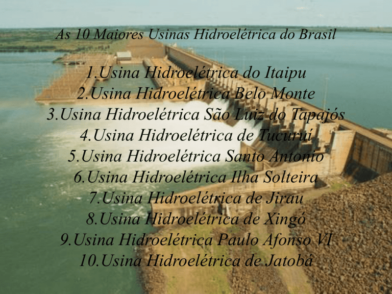 As 10 Maiores Usinas Hidroelétrica do Brasil 1.Usina Hidroelétrica do Itaipu 2.Usina Hidroelétrica Belo Monte 3.Usina Hidroelétrica São Luiz do Tapajós 4.Usina Hidroelétrica de Tucuruí 5.Usina Hidroelétrica Santo Antonio 6.Usina Hidroelétrica Ilha Solteira 7.Usina Hidroelétrica de Jirau 8.Usina Hidroelétrica de Xingó 9.Usina Hidroelétrica Paulo Afonso VI 10.Usina Hidroelétrica de Jatobá Usina Hidrelétrica de Ilha Solteira A Usina Hidrelétrica Ilha Solteira é a maior usina hidrelétrica da CESP e do Estado de São Paulo e a terceira maior usina do Brasil . Está localizada no rio Paraná, entre os municípios de Ilha Solteira (SP) e Selvíria (MS). Em conjunto com a Usina hidrelétrica Engenheiro Sousa Dias ( Jupiá ) , compõe o sexto maior complexo hidrelétrico do mundo. Sua potência instalada é de 3.444,0 MW e tem 20 unidades geradoras com turbinas tipo Francis , que geram a partir de um desnível máximo de 41,5m1. Iniciado pelo governador Adhemar de Barros em 1965 , a usina foi concluída em 1978. É uma usina com alto desempenho operacional que, além da produção de energia elétrica, é de fundamental importância para o controle da tensão e frequência do Sistema Interligado Nacional . Sua barragem tem 5.605 m de comprimento e seu reservatório tem 1.195 km² de extensão. Que represa águas uma área de captação de 375.460 KM2. Seu nível máximo operacional é de 328 m acima do nível do mar e seu nível mínimo operacional é de 323 m acima do nível do mar . O Canal Pereira Barreto , com 9.600 m de comprimento, interliga os reservatórios da Usina Hidrelétrica Ilha Solteira e da Usina Hidrelétrica Três Irmãos , propiciando a operação energética integrada dos dois aproveitamentos hidrelétricos . Segundo o Operador Nacional do Sistema Elétrico (ONS) o lago da Usina Hidrelétrica de Ilha Solteira, combinado com o lago Usina Hidrelétrica de Três Irmãos, é capaz de armazenar 3,07% do volume represável pelos reservatórios do Sistema Sudeste/Centro Oeste. Em março de 2000, seu processo de geração de energia elétrica foi certificado pelo Bureau Veritas Quality Internacional, baseado na NBR ISO 9002:1994 O vertedouro da usina Ilha Solteira contém 19 vãos e uma descarga total de 38.300.00 m³/s. As águas do rio Tietê, afluente do rio Paraná, desembocam a montante de Jupiá e a jusante da usina de Ilha Solteira, respectivamente. Existe, porém, um desvio para que parte da vazão destes rios possa ser desviada entre os reservatórios de Ilha Solteira e Três Irmãos com a finalidade de se promover melhor desempenho energético e controle de afluências nos aproveitamentos. Pelos trabalhos de alto nível na preservação, reprodução e criação em cativeiros de espécies como o jacaré-de-papo amarelo, arara canindé, tamanduá-bandeira, bugio vermelho, cervo-do-pantanal, lobo-guará, jaguatirica e cachorro-do-mato-vinagre. Possui um parque zoológico com 65 diferentes espécies em uma área de 18 hectares, onde os animais são mantidos em ambientes semelhantes a seus habitats naturais. O Ministério dos Transportes liberou a construção de uma eclusa no rio Paraná para transpor a barragem de Ilha Solteira na divisa de São Paulo com Mato Grosso do Sul. A obra vai tornar navegável todo trajeto da hidrovia Paraná que hoje, depende da hidrovia Tietê para chegar ao tremo sul. A eclusa em Ilha Solteira vai permitir que a hidrovia Paraná seja padronizada, pois a largura de suas eclusas são maiores que da hidrovia Tietê e o Porto de Santos já está congestionado, sendo necessário que se utilize cada vez mais o Porto Paranaguá. Com a eclusa em Ilha Solteira, a hidrovia Paraná fica com navegação padronizada em cerca de 2 mil quilômetros. Escola Estadual Camilo Bonfim Professor.João Antonio Série.2°ano “D” Período.Noturno Alunas.Aline,Islaine ,Lauriane ,Vanusa e Yasmin N° da Chamada 26,15,20,26,29
