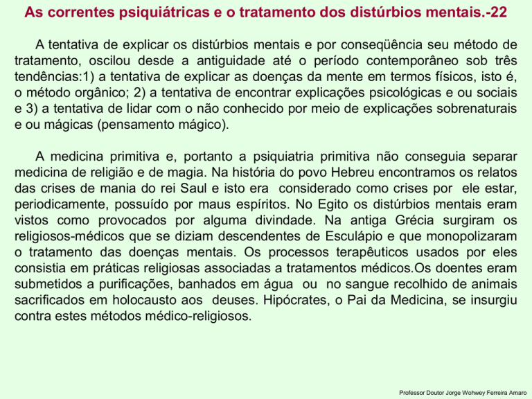 As correntes psiquiátricas e o tratamento dos distúrbios mentais.-22 A tentativa de explicar os distúrbios mentais e por conseqüência seu método de tratamento, oscilou desde a antiguidade até o período contemporâneo sob três tendências:1) a tentativa de explicar as doenças da mente em termos físicos, isto é, o método orgânico; 2) a tentativa de encontrar explicações psicológicas e ou sociais e 3) a tentativa de lidar com o não conhecido por meio de explicações sobrenaturais e ou mágicas (pensamento mágico). A medicina primitiva e, portanto a psiquiatria primitiva não conseguia separar medicina de religião e de magia. Na história do povo Hebreu encontramos os relatos das crises de mania do rei Saul e isto era considerado como crises por ele estar, periodicamente, possuído por maus espíritos. No Egito os distúrbios mentais eram vistos como provocados por alguma divindade. Na antiga Grécia surgiram os religiosos-médicos que se diziam descendentes de Esculápio e que monopolizaram o tratamento das doenças mentais. Os processos terapêuticos usados por eles consistia em práticas religiosas associadas a tratamentos médicos.Os doentes eram submetidos a purificações, banhados em água ou no sangue recolhido de animais sacrificados em holocausto aos deuses. Hipócrates, o Pai da Medicina, se insurgiu contra estes métodos médico-religiosos. Professor Doutor Jorge Wohwey Ferreira Amaro As correntes psiquiátricas e o tratamento dos distúrbios mentais.-22 Limitando-se somente ao tratamento médico. Muitas doenças e distúrbios que eram atribuídos a divindades, a espíritos foram explicados, pelos gregos, como naturais e orgânicos. Assim por exemplo à histeria que era atribuída a influencia de espíritos foi rotulada pelos gregos como uma doença orgânica. Como não conheciam anatomia atribuíram ao útero da mulher que se deslocaria dentro do abdome causando a crise histérica (Histeros: útero). Em sua obra A República, Platão antecipou-se à teoria do sonho de Freud. Concebia que no sono a alma tenta retirar-se das influências externas e internas, quando então, são expressos nos sonhos desejos que geralmente não se expressam no estado de vigília. A grande diferença entre as teorias do sonho de Platão e Freud consiste no fato de ter sido a de Platão apenas uma postulação intuitiva e engenhosa ao passo que a de Freud foi um método operacional pelo qual o conteúdo inconsciente reprimido de um sonho pode ser reconstruído, interpretado e introduzido na consciência. Segundo Platão no sonho os conflitos entre os apetites inferiores desorganizados e as funções organizadoras mais altas da razão são expressos. Esta foi a forma da base da psicologia platoniana.(1) Professor Doutor Jorge Wohwey Ferreira Amaro As correntes psiquiátricas e o tratamento dos distúrbios mentais.-22 Como o conhecimento não caminha em linha reta, na idade média a crença, na etiologia de espíritos e mágicas, voltou e muitas das crises histéricas eram rotuladas como possessão demoníaca. Assim, na França, em um convento de Loudan, uma freira com crises histéricas foi rotulada como possessão demoníaca e logo a seguir várias outras freiras entraram na suposta possessão demoníaca.Na idade média ocorreu um surto de crenças religiosas em possessões demoníacas e de espíritos maus e passaram a submeter, os então chamados endemoniados, a suplícios e torturas e não raramente queimados em fogueiras. Ao século XVII atribuiu-se o mérito de haver lançado os primeiros alicerces do mundo moderno. Surgiram dois métodos para procurar o conhecimento baseado em causas naturais. Alguns autores davam ênfase ao método dedutivo outros ao método experimental ou indutivo. A contribuição dos cientistas do século XVII foi dar ênfase ao papel da razão no conhecimento e posterior controle da natureza exterior. Professor Doutor Jorge Wohwey Ferreira Amaro As correntes psiquiátricas e o tratamento dos distúrbios mentais.-22 A herança empírica, racional e observacional do século XVII continuou a florescer durante todo o século XVIII. A característica do século XVIII é que a crença na razão substituiu a tradição e a fé em todos os aspectos da busca do conhecimento. A riqueza dos dados médicos e científicos estabelecidos durante os séculos XVII e XVIII foi muito grande e isto levou os estudiosos a organizar sínteses e classificações. Há um grande aumento de classificações e nomenclaturas dadas aos distúrbios mentais. Embora estas classificações dessem uma visão de conjunto e delimitações de entidades nosográficas não resolviam o problema do desconhecimento das causas e dos fenômenos. A classificação e a sistematização não explica os fenômenos que classifica. Nestas condições o tratamento era baseado em especulações psicológicas e fisiológicas primitivas. William Cullen foi o primeiro a empregar o termo “neurose” querendo dizer doença que não é acompanhada de febre ou patologia localizada. O primeiro tratado sistemático de psicoterapia foi publicado em 1803 pelo médico alemão Johann Christian Reil. Sua contribuição mais significativa foi construir um método psicoterápico de maneira sistemática e imaginativa. Mostra-se inteiramente convencido de que a doença mental é um fenômeno psicológico cuja causa exige método psicológico de tratamento. Reconheceu também o papel da excitação sexual nas perturbações mentais.( 1 ) Professor Doutor Jorge Wohwey Ferreira Amaro As correntes psiquiátricas e o tratamento dos distúrbios mentais.-22 No século XIX além de pesquisas sobre localização cerebral os cientistas promoviam estudos sobre a arquitetura celular do cérebro. Novos métodos de colorir corpos celulares e a bainha das fibrilas levaram em 1891 ao conceito do NEURÔNIO-UNIDADE ESTRUTURAL E FUNCIONAL DO TECIDO NERVOSO. A maneira como um impulso é comunicado de um neurônio para o seguinte continua, a