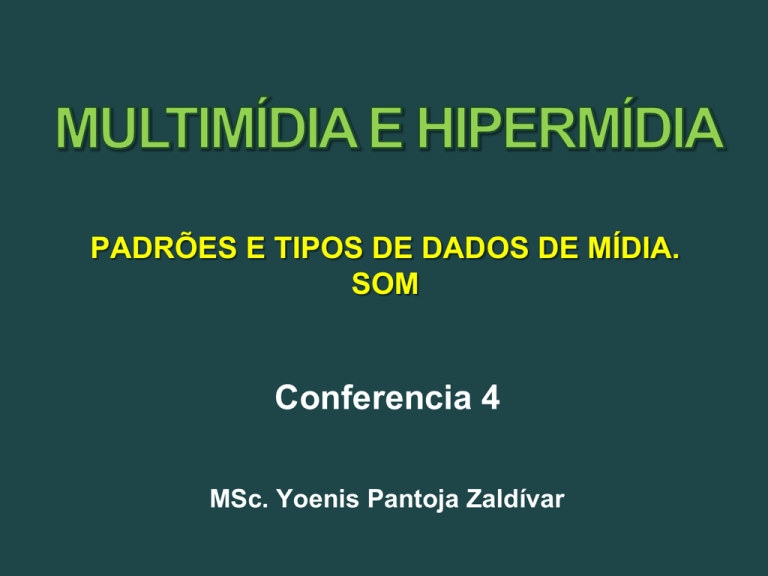 PADRÕES E TIPOS DE DADOS DE MÍDIA. SOM Conferencia 4 MSc. Yoenis Pantoja Zaldívar RESUMO 1. 2. 3. 4. 5. 6. Conceitos fundamentais Historia do som Extensões de som Componentes de som nas multimídias Propriedades acústicas Ferramentas para o tratamento de som ¿Que se entende por Som? SOM. DEFINIÇÕES O som é uma onda longitudinal que só se propaga em meios materiais e que tem frequência compreendida na faixa entre 20 e 20 000 hertz. (Silva Santos, Mundo Educação) SOM. DEFINIÇÕES Som é todo o movimento vibratorio que, propagado por meios elásticos, é capaz de excitar o ouvido humano para produzir sensação auditiva. (Diccionario Enciclopédico Labor) SOM. DEFINIÇÕES Resultado de perceber auditivamente variações oscilantes de algum corpo físico, normalmente, através do ar. (Rodríguez, 1998) Os elementos comuns são 1. Um elemento que vibra 2. Um médio transmissor das ondas 3. Um estímulo sobre o sentido auditivo Todos os fenômenos sonoros estão relacionados às vibrações dos corpos materiais. Quando escutamos um som é porque um determinado corpo está vibrando, produzindo aquele som. Quando falamos o som é emitido pela vibração das cordas vocais. Quando batemos em um tambor com um pedaço de madeira ou com a própria mão, fazemos esse corpo vibrar produzindo o som. Quando as cordas de um violão ou violino se movimentam elas vibram e emitem sons. Todos esses exemplos de corpos materiais são fontes emissoras de som, pois quando vibram emitem sons que se propagam no meio material, ou seja, no ar. Esses sons penetram no nosso ouvido provocando sensações sonoras. O som é uma onda longitudinal, que só se propaga em meios materiais (sólidos, líquidos ou gases). Ao contrário do que ocorre com a luz, o som não pode se propagar no vácuo, ou seja, não é possível perceber o som se não existir um meio material entre o corpo que vibra e o nosso ouvido ¿Como podemos ouvir? Historia do som No siglo XV Galileu iniciou o estabelecimento das relações numéricas entre os sons em função das vibrações do objeto sonoro. Verificou-se que um determinado número de vibrações dá como resultado um som específico. Historia do som Joseph Sauver, considerado o pai da acústica musical, descobriu em 1600 o número exato de vibrações em cada som para o ouvido humano o captar. Estabeleceu-se entre 30.000 e 40.000 vibrações por segundo.. Historia do som Em 1854 o francês Charles Bourseul realiza o primeiro desenho de transmissão de ondas sonoras por médio de um sistema de vibração de membranas que activariam um circuito elétrico para que, finalmente, este reproduzisse a mesma vibração sobre outra membrana a longa distância. Historia do som Em 1860 Antonio Meucci inventou uma forma de comunicação entre seu laboratório do sótano e seu dormitório. Em 1871 quis patentear a ideia mas Graham Bell adiantou-selhe e ganhou o processo judicial. Em 2002 Meucci foi reconhecido como o verdadeiro inventor do telefone Historia do som Em 1876 Emile Berliner crió o primeiro micrófono usado como transmisor de voz. Anos despois também crió o gramófono e os discos de pizarra. Historia do som Em 1877 Tomás Alva Edison crió o primeiro fonógrafo e executou a primeira gravação de voz humana. Primeira gravação de som do mundo Historia do som O audio digital aparece no final de 1950. Max Mathews foi o primeiro em gerar sons singelos com um computador. Devido à escassa potência dos computadores não se podia digitalizar o som. Historia do som Em 1979 Sony e Philips criaron o Compact Disc. Mais tarde foram desenvolvidos os arquivos MP3, que foi a revolução do audio digital Extensões de som • Formatos PCM • Formados comprimidos • Formatos descriptivos Formatos PCM • Contêm toda a informação que saiu do convertidos analógico ao digital, sem nenhuma omissão, por tanto, têm a melhor qualidade. Dentro desta categoria encontram-se os formatos: WAV, AIFF, SEU, AU e RAW. Formatos comprimidos • São arquivos com perdas já que eliminam-se certos sons imperceptibles pelo ouvido humano. Usam menos memória que os arquivos PCM. Alguns deles são: MP3, AAC e OGG. Formatos descriptivos • Também conhecido como arquivo MIDI. Este formato de arquivos não é precisamente de audio digital mas sim pertence às tecnologias da informática musical. • O arquivo MIDI não aloja "som gravado", sina as indicações para que um sintetizador ou qualquer outro dispositivo MIDI "interprete" uma série de notas ou outras acções. Componentes de som da linguagem multimédia • A palavra • A música • Os efeitos sonoros e ambientais A palavra A palavra é usada na multimídia mediante o discurso oral. • Locução em off • Diálogo • Letras de canções Mel Blanc: O pai das vozes A música Médio expressivo mediante o qual se enriquecem, completam e aprofundam as mensagens que se desejam transmitir. • Música objetiva • Música subjetiva • Música descriptiva Os efeitos sonoros e ambientais É um som radiofónico que reforça a ambientación ou descrição de uma acção, de um lugar, de um sentimento… Por suas características, facilita a imaginación de fenómenos físicos, como a chuva, a noite, mas também a descrição de sensações e sentimentos como a angústia ou o medo. Os efeitos sonoros e ambientais Propriedades acústicas • Frecuência • Amplitude do som • Timbre Frecuência A frequência é a característica através da qual o ouvido distingue se um som é agudo ou grave. Esta característica está relacionada com a quantidade de ciclos completos (vibrações) de um onda sonora, que ocorrem num período de 1 segundo, e é expressa em Hertz (Hz). Frecuência • Em azul, um som com uma frequência mais baixa, com ciclos mais compridos e em menor quantidade, portanto um som mais grave. • Em vermelho, um som com uma frequência mais elevada, com ciclos de menor comprimento e em maior quantidade, portanto um som mais agudo. Frecuê