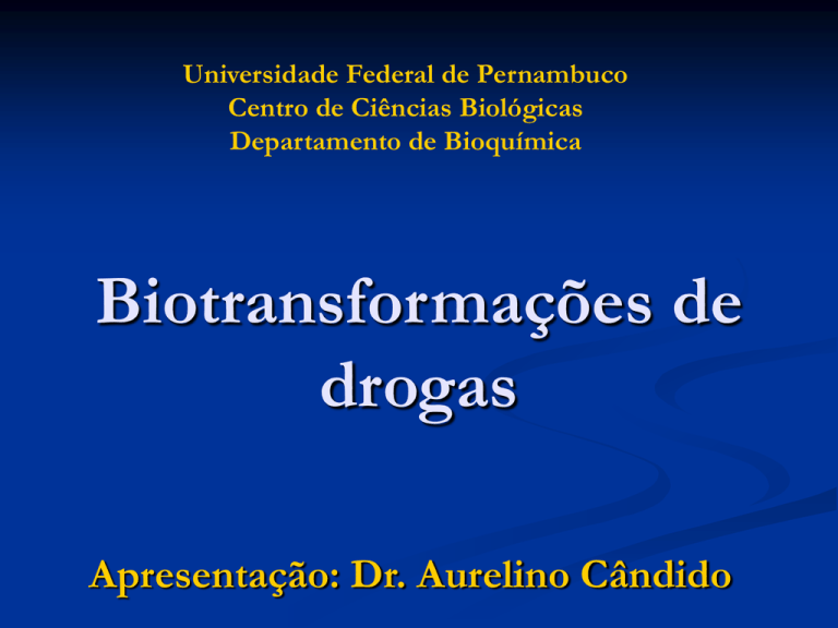 Universidade Federal de Pernambuco Centro de Ciências Biológicas Departamento de Bioquímica Biotransformações de drogas Apresentação: Dr. Aurelino Cândido Biotransformações de drogas Compostos Xenobióticos eliminação renal Apolares Biotransformação hepática Hidrossolúveis Apresentação: Dr. Aurelino Cândido Biotransformações de drogas Compostos Xenobióticos Apolares: A maioria dos compostos com atividade biológica Não estão ionizados no pH fisiológico Atravessam as membranas, mas apresentam uma intensa reabsorção tubular Apresentação: Dr. Aurelino Cândido Biotransformações de drogas Compostos Xenobióticos Biotransformação: Metabólitos mais hidrossolúveis Geralmente menor atividade que o fármaco original Ligam-se menos às proteínas plasmáticas Maior eliminação renal Apresentação: Dr. Aurelino Cândido Biotransformações de drogas O processo de biotransformação se divide em duas fases: Fase I: Oxidação Fase / Redução / hidrolise II: (conjugação) Glicuronidação / Acetilação / Metilação / Sulfoconjugação / Apresentação: Dr. Aurelino Cândido Biotransformações de drogas O processo de biotransformação se divide em duas fases: Fase I: Geralmente com diminuição da atividade (Prodrogaativação) (primodonafenobarbital) Fase II: (conjugação) Ocasionam invariavelmente inativação Apresentação: Dr. Aurelino Cândido Biotransformações de drogas O processo de biotransformação se divide em duas fases: Fase I: As oxidações são as reações de inativação da fase I mais freqüentes Ex: oxidação das cadeias laterais dos derivados do ácido barbitúrico (pentobarbital, fenobarbital, tiopental), formando um ácido e um alcool Apresentação: Dr. Aurelino Cândido Biotransformações de drogas O processo de biotransformação se divide em duas fases: Fase I: Hidroxilação: Ocorre frequentemente em anéis aromáticos Ex: ácido salicílico Apresentação: Dr. Aurelino Cândido Biotransformações de drogas O processo de biotransformação se divide em duas fases: Fase I: Desaminações Enzimas específicas (ex: monoaminaoxidase MAO) Substratos: feniletilamina, tiramina, dopamina, noradrenalina, adrenalina, normetafredina, hidroxitriotamina, serotonina. Apresentação: Dr. Aurelino Cândido Biotransformações de drogas O processo de biotransformação se divide em duas fases: Fase I: Oxidação com formação de sulfóxidos Substratos: neurolépticos, derivados de fenotiazina como clorpromazina e análgos Apresentação: Dr. Aurelino Cândido Biotransformações de drogas O processo de biotransformação se divide em duas fases: Fase I: Reduções: Nitrorredução NO2 NH2 Substrato: Cloranfenicol Ex: Apresentação: Dr. Aurelino Cândido Biotransformações de drogas O processo de biotransformação se divide em duas fases: Fase I: Reduções: Ex: Azorredução (-N=N-) Substrato: sulfocrisoidina sulfanilamida Apresentação: Dr. Aurelino Cândido Biotransformações de drogas O processo de biotransformação se divide em duas fases: Fase I: Reduções: Acetonas cíclicas Ex: Progesterona pregnanodiol Apresentação: Dr. Aurelino Cândido Biotransformações de drogas O processo de biotransformação se divide em duas fases: Fase I: Hidrólise: Freqüente na metabolização de ésteres e amidas Ex: Acetilcolina, ácido acetilsalicílico, procainamida. A hidrólise de amidas é mais lenta! Apresentação: Dr. Aurelino Cândido Biotransformações de drogas O processo de biotransformação se divide em duas fases: Fase I: Sistema microssomal hepático Proteínas catalíticas firmemente associadas às membranas do retículo endoplasmático Mais abundante no fígado O sistema mais encontrado é o do citocromo P-450 Apresentação: Dr. Aurelino Cândido Biotransformações de drogas Citocromo P-450 Apresentação: Dr. Aurelino Cândido Biotransformações de drogas Citocromo P-450 Apresentação: Dr. Aurelino Cândido Biotransformações de drogas Citocromo P-450 Ocorre em diversas isoformas Variância genética Hemeproteína com oxidase terminal Absorve luz no c.o. 450 nm Podem atuar com variados grupos prostéticos e coenzimas (e.g. NADH2) Apresentação: Dr. Aurelino Cândido Biotransformações de drogas Citocromo P-450 Susceptíveis a regulações por substratos Indução 1. Tipo Fenobarbital Estimula a síntese do citocromo P-450 redutase Proliferação do retículo endoplasmático do hepatócito e incremento da síntese protéica. Apresentação: Dr. Aurelino Cândido Biotransformações de drogas Citocromo P-450 Susceptíveis a regulações por substratos Indução 1. Tipo Hidrocarbonetos Policíclicos (ca) (3-metilcolantreno) Estimulam a síntese de outros citocromos, pp// P448 (atualmente P450 IA) Apresentação: Dr. Aurelino Cândido Biotransformações de drogas Citocromo P-450 Susceptíveis a regulações por substratos Inibição: Mecanismos complexos Exemplos: Cimetidina, trimetropin, cloranfenicol, amiodarona, etc. Apresentação: Dr. Aurelino Cândido Biotransformações de drogas Citocromo P-450 Constituição Acetiladores genética: rápidos Maior biodisponibilidade de enzimas acetiladoras Acetiladores lentos Exemplo: Isoniazida, hidralazina Apresentação: Dr. Aurelino Cândido Biotransformações de drogas Citocromo P-450 Constituição genética: Metiladores rápidos Metiladores lentos Apresentação: Dr. Aurelino Cândido