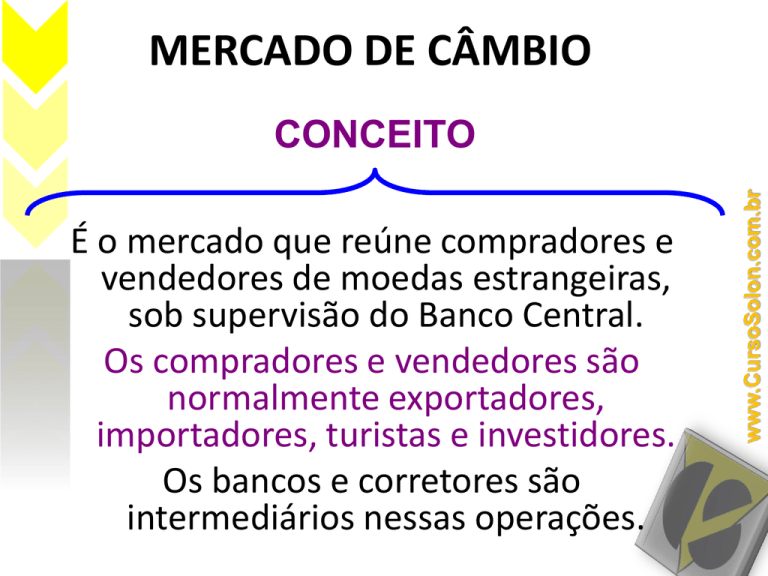 MERCADO DE CÂMBIO É o mercado que reúne compradores e vendedores de moedas estrangeiras, sob supervisão do Banco Central. Os compradores e vendedores são normalmente exportadores, importadores, turistas e investidores. Os bancos e corretores são intermediários nessas operações. www.CursoSolon.com.br CONCEITO Somente o BACEN autoriza outros órgãos a operar nesse mercado (normalmente bancos, casas de câmbio, hotéis de turismo, Correios, aeroportos etc). Pelos Correios é possível efetuar pagamentos e recebimentos de importação e exportação, através de vale postal, até o limite de US$ 50 mil. Responsabilidade: As instituições financeiras precisam indicar um diretor responsável por todas as suas operações de câmbio. www.CursoSolon.com.br INSTITUIÇÕES AUTORIZADAS A OPERAR MERCADO DE CÂMBIO VENDEDORES INSTITUIÇÃO FINANCEIRA CORRETOR COMPRADORES CORRETOR (Os corretores são eventuais participantes do Mercado de Câmbio) www.CursoSolon.com.br PARTICIPANTES DO MERCADO Operações em reais: as PF e as PJ podem realizar transferências internacionais, em reais, sem limitação de valores, desde que a outra parte seja agente autorizado pelo Bacen a operar no mercado de câmbio. Operações de arbitragem: compra e venda de moedas estrangeiras, a um só tempo e de diferentes nacionalidades, com a finalidade de obter lucro com a desigualdade momentânea entre as cotações. www.CursoSolon.com.br REMESSAS / OPERAÇÕES ESPECIAIS MERCADO DE CÂMBIO • Exportação TAXA DE COMPRA de câmbio. • Importação TAXA DE VENDA de câmbio. No Brasil, as taxas de câmbio são livremente pactuadas entre as partes contratantes, ou seja, entre o comprador ou vendedor da moeda estrangeira em relação ao agente autorizado pelo Banco Central a operar no mercado de câmbio. www.CursoSolon.com.br NEGOCIAÇÃO – NÃO ESQUEÇA: CONTRATOS DE CÂMBIO • Contrato de Compra (tipo 01): Emitido quando os bancos compram moedas estrangeiras. Portanto, o cliente bancário é o vendedor. • Contrato de Venda (tipo 02): Emitido quando os bancos vendem moedas estrangeiras. Portanto, o cliente bancário é o comprador. A celebração de Contrato de Câmbio é obrigatória para operações acima de US$ 3 mil (ou seu equivalente em outra moeda estrangeira). www.CursoSolon.com.br Seguem o mesmo princípio: MERCADO DE CÂMBIO www.CursoSolon.com.br Quanto à FORMA DE ENTREGA da moeda estrangeira, o câmbio pode ser classificado como: • Câmbio Manual: operações com moedas estrangeiras em espécie ou travelers cheques. • Câmbio Sacado: transações processadas por intermédio de contas bancárias, sem a movimentação física de dinheiro (non-cash). – O uso de cartão de crédito internacional, para pagamentos no exterior, enquadra-se na forma SACADA. – ATENÇÃO: Casas de Câmbio não podem atuar no mercado de câmbio sacado comercial (im/exportação). Travelers Cheques: Com a difusão dos cartões magnéticos (câmbio sacado), são poucas as operações atuais que envolvem os TC. www.CursoSolon.com.br MERCADO DE CÂMBIO MERCADO DE CÂMBIO • • Câmbio pronto (ou spot): Contratação cuja liquidação (transferência $ para o exterior ou do exterior) ocorra imediatamente ou até dois dias úteis. Câmbio futuro (ou a termo): Contratação cuja liquidação (transferência $ para o exterior ou do exterior) ocorra em maior prazo. A taxa de câmbio é previamente fixada e não pode ser alterada (os riscos de variação cambial são assumidos pelas partes). www.CursoSolon.com.br Quanto ao PRAZO DE ENTREGA da moeda estrangeira, o câmbio pode ser: MERCADO DE CÂMBIO • Mercado primário: Operações entre bancos e seus clientes. Mercado secundário (ou interbancário): Operações de bancos entre si. • – ATENÇÃO: O Banco Central intervém no mercado de câmbio através do mercado secundário, utilizando os bancos como dialers. www.CursoSolon.com.br CONTROLE CAMBIAL NO BRASIL: MERCADO DE CÂMBIO US$ 378 bilhões, dia 01/01/2013 US$ 352 bilhões, dia 01/01/2012 US$ 289 bi, 01/01/2011 Fonte: http://www.bcb.gov.br/?id=RESERVAS&ano=2013 www.CursoSolon.com.br Reservas internacionais brasileiras TAXAS DE CÂMBIO • Taxa Comercial (mercado de taxas livres): Uso em operações comerciais de im/exportação. • Taxa Turismo (mercado de taxas flutuantes): Uso em operações financeiras não comerciais (turismo, manutenção de residente, inscrição para participação de congressos etc). – Obs.: Na prática, há uma generalização no nome, passando ambas a se chamar apenas Câmbio Oficial. www.CursoSolon.com.br EM OPERAÇÕES OFICIAIS NO LIVRE MERCADO: TAXAS DE CÂMBIO • • Taxa Interbancária: Uso em operações financeiras entre os bancos. Taxa de Repasse e Cobertura: Uso em operações do BACEN com os bancos. EM OPERAÇÕES NÃO OFICIAIS: • Taxa de Mercado Paralelo: É o mercado não oficial (câmbio negro), via doleiros. Esse mercado existe justamente por não existir um mercado de câmbio inteiramente livre. www.CursoSolon.com.br EM OPERAÇÕES INTERNAS (NÃO AO PÚBLICO): MERCADO DE CÂMBIO SISCOMEX SISBACEN SISCOMEX - É o Sistema Integrado de Comércio Exterior, que interliga importadores, exportadores, despachantes aduaneiros, Receita Federal, portos e aeroportos alfandegados, agentes de carga internacional, depositários de cargas, entre outros. Destina-se ao registro de entrada e saída de mercadorias (im/exportação), além de controle de licenças de im/exportação. www.CursoSolon.com.br SISTEMAS DE CONTROLE MERCADO DE CÂMBIO SISCOMEX SISBACEN SISBACEN – Registra a movimentação financeira (compras e vendas de moedas estrangeiras), provenientes de importações e exportações de mercadorias, além de outras operações de remessas de moeda estrangeira do ou para o exterior. www.CursoSolon.com.br SISTEMAS DE CONTROLE MERCADO DE CÂMBIO www.CursoSolon.com.br SISCOMEX TESTES DE CONCURSO a) o ingresso ou saída de capitais estrangeiros no país não influencia o valor da
