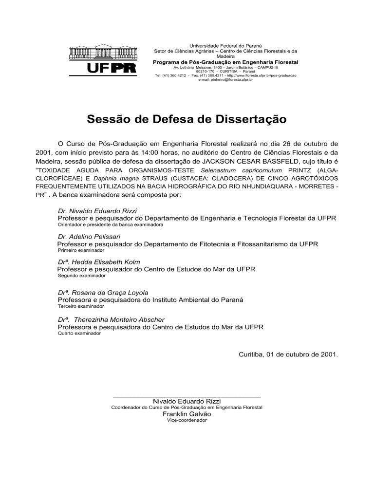 Universidade Federal do Paraná Setor de Ciências Agrárias – Centro de Ciências Florestais e da Madeira Programa de Pós-Graduação em Engenharia Florestal Av. Lothário Meissner, 3400 – Jardim Botânico – CAMPUS III 80210-170 - CURITIBA - Paraná Tel. (41) 360.4212 - Fax. (41) 360.4211 - http://www.floresta.ufpr.br/pos-graduacao e-mail: [email protected] Sessão de Defesa de Dissertação O Curso de Pós-Graduação em Engenharia Florestal realizará no dia 26 de outubro de 2001, com início previsto para às 14:00 horas, no auditório do Centro de Ciências Florestais e da Madeira, sessão pública de defesa da dissertação de JACKSON CESAR BASSFELD, cujo título é “TOXIDADE AGUDA PARA ORGANISMOS-TESTE Selenastrum capricornutum PRINTZ (ALGACLOROFÍCEAE) E Daphnia magna STRAUS (CUSTACEA: CLADOCERA) DE CINCO AGROTÓXICOS FREQUENTEMENTE UTILIZADOS NA BACIA HIDROGRÁFICA DO RIO NHUNDIAQUARA - MORRETES PR” . A banca examinadora será composta por: Dr. Nivaldo Eduardo Rizzi Professor e pesquisador do Departamento de Engenharia e Tecnologia Florestal da UFPR Orientador e presidente da banca examinadora Dr. Adelino Pelissari Professor e pesquisador do Departamento de Fitotecnia e Fitossanitarismo da UFPR Primeiro examinador Drª. Hedda Elisabeth Kolm Professor e pesquisador do Centro de Estudos do Mar da UFPR Segundo examinador Drª. Rosana da Graça Loyola Professora e pesquisadora do Instituto Ambiental do Paraná Terceiro examinador Drª. Therezinha Monteiro Abscher Professora e pesquisadora do Centro de Estudos do Mar da UFPR Quarto examinador Curitiba, 01 de outubro de 2001. ___________________________________ Nivaldo Eduardo Rizzi Coordenador do Curso de Pós-Graduação em Engenharia Florestal Franklin Galvão Vice-coordenador RESUMO O interesse pelos efeitos adversos decorrentes da utilização dos agrotóxicos tem crescido rapidamente, sobretudo devido aos possíveis riscos ambientais para os diferentes tipos de ecossistemas aquáticos. A disponibilidade de água limpa tem sido reconhecida como a mais crítica de todas as questões de segurança humana que o mundo enfrentará no próximo quarto de século. Com este trabalho, propõe-se testar, por intermédio dos métodos reconhecidos internacionalmente no campo da toxicologia aquática, a toxicidade aguda de cinco agrotóxicos (Roundup, Gramoxone, Cefanol, Isatalonil 500 SC e Dithane PM) para os organismos-teste - Selenastrum capricornutum (alga) e Daphnia magna (microcrustáceo). Os resultados obtidos indicaram uma classificação moderadamente tóxica, exceto de um agrotóxico para o organismo-teste Selenastrum capricornutum, que indicou a classificação de um produto praticamente não-tóxico. A partir destas análises, procurou-se desenvolver uma abordagem ecossistêmica para a Bacia Hidrográfica do Rio Nhundiaquara em Morretes-Paraná, onde destacou-se a implicação resultante do sistema de utilização dos agrotóxicos nos possíveis efeitos sobre o meio ambiente aquático e o contexto crítico da legislação Federal de Agrotóxicos e afins. A necessidade de estudos multidisciplinares futuros se faz evidente para uma melhor compreensão acerca das interações relativas às dimensões ecológicas, socioeconômicas e culturais. Palavras-chave: Agrotóxicos; Legislação; Bioensaios; Ecossistema Aquático; Ecologia Sistêmica.