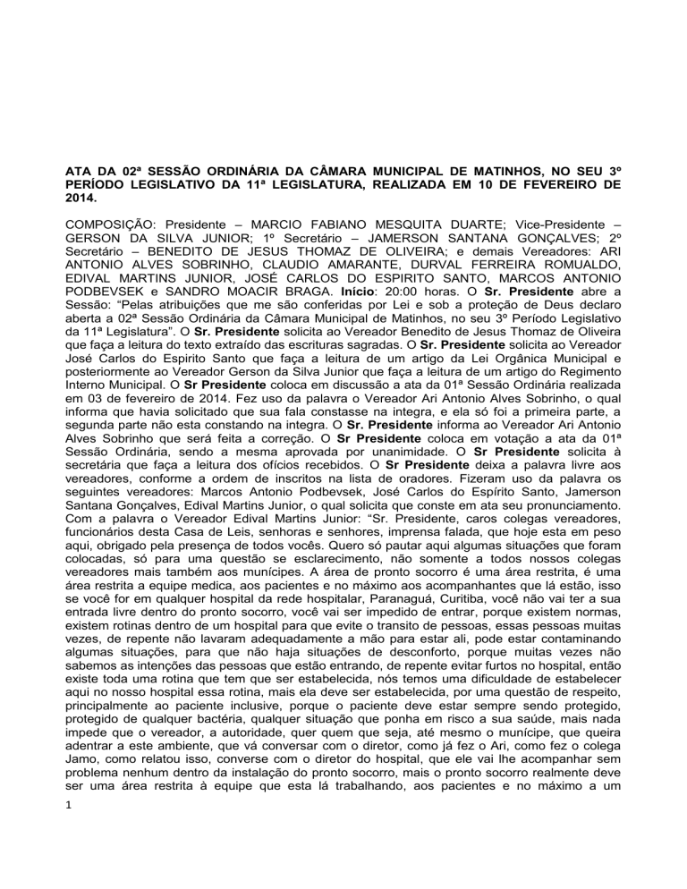 ATA DA 02ª SESSÃO ORDINÁRIA DA CÂMARA MUNICIPAL DE MATINHOS, NO SEU 3º PERÍODO LEGISLATIVO DA 11ª LEGISLATURA, REALIZADA EM 10 DE FEVEREIRO DE 2014. COMPOSIÇÃO: Presidente – MARCIO FABIANO MESQUITA DUARTE; Vice-Presidente – GERSON DA SILVA JUNIOR; 1º Secretário – JAMERSON SANTANA GONÇALVES; 2º Secretário – BENEDITO DE JESUS THOMAZ DE OLIVEIRA; e demais Vereadores: ARI ANTONIO ALVES SOBRINHO, CLAUDIO AMARANTE, DURVAL FERREIRA ROMUALDO, EDIVAL MARTINS JUNIOR, JOSÉ CARLOS DO ESPIRITO SANTO, MARCOS ANTONIO PODBEVSEK e SANDRO MOACIR BRAGA. Início: 20:00 horas. O Sr. Presidente abre a Sessão: “Pelas atribuições que me são conferidas por Lei e sob a proteção de Deus declaro aberta a 02ª Sessão Ordinária da Câmara Municipal de Matinhos, no seu 3º Período Legislativo da 11ª Legislatura”. O Sr. Presidente solicita ao Vereador Benedito de Jesus Thomaz de Oliveira que faça a leitura do texto extraído das escrituras sagradas. O Sr. Presidente solicita ao Vereador José Carlos do Espirito Santo que faça a leitura de um artigo da Lei Orgânica Municipal e posteriormente ao Vereador Gerson da Silva Junior que faça a leitura de um artigo do Regimento Interno Municipal. O Sr Presidente coloca em discussão a ata da 01ª Sessão Ordinária realizada em 03 de fevereiro de 2014. Fez uso da palavra o Vereador Ari Antonio Alves Sobrinho, o qual informa que havia solicitado que sua fala constasse na integra, e ela só foi a primeira parte, a segunda parte não esta constando na integra. O Sr. Presidente informa ao Vereador Ari Antonio Alves Sobrinho que será feita a correção. O Sr Presidente coloca em votação a ata da 01ª Sessão Ordinária, sendo a mesma aprovada por unanimidade. O Sr Presidente solicita à secretária que faça a leitura dos ofícios recebidos. O Sr Presidente deixa a palavra livre aos vereadores, conforme a ordem de inscritos na lista de oradores. Fizeram uso da palavra os seguintes vereadores: Marcos Antonio Podbevsek, José Carlos do Espírito Santo, Jamerson Santana Gonçalves, Edival Martins Junior, o qual solicita que conste em ata seu pronunciamento. Com a palavra o Vereador Edival Martins Junior: “Sr. Presidente, caros colegas vereadores, funcionários desta Casa de Leis, senhoras e senhores, imprensa falada, que hoje esta em peso aqui, obrigado pela presença de todos vocês. Quero só pautar aqui algumas situações que foram colocadas, só para uma questão se esclarecimento, não somente a todos nossos colegas vereadores mais também aos munícipes. A área de pronto socorro é uma área restrita, é uma área restrita a equipe medica, aos pacientes e no máximo aos acompanhantes que lá estão, isso se você for em qualquer hospital da rede hospitalar, Paranaguá, Curitiba, você não vai ter a sua entrada livre dentro do pronto socorro, você vai ser impedido de entrar, porque existem normas, existem rotinas dentro de um hospital para que evite o transito de pessoas, essas pessoas muitas vezes, de repente não lavaram adequadamente a mão para estar ali, pode estar contaminando algumas situações, para que não haja situações de desconforto, porque muitas vezes não sabemos as intenções das pessoas que estão entrando, de repente evitar furtos no hospital, então existe toda uma rotina que tem que ser estabelecida, nós temos uma dificuldade de estabelecer aqui no nosso hospital essa rotina, mais ela deve ser estabelecida, por uma questão de respeito, principalmente ao paciente inclusive, porque o paciente deve estar sempre sendo protegido, protegido de qualquer bactéria, qualquer situação que ponha em risco a sua saúde, mais nada impede que o vereador, a autoridade, quer quem que seja, até mesmo o munícipe, que queira adentrar a este ambiente, que vá conversar com o diretor, como já fez o Ari, como fez o colega Jamo, como relatou isso, converse com o diretor do hospital, que ele vai lhe acompanhar sem problema nenhum dentro da instalação do pronto socorro, mais o pronto socorro realmente deve ser uma área restrita à equipe que esta lá trabalhando, aos pacientes e no máximo a um 1 acompanhante se permitido, se for um menor de idade, ou se for um idoso maior de sessenta e cinco anos, essa é uma questão de lei e nós como vereadores devemos respeitar também esta lei hospitalar que deve acontecer. Houve também uma outra situação que foi falado..., em relação ao ar condicionado que foi falado, eu já estive varias vezes conversando com o Prefeito, com a Primeira-Dama e o Prefeito me garantiu em uma das ultimas conversas que ele já assinou uma autorização de licitação para que seja feito todo o sistema de condicionamento de ar dentro do hospital, para que haja um sistema climatizado e principalmente naquela área dos corredores aonde os pacientes realmente esperam, realmente aquela área é uma área bastante desconfortável, muito quente, é uma entrada, tanto para parte ambulatorial como para a parte de pronto socorro, então é realmente muito desconfortável porque os ar condicionados são do tipo antigo que tira o ar e joga para fora, dentro do corredor, despejando realmente na cabeça daqueles que estão esperando, então realmente concordo com o parecer do nosso colega vereador Zé da Ecler, só que já foram tomadas as providencias nestes sentido para que então se tenha todo este cuidado para com os nossos pacientes. Quero só deixar aqui mais uma vez a disposição este Vereador para todos que necessitarem dos nossos trabalhos, a nossa chefe de gabinete esta ai a Ana Paula e quero colocar me sempre a disposição em qualquer situação, dentro do hospital, no consultório aqui no nosso gabinete para que vocês tenham a devida atenção desta Casa de Leis. Obrigado”. Dando continuidade a palavra livre, ainda fizeram o uso da palavra os seguintes vereadores: Claudio Amarante, Benedito de Jesus Thomaz de Oliveira que pede que seu pronunciamento conste em ata. “Excelentíssimo senhor Presi