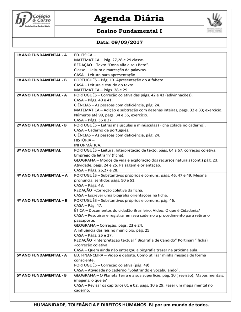 Agenda Diária Ensino Fundamental I Data: 09/03/2017 1º ANO FUNDAMENTAL - A 1º ANO FUNDAMENTAL - B 2º ANO FUNDAMENTAL - A 2º ANO FUNDAMENTAL - B 3º ANO FUNDAMENTAL 4º ANO FUNDAMENTAL – A 4º ANO FUNDAMENTAL – B 5º ANO FUNDAMENTAL - A 5º ANO FUNDAMENTAL - B ED. FÍSICA – MATEMÁTICA – Pág. 27,28 e 29 classe. REDAÇÃO – Texto “Dona alfa e seu Beto”. Classe – Leitura e marcação de palavras. CASA – Leitura para apresentação. PORTUGUÊS – Pág. 13. Apresentação do Alfabeto. CASA – Leitura e estudo do texto. MATEMÁTICA – Págs. 28 e 29. PORTUGUÊS – Correção coletiva das págs. 42 e 43 (adivinhações). CASA – Págs. 40 e 41. CIÊNCIAS – As pessoas com deficiência, pág. 24. MATEMÁTICA – Adição e subtração com dezenas inteiras, págs. 32 e 33; exercício. Números até 99, págs. 34 e 35, exercício. CASA – Págs. 36 e 37. PORTUGUÊS – Letras maiúsculas e minúsculas (Ficha colada no caderno). CASA – Caderno de português. CIÊNCIAS – As pessoas com deficiência, pág. 24. HISTÓRIA – INFORMÁTICA. PORTUGUÊS – Leitura. Interpretação de texto, págs. 64 a 67, correção coletiva; Emprego da letra ‘h’ (ficha). GEOGRAFIA – Modos de vida e exploração dos recursos naturais (cont.) pág. 23. Atividade, págs. 24 e 25. Paisagem e orientação. CASA – Págs. 26,27 e 28. PORTUGUÊS – Substantivos próprios e comuns, págs. 46, 47 e 49. Mesma pronuncia, sentidos págs. 50 e 51. CASA – Págs. 48. REDAÇÃO -Correção coletiva da ficha. CASA – Escrever uma biografia orientações na ficha. PORTUGUÊS – Substantivos próprios e comuns, pág. 46. CASA – Pág. 47. ÉTICA – Documentos do cidadão Brasileiro. Vídeo: O que é Cidadania/ CASA – Pesquisar e registrar em seu caderno o procedimento para retirar o passaporte. GEOGRAFIA – Correção, págs. 23 e 24. A influência das leis no município, pág. 25. CASA – Págs. 26 e 27. REDAÇÃO -Interpretação textual “ Biografia de Candido” Portinari “ ficha) +correção coletiva. CASA – Quem ainda não entregou a biografia trazer na próxima aula. ED. FINANCEIRA – Vídeo e debate. Como utilizar minha mesada de forma consciente. PORTUGUÊS – Correção coletiva (pág. 49) CASA – Atividade no caderno “Soletrando e vocabulando”. GEOGRAFIA – O Planeta Terra e a sua superfície, pág. 10 ( revisão); Mapas mentais: imagens, o que é? CASA – Revisar os capítulos 01 e 02, págs. 10 a 29; Fazer um mapa mental no caderno. HUMANIDADE, TOLERÂNCIA E DIREITOS HUMANOS. BJ por um mundo de todos. PORTUGUÊS – Correção coletiva (pág. 49) CASA – Atividade no caderno “Soletrando e vocabulando”. Página 2