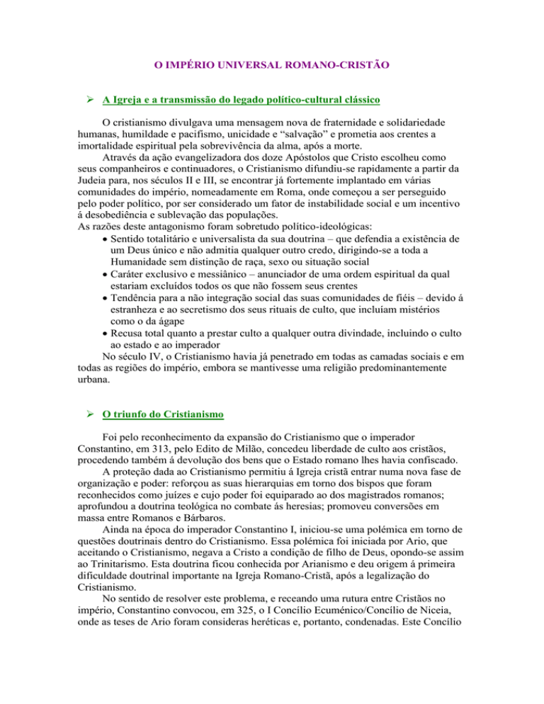 O IMPÉRIO UNIVERSAL ROMANO-CRISTÃO A Igreja e a transmissão do legado político-cultural clássico O cristianismo divulgava uma mensagem nova de fraternidade e solidariedade humanas, humildade e pacifismo, unicidade e “salvação” e prometia aos crentes a imortalidade espiritual pela sobrevivência da alma, após a morte. Através da ação evangelizadora dos doze Apóstolos que Cristo escolheu como seus companheiros e continuadores, o Cristianismo difundiu-se rapidamente a partir da Judeia para, nos séculos II e III, se encontrar já fortemente implantado em várias comunidades do império, nomeadamente em Roma, onde começou a ser perseguido pelo poder político, por ser considerado um fator de instabilidade social e um incentivo á desobediência e sublevação das populações. As razões deste antagonismo foram sobretudo político-ideológicas: Sentido totalitário e universalista da sua doutrina – que defendia a existência de um Deus único e não admitia qualquer outro credo, dirigindo-se a toda a Humanidade sem distinção de raça, sexo ou situação social Caráter exclusivo e messiânico – anunciador de uma ordem espiritual da qual estariam excluídos todos os que não fossem seus crentes Tendência para a não integração social das suas comunidades de fiéis – devido á estranheza e ao secretismo dos seus rituais de culto, que incluíam mistérios como o da ágape Recusa total quanto a prestar culto a qualquer outra divindade, incluindo o culto ao estado e ao imperador No século IV, o Cristianismo havia já penetrado em todas as camadas sociais e em todas as regiões do império, embora se mantivesse uma religião predominantemente urbana. O triunfo do Cristianismo Foi pelo reconhecimento da expansão do Cristianismo que o imperador Constantino, em 313, pelo Edito de Milão, concedeu liberdade de culto aos cristãos, procedendo também á devolução dos bens que o Estado romano lhes havia confiscado. A proteção dada ao Cristianismo permitiu á Igreja cristã entrar numa nova fase de organização e poder: reforçou as suas hierarquias em torno dos bispos que foram reconhecidos como juízes e cujo poder foi equiparado ao dos magistrados romanos; aprofundou a doutrina teológica no combate ás heresias; promoveu conversões em massa entre Romanos e Bárbaros. Ainda na época do imperador Constantino I, iniciou-se uma polémica em torno de questões doutrinais dentro do Cristianismo. Essa polémica foi iniciada por Ario, que aceitando o Cristianismo, negava a Cristo a condição de filho de Deus, opondo-se assim ao Trinitarismo. Esta doutrina ficou conhecida por Arianismo e deu origem á primeira dificuldade doutrinal importante na Igreja Romano-Cristã, após a legalização do Cristianismo. No sentido de resolver este problema, e receando uma rutura entre Cristãos no império, Constantino convocou, em 325, o I Concílio Ecuménico/Concílio de Niceia, onde as teses de Ario foram consideras heréticas e, portanto, condenadas. Este Concílio teve uma importância especial, porque as perseguições aos cristãos tinham recentemente terminado. No entanto, esta controvérsia só foi oficialmente ultrapassada no Concílio de Constantinopla, em 6381, convocado pelo imperador Teodósio I. foi este imperador que, em 380, através do Edito de Salónica, já impusera o Cristianismo como religião oficial e única do Estado Romano, proibindo o Arianismo. Assim, numa época em que o poder dos imperadores foi enfraquecendo até á sua deposição definitiva no ocidente, em 476, foi o poder espiritual da Igreja que, sobrepondo-se e substituindo o poder imperial desfeito, deu continuidade ao seu legado político-cultural no império fragmentado pelos Bárbaros. Prenúncios de uma nova geografia política: a presença dos “bárbaros” no Império Extraordinariamente dilatado pelas conquistas, o Império Romano começou a dar sinais de enfraquecimento a partir do século II. A corrupção e a dissolução dos costumes era notória nas elites A instabilidade vivida neste período foi muitas vezes aproveitada para tentativas de emancipação por parte das províncias mais rebeldes e por parte dos povos “bárbaros” que se estendiam para lá das fronteiras e tentavam pequenas incursões de saque e razia nas terras do império. Os problemas militares desorganizavam a vida económica e agravavam os impostos, descontentando a plebe. Para melhor controlar o poder, Diocleciano dividiu o império em duas grandes regiões administrativas e atribuiu o governo de cada uma a um imperador com o título de “augusto” e a um outro com o título de “César”, criando assim a tetrarquia imperial. Diocleciano e o “César” ficaram com as províncias da metade oriental do império; Maximiano e o seu “César” com as do ocidente. Foi o começo de uma série de divisões e reunificações administrativas que haveriam de culminar com a divisão definitiva do império, em 395, em Império Romano do ocidente e em Império romano do Oriente. Estas divisões não obviaram, contudo, os ataques dos “bárbaros”. Pressionados, talvez, pela movimentação dos Hunos para ocidente, estes povos começaram a atacar o império no século III, causando sérios problemas á defesa e administração romanos. Restabelecida a ordem pelas autoridades romanas, muitos foram autorizados a ficar no império, mediante contratos de pacificação e pagamento de tributos8invasão pacífica). No entanto, as grandes invasões dos séculos IV e V acabaram por descontrolar a administração romana e puseram fim á metade ocidental do império, quando Odoacro tomou Roma e destituiu o imperador do Ocidente, em 476. Era o fim da época clássica e o começa de uma nova era – a Idade Média. A IDENTIDADE CIVILIZACIONAL DA EUROPA OCIDENTAL Poderes e crenças – multiplicidade e unidade A multiplicidade de poderes e crenças no espaço europeu teve origem particularmente nas profundas mutações políticas, 