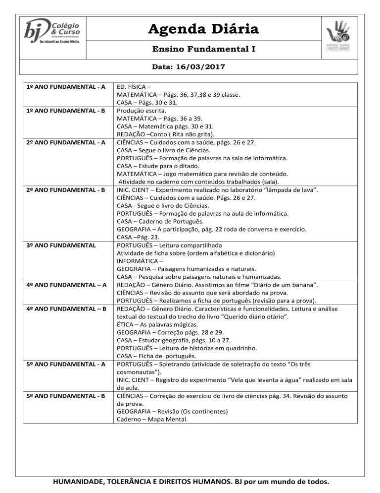Agenda Diária Ensino Fundamental I Data: 16/03/2017 1º ANO FUNDAMENTAL - A 1º ANO FUNDAMENTAL - B 2º ANO FUNDAMENTAL - A 2º ANO FUNDAMENTAL - B 3º ANO FUNDAMENTAL 4º ANO FUNDAMENTAL – A 4º ANO FUNDAMENTAL – B 5º ANO FUNDAMENTAL - A 5º ANO FUNDAMENTAL - B ED. FÍSICA – MATEMÁTICA – Págs. 36, 37,38 e 39 classe. CASA – Págs. 30 e 31. Produção escrita. MATEMÁTICA – Págs. 36 a 39. CASA – Matemática págs. 30 e 31. REDAÇÃO –Conto ( Rita não grita). CIÊNCIAS – Cuidados com a saúde, págs. 26 e 27. CASA – Segue o livro de Ciências. PORTUGUÊS – Formação de palavras na sala de informática. CASA – Estude para o ditado. MATEMÁTICA – Jogo matemático para revisão de conteúdo. Atividade no caderno com conteúdos trabalhados (sala). INIC. CIENT – Experimento realizado no laboratório “lâmpada de lava”. CIÊNCIAS – Cuidados com a saúde. Págs. 26 e 27. CASA - Segue o livro de Ciências. PORTUGUÊS – Formação de palavras na aula de informática. CASA – Caderno de Português. GEOGRAFIA – A participação, pág. 22 roda de conversa e exercício. CASA –Pág. 23. PORTUGUÊS – Leitura compartilhada Atividade de ficha sobre (ordem alfabética e dicionário) INFORMÁTICA – GEOGRAFIA – Paisagens humanizadas e naturais. CASA – Pesquisa sobre paisagens naturais e humanizadas. REDAÇÃO – Gênero Diário. Assistimos ao filme “Diário de um banana”. CIÊNCIAS – Revisão do assunto que será abordado na prova. PORTUGUÊS – Realizamos a ficha de português (revisão para a prova). REDAÇÃO – Gênero Diário. Características e funcionalidades. Leitura e análise textual do textual do trecho do livro “Querido diário otário”. ÉTICA – As palavras mágicas. GEOGRAFIA – Correção págs. 28 e 29. CASA – Estudar geografia, págs. 10 a 27. PORTUGUÊS – Leitura de histórias em quadrinho. CASA – Ficha de português. PORTUGUÊS – Soletrando (atividade de soletração do texto “Os três cosmonautas”). INIC. CIENT – Registro do experimento “Vela que levanta a água” realizado em sala de aula. CIÊNCIAS – Correção do exercício do livro de ciências pág. 34. Revisão do assunto da prova. GEOGRAFIA – Revisão (Os continentes) Caderno – Mapa Mental. HUMANIDADE, TOLERÂNCIA E DIREITOS HUMANOS. BJ por um mundo de todos.