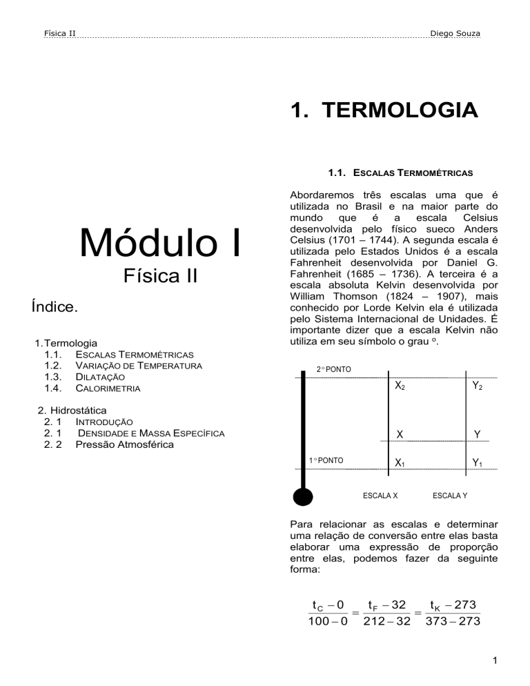 Física II Diego Souza 1. TERMOLOGIA 1.1. ESCALAS TERMOMÉTRICAS Módulo I Física II Índice. 1. Termologia 1.1. ESCALAS TERMOMÉTRICAS 1.2. VARIAÇÃO DE TEMPERATURA 1.3. DILATAÇÃO 1.4. CALORIMETRIA Abordaremos três escalas uma que é utilizada no Brasil e na maior parte do mundo que é a escala Celsius desenvolvida pelo físico sueco Anders Celsius (1701 – 1744). A segunda escala é utilizada pelo Estados Unidos é a escala Fahrenheit desenvolvida por Daniel G. Fahrenheit (1685 – 1736). A terceira é a escala absoluta Kelvin desenvolvida por William Thomson (1824 – 1907), mais conhecido por Lorde Kelvin ela é utilizada pelo Sistema Internacional de Unidades. É importante dizer que a escala Kelvin não utiliza em seu símbolo o grau o. 2ºPONTO 2. Hidrostática 2. 1 INTRODUÇÃO 2. 1 DENSIDADE E MASSA ESPECÍFICA 2. 2 Pressão Atmosférica 1ºPONTO X2 Y2 X Y X1 Y1 ESCALA X ESCALA Y Para relacionar as escalas e determinar uma relação de conversão entre elas basta elaborar uma expressão de proporção entre elas, podemos fazer da seguinte forma: tC 0 t 32 t 273 F K 100 0 212 32 373 273 1 Física II Diego Souza Kelvin. ou ainda: tC t 32 t K 273 F 100 180 100 Dividindo todos os denominadores por 20, temos: t C t F 32 t K 273 5 9 5 Para utilizar essa expressão basta tomarmos duas delas, por exemplo, se tivermos uma temperatura de 72oF quanto seria em oC ? Solução Dados: tF = 72oF; tC = ? t C 72 32 5 9 Já a Escala Fahrenheit é dividida em 180 partes e não corresponde a mesma variação nas outras duas escalas: t F 212 32 180 o F Relação de Conversão de Variações: t C t F t K 5 9 5 Para entender melhor façamos um exemplo. Uma variação de 20oC corresponde a uma variação de quanto nas escalas Celsius e Kelvin Dados: tC = 20oC; tF = ?; tK = ? Solução 5 x 40 9 20 t F 180 t F 5 9 => 5 200 22,2 o C 9 t C t K 5 5 1.2. VARIAÇÃO DE TEMPERATURA t C t K tC tC É importante notar a diferença da medição de uma temperatura e a medição da variação da temperatura, podemos notar que as escalas Celsius e Kelvin possuem a mesma variação de temperatura 100oC, observe: Variação da Escala Celsius: t C 100 0 100 o C Variação da Escala Kelvin: t K 373 273 100 K OBS: Basta notar que as duas escalas são divididas em 100 partes, portanto uma certa variação de temperatura na escala Celsius será igual à variação na escala t K 20 K 1.3. DILATAÇÃO DILATAÇÃO TÉRMICA Neste capítulo discutiremos como os corpos se dilatam após serem aquecidos. È importante sabermos que isto é um fenômeno que está em nosso dia-a-dia. Os trilhos do trem que se dilatam, os cabos elétricos, as placas de concreto de um viaduto e outros casos. Existe também a dilatação nos líquidos e estudaremos suas particularidades neste capítulo. DILATAÇÃO TÉRMICA DOS SÓLIDOS 2 Física II Diego Souza Começaremos discutindo a dilatação em sólidos. Para um estudo mais detalhado podemos separar essa dilatação em três tipos: dilatação linear (aquela que ocorre em apenas uma dimensão), dilatação superficial (ocorre em duas dimensões) e dilatação volumétrica (ocorre em três dimensões). DILATAÇÃO LINEAR Quando estamos estudando a dilatação de um fio, teremos a ocorrência predominante de um aumento no comprimento desse fio. Essa é a característica da dilatação linear. Imaginemos uma barra de comprimento inicial Lo e temperatura inicial to. Ao aquecermos esta barra para uma temperatura t ela passará a ter um novo comprimento L. Vejamos o esquema: L Lo . . t Onde: Lo............comprimento inicial; .............coeficiente de dilatação linear; t............variação da temperatura (t – to). O coeficiente de dilatação linear é a grandeza que indica o material utilizado. Cada material possui um diferente. Ele é o fator determinante para escolhermos um material que não se dilata facilmente ou o contrário. É fácil demonstrar que (faça você): A dilatação é dada por: L = L - Lo Unidades Usuais: Existe uma outra forma de determinar esta dilatação ? Para responder a questão devemos avaliar outra questão: o comprimento inicial; a variação da temperatura; o tipo do material. Logo temos que: Lo............centímetro (cm); .............oC-1; t............Celsius (oC). anterior Do que depende a dilatação linear de uma barra ? Poderíamos citar: L Lo 1 + . t DILATAÇÃO SUPERFICIAL Quando estamos estudando a dilatação de uma placa de concreto, teremos a ocorrência predominante de um aumento na área dessa placa. Essa é a característica da dilatação superficial. Imaginemos uma placa de área inicial Ao e temperatura inicial to. Ao aquecermos esta placa para uma temperatura t ela passará a ter uma nova área A. Vejamos o esquema: 3 Física II Diego Souza A Ao 1 + . t A dilatação é dada por: A = A - Ao Existe uma outra forma de determinar esta dilatação ? Unidades Usuais: Ao............centímetro quadrado (cm2); .............oC-1; t............Celsius (oC). DILATAÇÃO VOLUMÉTRICA Para responder a questão devemos avaliar outra questão: anterior Do que depende a dilatação superficial de uma placa ? Poderíamos citar: a área inicial; a variação da temperatura; o tipo do material. Quando estamos estudando a dilatação de um paralelepípedo, teremos a ocorrência predominante de um aumento no volume desse corpo. Essa é a característica da dilatação volumétrica. Imaginemos um paralelepípedo de volume inicial Vo e temperatura inicial to. Ao aquecermos este corpo para uma temperatura t ele passará a ter um novo volume V. Vejamos o esquema: Logo temos que: A dilatação é dada por: A Ao . . t V = V - Vo Onde: Existe uma outra forma de determinar esta dilatação ? Ao............área inicial; .............coeficiente de dilatação superficial; t............variação da temperatura (t – to). O coeficiente de dilatação superficial é a grandeza que indica o material utilizado. A relação do coeficiente de dilatação superficial com 