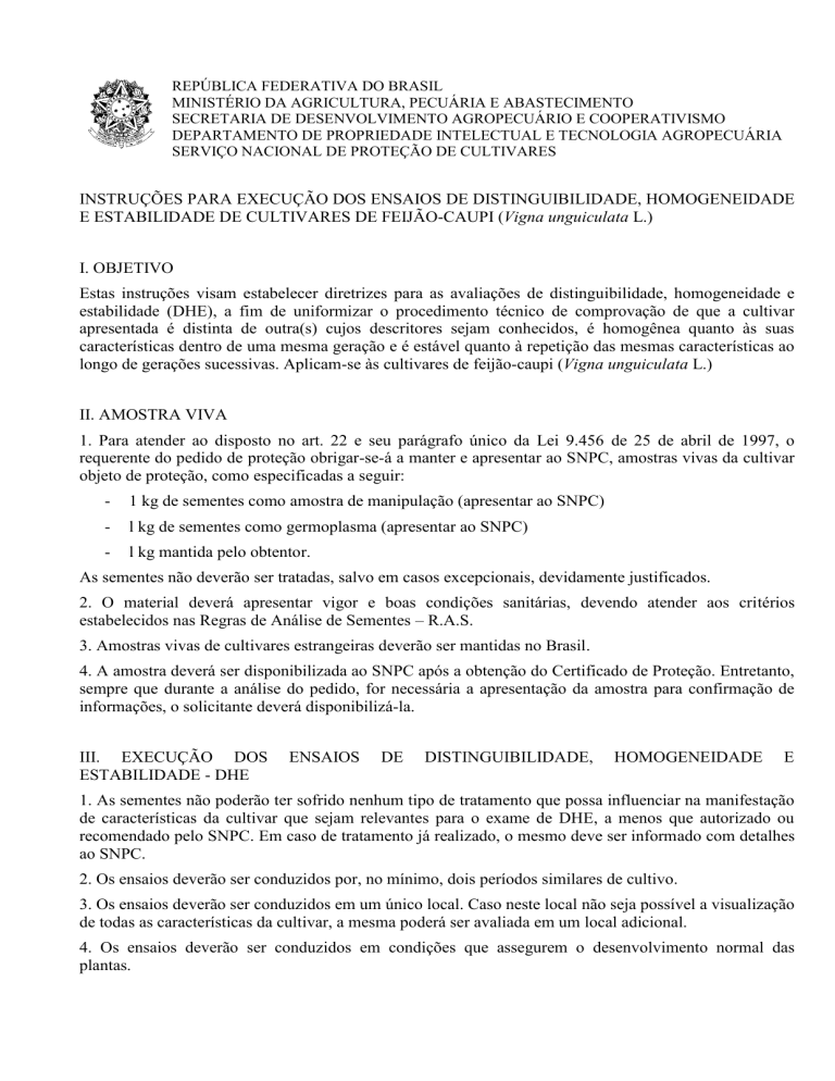 REPÚBLICA FEDERATIVA DO BRASIL MINISTÉRIO DA AGRICULTURA, PECUÁRIA E ABASTECIMENTO SECRETARIA DE DESENVOLVIMENTO AGROPECUÁRIO E COOPERATIVISMO DEPARTAMENTO DE PROPRIEDADE INTELECTUAL E TECNOLOGIA AGROPECUÁRIA SERVIÇO NACIONAL DE PROTEÇÃO DE CULTIVARES INSTRUÇÕES PARA EXECUÇÃO DOS ENSAIOS DE DISTINGUIBILIDADE, HOMOGENEIDADE E ESTABILIDADE DE CULTIVARES DE FEIJÃO-CAUPI (Vigna unguiculata L.) I. OBJETIVO Estas instruções visam estabelecer diretrizes para as avaliações de distinguibilidade, homogeneidade e estabilidade (DHE), a fim de uniformizar o procedimento técnico de comprovação de que a cultivar apresentada é distinta de outra(s) cujos descritores sejam conhecidos, é homogênea quanto às suas características dentro de uma mesma geração e é estável quanto à repetição das mesmas características ao longo de gerações sucessivas. Aplicam-se às cultivares de feijão-caupi (Vigna unguiculata L.) II. AMOSTRA VIVA 1. Para atender ao disposto no art. 22 e seu parágrafo único da Lei 9.456 de 25 de abril de 1997, o requerente do pedido de proteção obrigar-se-á a manter e apresentar ao SNPC, amostras vivas da cultivar objeto de proteção, como especificadas a seguir: - 1 kg de sementes como amostra de manipulação (apresentar ao SNPC) - l kg de sementes como germoplasma (apresentar ao SNPC) - l kg mantida pelo obtentor. As sementes não deverão ser tratadas, salvo em casos excepcionais, devidamente justificados. 2. O material deverá apresentar vigor e boas condições sanitárias, devendo atender aos critérios estabelecidos nas Regras de Análise de Sementes – R.A.S. 3. Amostras vivas de cultivares estrangeiras deverão ser mantidas no Brasil. 4. A amostra deverá ser disponibilizada ao SNPC após a obtenção do Certificado de Proteção. Entretanto, sempre que durante a análise do pedido, for necessária a apresentação da amostra para confirmação de informações, o solicitante deverá disponibilizá-la. III. EXECUÇÃO DOS ESTABILIDADE - DHE ENSAIOS DE DISTINGUIBILIDADE, HOMOGENEIDADE E 1. As sementes não poderão ter sofrido nenhum tipo de tratamento que possa influenciar na manifestação de características da cultivar que sejam relevantes para o exame de DHE, a menos que autorizado ou recomendado pelo SNPC. Em caso de tratamento já realizado, o mesmo deve ser informado com detalhes ao SNPC. 2. Os ensaios deverão ser conduzidos por, no mínimo, dois períodos similares de cultivo. 3. Os ensaios deverão ser conduzidos em um único local. Caso neste local não seja possível a visualização de todas as características da cultivar, a mesma poderá ser avaliada em um local adicional. 4. Os ensaios deverão ser conduzidos em condições que assegurem o desenvolvimento normal das plantas. 5. Os métodos recomendados de observação das características são indicados na primeira coluna da Tabela de características, segundo a legenda abaixo: - MG: Mensuração única de um grupo de plantas ou partes de plantas; - MI: Mensurações de um número de plantas ou partes de plantas, individualmente; - VG: Avaliação visual única de um grupo de plantas ou partes dessas plantas; - VI: Avaliações visuais em plantas ou partes dessas plantas, individualmente. 6. Cada teste deve ter um mínimo de 80 plantas, divididos em duas ou mais repetições. 7. A menos que seja indicado de outro modo, as observações devem ser feitas em 20 plantas ou partes de 20 plantas. 8. O tamanho das parcelas deverá possibilitar que plantas, ou suas partes, possam ser removidas para avaliações sem que isso prejudique as observações que venham a ser feitas até o final do ciclo de crescimento. 9. Para a descrição da cultivar as avaliações deverão ser realizadas nas plantas com as expressões típicas, sendo desconsideradas aquelas com expressões atípicas. 10. Para a avaliação de Homogeneidade devem ser levadas em consideração todas as plantas do ensaio. Deve-se aplicar a população padrão de 1% e a probabilidade de aceitação de, pelo menos, 95%. No caso de uma amostra com 80 plantas, serão permitidas, no máximo, 2 plantas atípicas. 11. Testes adicionais para a avaliação de outras características relevantes poderão ser estabelecidos. IV. SINAIS CONVENCIONAIS (+) e (a)-(c): Ver item “OBSERVAÇÕES E FIGURAS”. MG, MI, VG, VI: Ver item III, 5 V. CARACTERÍSTICAS AGRUPADORAS 1. Para a escolha das cultivares similares a serem plantadas no ensaio de DHE, utilizar as características agrupadoras. 2. Características agrupadoras são aquelas nas quais os níveis de expressão observados, mesmo quando obtidos em diferentes locais, podem ser usados para a organização do ensaio de DHE, individualmente ou em conjunto com outras características, de forma que cultivares similares sejam plantadas agrupadas. 3. As seguintes características são consideradas úteis como características agrupadoras: - 12. Flor: cor primária do estandarte - 16. Flor: cor primária da asa - 27. Vagem: cor primária - 34. Semente: cor primária - 38. Semente: halo - 39. Semente: cor do halo VI. INSTRUÇÕES DE PREENCHIMENTO 1. Para facilitar a avaliação das diversas características, foi elaborada uma escala de códigos com valores que, normalmente, variam de 1 a 9. A interpretação dessa codificação é a seguinte: 1.1 Quando as alternativas de código forem sequenciais, isto é, quando não existirem intervalos entre os valores, a identificação da característica deve ser feita, necessariamente, por um dos valores listados. Exemplo: “3. Planta: porte” valor 1 para “ereto”, valor 2 para “semiereto”, valor 3 para “semiprostrado” e valor 4 para “prostrado” . Somente uma dessas quatro alternativas é aceita para preenchimento. Característica Identificação da característica 3. Planta: porte (a) (+) VI ereto semiereto semiprostrado prostrado * preenchimento pode variar de 1 a 4 Código de cada descrição 1 2 3 4 Código da cultivar * 1.2. Quando a