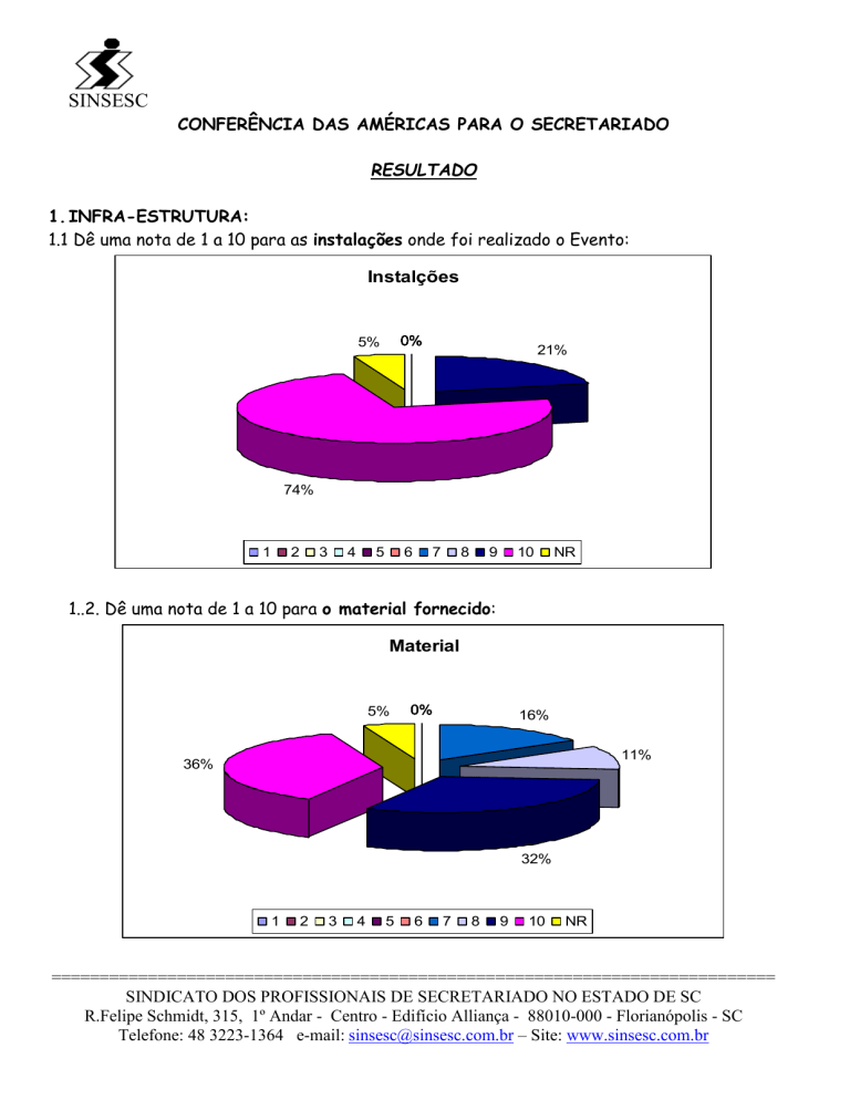 SINSESC CONFERÊNCIA DAS AMÉRICAS PARA O SECRETARIADO RESULTADO 1. INFRA-ESTRUTURA: 1.1 Dê uma nota de 1 a 10 para as instalações onde foi realizado o Evento: Instalções 0% 5% 21% 74% 1 2 3 4 5 6 7 8 9 10 NR 1..2. Dê uma nota de 1 a 10 para o material fornecido: Material 5% 0% 16% 11% 36% 32% 1 2 3 4 5 6 7 8 9 10 NR =========================================================================== SINDICATO DOS PROFISSIONAIS DE SECRETARIADO NO ESTADO DE SC R.Felipe Schmidt, 315, 1º Andar - Centro - Edifício Alliança - 88010-000 - Florianópolis - SC Telefone: 48 3223-1364 e-mail: [email protected] – Site: www.sinsesc.com.br SINSESC 2. ORGANIZAÇÃO E ATENDIMENTO: 2.1. Sua avaliação sobre o atendimento recebido: Secretaria: Secretaria 0% 16% 84% Ótimo Bom Ruim NR Recepção: Recepção 11% 0% 89% Ótimo Bom Ruim NR =========================================================================== SINDICATO DOS PROFISSIONAIS DE SECRETARIADO NO ESTADO DE SC R.Felipe Schmidt, 315, 1º Andar - Centro - Edifício Alliança - 88010-000 - Florianópolis - SC Telefone: 48 3223-1364 e-mail: [email protected] – Site: www.sinsesc.com.br SINSESC Tesouraria: Tesouraria 11% 0% 21% 68% Ótimo Bom Ruim NR 3. PALESTRANTES 3.1. O Evento atendeu suas expectativas? O evento atendeu suas expectativas. 16% 16% 0% 68% Sim Não Em partes NR =========================================================================== SINDICATO DOS PROFISSIONAIS DE SECRETARIADO NO ESTADO DE SC R.Felipe Schmidt, 315, 1º Andar - Centro - Edifício Alliança - 88010-000 - Florianópolis - SC Telefone: 48 3223-1364 e-mail: [email protected] – Site: www.sinsesc.com.br SINSESC 3.2. Dê uma nota de 1 a 10 para o desempenho dos Palestrantes Patrícia Santos Patrícia dos Santos Nascimento 0% 21% 26% 11% 42% 1 2 3 4 5 6 7 8 9 10 NR Celso Pereira Raimundo Celso Pereira Raimundo 0% 5% 0% 26% 16% 27% 21% 5% 1 2 3 4 5 6 7 8 9 10 NR =========================================================================== SINDICATO DOS PROFISSIONAIS DE SECRETARIADO NO ESTADO DE SC R.Felipe Schmidt, 315, 1º Andar - Centro - Edifício Alliança - 88010-000 - Florianópolis - SC Telefone: 48 3223-1364 e-mail: [email protected] – Site: www.sinsesc.com.br SINSESC Eliane Wamser Eliane Wamser 5% 0% 11% 0% 5% 26% 53% 1 2 3 4 5 6 7 8 9 10 NR Antônio Carlos Bambino Antonio Carlos Bambino 5% 0% 11% 21% 63% 1 2 3 4 5 6 7 8 9 10 NR =========================================================================== SINDICATO DOS PROFISSIONAIS DE SECRETARIADO NO ESTADO DE SC R.Felipe Schmidt, 315, 1º Andar - Centro - Edifício Alliança - 88010-000 - Florianópolis - SC Telefone: 48 3223-1364 e-mail: [email protected] – Site: www.sinsesc.com.br SINSESC Alice Thümmel Kuerten Alice Thummel Kuerten 5% 0% 21% 5% 48% 21% 1 2 3 4 5 6 7 8 9 10 NR Clarisse Leal Clarisse Leal 5% 0% 5% 5% 21% 59% 5% 1 2 3 4 5 6 7 8 9 10 NR =========================================================================== SINDICATO DOS PROFISSIONAIS DE SECRETARIADO NO ESTADO DE SC R.Felipe Schmidt, 315, 1º Andar - Centro - Edifício Alliança - 88010-000 - Florianópolis - SC Telefone: 48 3223-1364 e-mail: [email protected] – Site: www.sinsesc.com.br SINSESC 4. COMENTÁRIOS (opcional) COMENTÁRIOS FEITOS NAS AVALIAÇÕES DA CONFERÊNCIA DAS AMÉRICAS, REALIZADA NOS DIAS 18 E 19 DE NOVEMBRO DE 2010 1. “Adorei. O Conhecimento é algo incrível quando adquirido, absorvido e praticado. Obrigada.” 2. “Gostaria que tivessem cursos na área administrativa, protocolo, idiomas para negócios, redação empresarial”. Estou há 2 meses em Florianópolis e estou assustada com a faixa salarial daqui”. 3. “O evento deveria ter mais conferências no 1º dia e a tarde do 2º dia ser mais ‘leve’.” 4. “Na sexta-feira 3 conferências, no período vespertino é muito cansativo. Também acho que na sexta-feira o encerramento deveria ser mais cedo.” 5. “Espero ter oportunidade sempre de participar, pois sempre me enriquece; acresce muito no meu conhecimento. Parabéns turma.” 6. “Apesar de no princípio eu não estava dando muita credibilidade por conta do valor (baixo), eu gostei da maioria dos palestrantes. A organização precisava atentar-se com os participantes que vieram de outro estado, quanto à ajuda na logística de hotel, restaurante e pontos turísticos, pois algumas aproveitaram o final de semana em Floripa. Quanto à organização dos horários houve falhas! Parceiros com empresas para sorteios ou solicitem aos participantes que elas (es) tragam brindes das suas empresas.” 7. “Colocar prancheta para escrita.” 8. “Estacionamento reservado para os participantes. Receber o material/palestrante no dia do evento.” 76 participantes 19 formulários respondidos =========================================================================== SINDICATO DOS PROFISSIONAIS DE SECRETARIADO NO ESTADO DE SC R.Felipe Schmidt, 315, 1º Andar - Centro - Edifício Alliança - 88010-000 - Florianópolis - SC Telefone: 48 3223-1364 e-mail: [email protected] – Site: www.sinsesc.com.br