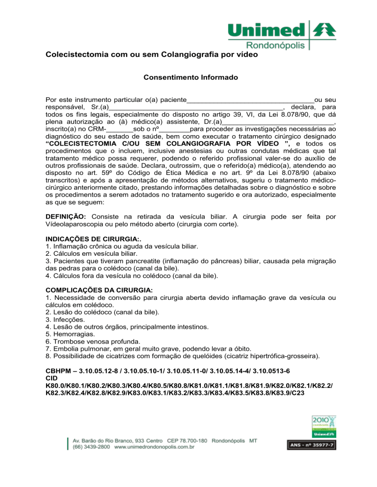 Colecistectomia com ou sem Colangiografia por vídeo Consentimento Informado Por este instrumento particular o(a) paciente_________________________________ou seu responsável, Sr.(a)_____________________________________________, declara, para todos os fins legais, especialmente do disposto no artigo 39, VI, da Lei 8.078/90, que dá plena autorização ao (à) médico(a) assistente, Dr.(a)_____________________________, inscrito(a) no CRM-_______sob o nº________para proceder as investigações necessárias ao diagnóstico do seu estado de saúde, bem como executar o tratamento cirúrgico designado “COLECISTECTOMIA C/OU SEM COLANGIOGRAFIA POR VÍDEO ”, e todos os procedimentos que o incluem, inclusive anestesias ou outras condutas médicas que tal tratamento médico possa requerer, podendo o referido profissional valer-se do auxílio de outros profissionais de saúde. Declara, outrossim, que o referido(a) médico(a), atendendo ao disposto no art. 59º do Código de Ética Médica e no art. 9º da Lei 8.078/90 (abaixo transcritos) e após a apresentação de métodos alternativos, sugeriu o tratamento médicocirúrgico anteriormente citado, prestando informações detalhadas sobre o diagnóstico e sobre os procedimentos a serem adotados no tratamento sugerido e ora autorizado, especialmente as que se seguem: DEFINIÇÃO: Consiste na retirada da vesícula biliar. A cirurgia pode ser feita por Vídeolaparoscopia ou pelo método aberto (cirurgia com corte). INDICAÇÕES DE CIRURGIA:. 1. Inflamação crônica ou aguda da vesícula biliar. 2. Cálculos em vesícula biliar. 3. Pacientes que tiveram pancreatite (inflamação do pâncreas) biliar, causada pela migração das pedras para o colédoco (canal da bile). 4. Cálculos fora da vesícula no colédoco (canal da bile). COMPLICAÇÕES DA CIRURGIA: 1. Necessidade de conversão para cirurgia aberta devido inflamação grave da vesícula ou cálculos em colédoco. 2. Lesão do colédoco (canal da bile). 3. Infecções. 4. Lesão de outros órgãos, principalmente intestinos. 5. Hemorragias. 6. Trombose venosa profunda. 7. Embolia pulmonar, em geral muito grave, podendo levar a óbito. 8. Possibilidade de cicatrizes com formação de quelóides (cicatriz hipertrófica-grosseira). CBHPM – 3.10.05.12-8 / 3.10.05.10-1/ 3.10.05.11-0/ 3.10.05.14-4/ 3.10.0513-6 CID K80.0/K80.1/K80.2/K80.3/K80.4/K80.5/K80.8/K81.0/K81.1/K81.8/K81.9/K82.0/K82.1/K82.2/ K82.3/K82.4/K82.8/K82.9/K83.0/K83.1/K83.2/K83.3/K83.4/K83.5/K83.8/K83.9/C23 INFECÇÃO HOSPITALAR A portaria nº. 2.616, de 12/05/1998 do Ministério da Saúde estabeleceu as normas do Programa de Controle de Infecção Hospitalar (PCIH), obrigando os hospitais a constituir a CCIH (Comissão de Controle de Infecção Hospitalar). Os índices de infecção hospitalar aceitos são estabelecidos, usando-se como parâmetro o NNIS (Nacional Nosocomial Infectores Surveillance – Vigilância Nacional Nosocomial de Infecção), órgão internacional que estabelece os índices de infecção hospitalar aceitos e que são: 1. Cirurgias limpas – 2% (são aquelas que não apresentam processo infeccioso e inflamatório local e durante a cirurgia, não ocorre penetração nos tratos digestivo, respiratório ou urinário); 2. Cirurgias potencialmente contaminadas – 10% (aquelas que necessitam drenagem aberta e ocorre penetração nos tratos digestivo, respiratório ou urinário); 3. Cirurgias contaminadas – 20% (são aquelas realizadas em tecidos recentemente traumatizadas e abertos, colonizadas por flora bacteriana abundante de difícil ou impossível descontaminação, sem supuração local). Presença de inflamação aguda na incisão cirúrgica e grande contaminação a partir do tubo digestivo. Inclui obstrução biliar e urinária. 4. Cirurgias infectadas – 40% (são aquelas realizadas na presença do processo infeccioso (supuração local) e/ou tecido necrótico. Declara ainda, ter lido as informações contidas no presente instrumento, as quais entendeu perfeitamente e aceitou, compromissando-se respeitar integralmente as instruções fornecidas pelo(a) médico(a), estando ciente de que sua não observância poderá acarretar riscos e efeitos colaterais a si (ou ao paciente). Declara, igualmente, estar ciente de que o tratamento adotado não assegura a garantia de cura, e que a evolução da doença e do tratamento podem obrigar o(a) médico(a) a modificar as condutas inicialmente propostas, sendo que, neste caso, fica o(a) mesmo(a) autorizado(a), desde já, a tomar providências necessárias para tentar a solução dos problemas surgidos, segundo seu julgamento. Finalmente, declara ter sido informado a respeito de métodos terapêuticos alternativos e estar atendido em suas dúvidas e questões, através de linguagem clara e acessível. Assim, tendo lido, entendido e aceito as explicações sobre os mais comuns RISCOS E COMPLICAÇÕES deste procedimento, expressa seu pleno consentimento para sua realização. Rondonópolis (Mato Grosso) __________ de_______________ de______________. ___________________ __________________________ Assinatura do(a) paciente Assinatura do(a) resp. pelo(a) paciente RG________________ Nome_______________ RG______________________ Nome____________________ ______________________ Assinatura do(a) médico(a) CRM__________________ Nome__________________ Código de Ética Médica – Art. 59º - É vedado ao médico deixar de informar ao paciente o diagnóstico, o prognóstico, os riscos e objetivos do tratamento, salvo quando a comunicação direta ao mesmo possa provocar-lhe dano, devendo, nesse caso, a comunicação ser feita ao seu responsável legal. Lei 8.078 de 11/09/1990 – Código Brasileiro de Defesa do Consumidor: Art. 9º - O fornecedor de produtos ou serviços potencialmente perigosos à saúde ou segurança deverá informar, de maneira ostensiva e adequada, a respeito da sua nocividade ou periculosidade, sem prejuízo da adoção de outras medidas cabíveis em cada 