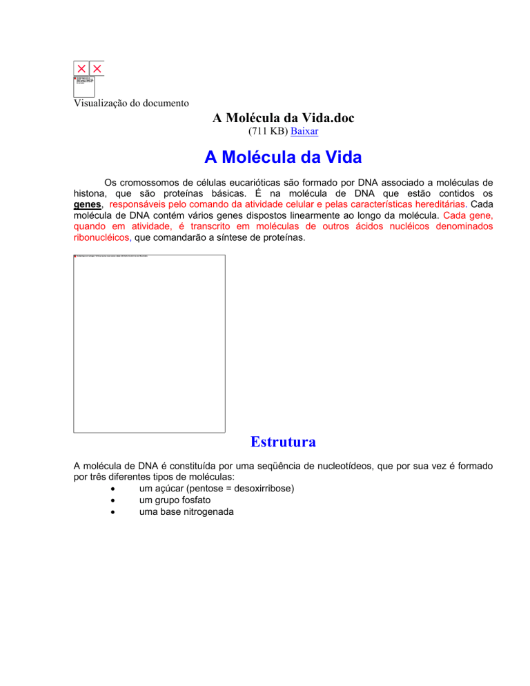 Visualização do documento A Molécula da Vida.doc (711 KB) Baixar A Molécula da Vida Os cromossomos de células eucarióticas são formado por DNA associado a moléculas de histona, que são proteínas básicas. É na molécula de DNA que estão contidos os genes, responsáveis pelo comando da atividade celular e pelas características hereditárias. Cada molécula de DNA contém vários genes dispostos linearmente ao longo da molécula. Cada gene, quando em atividade, é transcrito em moléculas de outros ácidos nucléicos denominados ribonucléicos, que comandarão a síntese de proteínas. Estrutura A molécula de DNA é constituída por uma seqüência de nucleotídeos, que por sua vez é formado por três diferentes tipos de moléculas: um açúcar (pentose = desoxirribose) um grupo fosfato uma base nitrogenada Devido a esta conformação, a cadeia de DNA fica com uma direção determinada, isto é, em uma extremidade temos livre a hidroxila do carbono-5 da primeira pentose e na outra temos livre a hidroxila do carbono-3 da última pentose. Isto determina que o crescimento do DNA se faça na direção de 5' para 3'. Sabendo-se como são feitas as ligações entre os nucleotídeos, formando assim a fita de DNA, podemos analisar a estrutura tridimensional do DNA. James Watson e Francis Crick postularam um modelo tridimensional para a estrutura do DNA baseando-se em estudos de difração de raio-X. O DNA consiste de duas cadeias helicoidais de DNA, enroladas ao longo de um mesmo eixo, formando uma dupla hélice de sentido rotacional à direita. Ainda com base nestes estudos, concluiu-se que na dupla hélice as duas fitas de DNA estão em direção opostas, isto significa que são anti-paralelas. O termo anti-paralelas deve-se ao fato de que uma das fitas tem a direção exata da sua síntese (5'3') enquanto que a outra está invertida (3'5'). Esta conformação em fitas anti-paralelas levará à necessidade de mecanismos especiais para a replicação do DNA. Com base na estrutura de dupla hélice do DNA e nas características de hidrofobicidade das moléculas, a estrutura do DNA fica da seguinte forma: O grupo fosfato e o açúcar (parte hidrofílica) - estão localizados na parte externa da molécula. As bases nitrogenadas (parte hidrofóbica) - estão localizadas na parte interna da molécula. A relação espacial entre as duas fitas cria um sulco principal e um sulco secundário. O pareamento das bases de cada fita se dá de maneira padronizada, sempre uma purina com uma pirimidina, especificamente: adenina com timina e citosina com guanina. A proximidade destas bases possibilita a formação de pontes de hidrogênio, sendo que adenina forma duas pontes de hidrogênio com a timina e a citosina forma três pontes com a guanina. A dupla hélice é mantida unida por duas forças: Por pontes de hidrogênio formadas pelas bases complementares e por interações hidrofóbicas, que forçam as bases a se "esconderem" dentro da dupla hélice. Propriedades físicas e químicas do DNA Soluções de DNA, em pH = 7,0 e temperatura ambiente, são altamente viscosas; A altas temperaturas ou pH extremos o DNA sofre desnaturação, isto porque ocorre ruptura das pontes de hidrogênio entre os pares de bases. Esta desnaturação faz com que diminua a viscosidade da solução de DNA; Durante a desnaturação nenhuma ligação covalente é desfeita, ficando portanto as duas fitas de DNA separadas; Quando o pH e a temperatura voltam ao normal, as duas fitas de DNA espontaneamente se enrolam formando novamente o DNA dupla fita. Este processo envolve duas etapas: A primeira é mais lenta pois envolve o encontro casual das fitas complementares de DNA, formando um curto segmento de dupla hélice. A segunda etapa é mais rápida e envolve a formação das pontes de hidrogênio entre as bases complementares reconstruindo a conformação tridimensional. Duplicação do DNA Replicação do DNA é o processo de duplicação do material genético mantendo assim o padrão de herança ao longo das gerações. Teoria semi-conservativa: Cada fita do DNA é duplicada formando uma fita híbrida, isto é, a fita velha pareia com a fita nova formando um novo DNA; de uma molécula de DNA formam-se duas outras iguais a ela. Cada DNA recém formado possui uma das cadeias da molécula mãe, por isso o nome semi-conservativa. A molécula do DNA vai-se abrindo ao meio, por ação de uma enzima chamada DNA polimerase. Essa enzima quebra as ligações de pontes de hidrogênio existentes entre as duas bases nitrogenadas das cadeias complementares de nucleotídeos. Ao mesmo tempo que o DNA polimerase vai abrindo a molécula de DNA, outra enzima chamada DNA ligase vai ligando um grupo de nucleotídeos que se pareiam com os nucleotídeos da molécula mãe. Além da capacidade de duplicação o DNA também é responsável pela síntese de outro ácido nucléico muito importante para a célula: o ácido ribonucléico ou RNA. Da mesma forma que o DNA, o RNA também é uma molécula grande formada por várias partes menores chamadas nucleotídeos. Por isso diz-se que tanto DNA como RNA são polinucleotídeos. Mutações Gênicas Em 1941, os pesquisadores Beadle e Tatum, fazendo experiências com um tipo de bolor de pão, a Neurospora sp, observaram que nem sempre a autoduplicação do DNA ocorria de modo perfeito. O bolor crescia num meio de cultura contendo açúcar e diversos sais inorgânicos. Seus esporos eram submetidos a raios X e alguns deles passavam depois a produzir bolores com novas características. Por exemplo, alguns perdiam a capacidade de fabricar lisina e só conseguiam sobreviver quando aquele aminoácido era acrescentado ao meio de cultura. Essa incapacidade foi relaciona com a falta de uma enzima necessária para a síntese de lisina. Concluíram, então, que os raios X teriam danificado a formação daquele tipo específico de enzima. Como a produção de uma enzima depende de informação codificada no DNA, a c