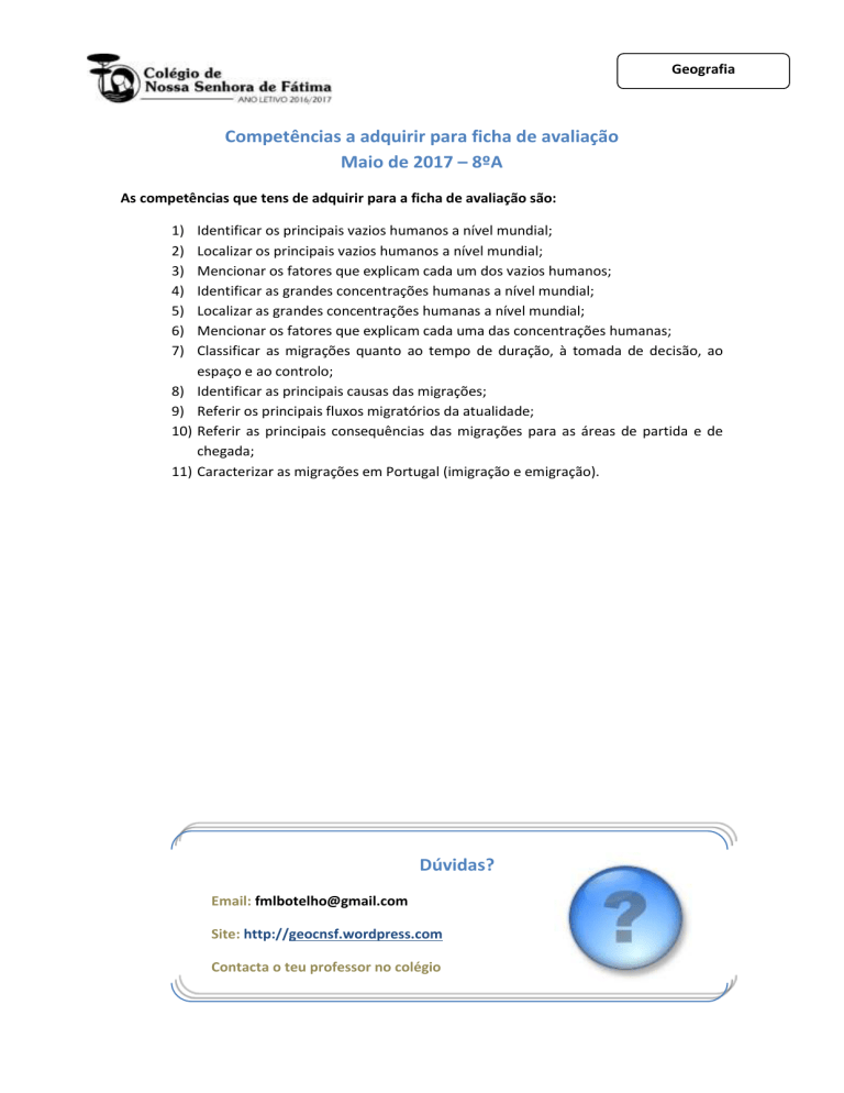 Geografia Competências a adquirir para ficha de avaliação Maio de 2017 – 8ºA As competências que tens de adquirir para a ficha de avaliação são: 1) 2) 3) 4) 5) 6) 7) 8) 9) 10) 11) Identificar os principais vazios humanos a nível mundial; Localizar os principais vazios humanos a nível mundial; Mencionar os fatores que explicam cada um dos vazios humanos; Identificar as grandes concentrações humanas a nível mundial; Localizar as grandes concentrações humanas a nível mundial; Mencionar os fatores que explicam cada uma das concentrações humanas; Classificar as migrações quanto ao tempo de duração, à tomada de decisão, ao espaço e ao controlo; Identificar as principais causas das migrações; Referir os principais fluxos migratórios da atualidade; Referir as principais consequências das migrações para as áreas de partida e de chegada; Caracterizar as migrações em Portugal (imigração e emigração). Dúvidas? Email: [email protected] Site: http://geocnsf.wordpress.com Contacta o teu professor no colégio