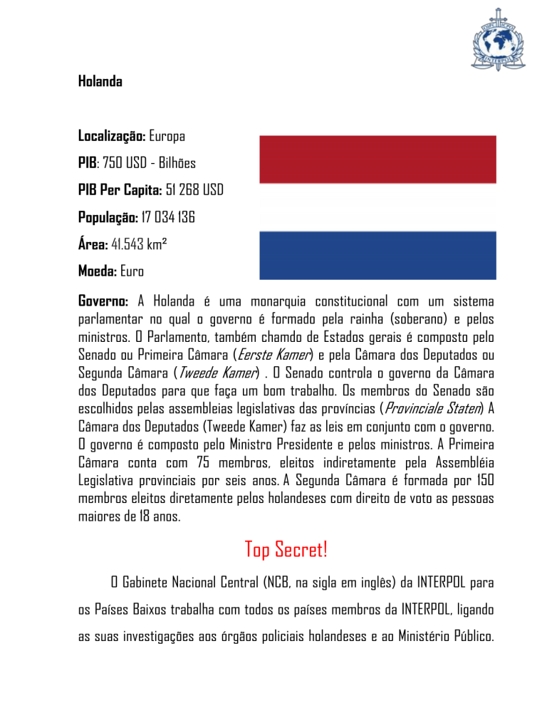 Holanda Localização: Europa PIB: 750 USD - Bilhões PIB Per Capita: 51 268 USD População: 17 034 136 Área: 41.543 km² Moeda: Euro Governo: A Holanda é uma monarquia constitucional com um sistema parlamentar no qual o governo é formado pela rainha (soberano) e pelos ministros. O Parlamento, também chamdo de Estados gerais é composto pelo Senado ou Primeira Câmara (Eerste Kamer) e pela Câmara dos Deputados ou Segunda Câmara (Tweede Kamer) . O Senado controla o governo da Câmara dos Deputados para que faça um bom trabalho. Os membros do Senado são escolhidos pelas assembleias legislativas das províncias (Provinciale Staten) A Câmara dos Deputados (Tweede Kamer) faz as leis em conjunto com o governo. O governo é composto pelo Ministro Presidente e pelos ministros. A Primeira Câmara conta com 75 membros, eleitos indiretamente pela Assembléia Legislativa provinciais por seis anos. A Segunda Câmara é formada por 150 membros eleitos diretamente pelos holandeses com direito de voto as pessoas maiores de 18 anos. Top Secret! O Gabinete Nacional Central (NCB, na sigla em inglês) da INTERPOL para os Países Baixos trabalha com todos os países membros da INTERPOL, ligando as suas investigações aos órgãos policiais holandeses e ao Ministério Público. Ajuda o NCB da INTERPOL a realizar inquéritos a nível mundial envolvendo Países Baixos ou neerlandeses no estrangeiro. O NCB, designado por Secretariado da INTERPOL como parte da Divisão Central de Informação, funciona como ponto de contato nacional para as autoridades nacionais responsáveis pela aplicação da lei que necessitam de ajuda para investigações internacionais. É composto por 12 pessoas cuja tarefa consiste no intercâmbio rápido e eficiente de informações sensíveis no seio da comunidade INTERPOL, utilizando a rede policial global segura da INTERPOL, disponível 24 horas por dia, 7 dias por semana. Com base no reconhecimento do ciberespaço como o quinto domínio para operações militares, a Estratégia Cibernética de Defesa considera as três tarefas principais da organização de defesa holandesa - proteger a integridade territorial, promover a estabilidade e Estado de Direito e apoio às autoridades civis responsáveis pela aplicação da lei, ajuda humanitária e desastres - como trajetórias específicas de direção estratégica para o fortalecimento da capacidade de resistência e capacidade das forças armadas no "domínio digital". A estratégia é uma elaboração mais aprofundada sobre os aspectos relacionados com a defesa abordados na estratégia nacional de segurança cibernética. A estratégia, que prevê o ciberespaço como uma arena de operações militares, trata os ativos digitais como capacidades operacionais, isto é, como armas ou como bens de inteligência, que devem ser incorporados nas capacidades operacionais das forças armadas como um todo "relevantes para a proteção de Redes, sistemas e informações, a implantação de capacidades ofensivas e a coleta de informações usando tecnologia digital.” Para o efeito, a estratégia comunica a intenção de colocar - todas as atividades ligadas às operações militares no ciberespaço – sob um controle central e coordenado. Além disso, a estratégia reconhece o papel das organizações de defesa em cooperar com outros atores (civis, públicos e privados, nacionais e internacionais) para se defender contra ameaças cibernéticas que afetam a sociedade como um todo.