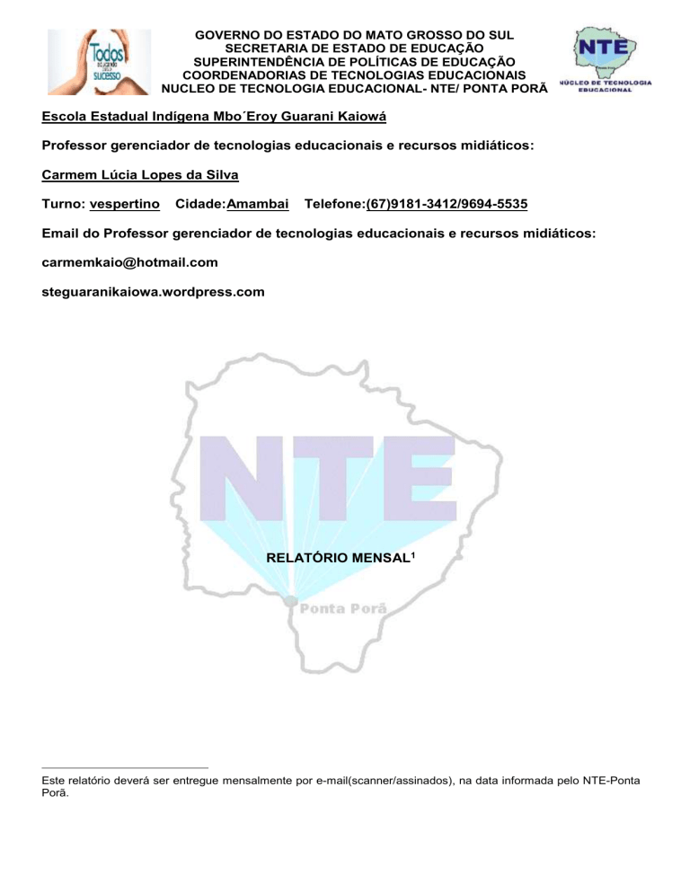GOVERNO DO ESTADO DO MATO GROSSO DO SUL SECRETARIA DE ESTADO DE EDUCAÇÃO SUPERINTENDÊNCIA DE POLÍTICAS DE EDUCAÇÃO COORDENADORIAS DE TECNOLOGIAS EDUCACIONAIS NUCLEO DE TECNOLOGIA EDUCACIONAL- NTE/ PONTA PORÃ Escola Estadual Indígena Mbo´Eroy Guarani Kaiowá Professor gerenciador de tecnologias educacionais e recursos midiáticos: Carmem Lúcia Lopes da Silva Turno: vespertino Cidade:Amambai Telefone:(67)9181-3412/9694-5535 Email do Professor gerenciador de tecnologias educacionais e recursos midiáticos: [email protected] steguaranikaiowa.wordpress.com RELATÓRIO MENSAL1 Este relatório deverá ser entregue mensalmente por e-mail(scanner/assinados), na data informada pelo NTE-Ponta Porã. RELATÓRIO DAS AÇÕES DO PROF GERENCIADOR Ações Data 01/11/2013 04/11/2013 05 e 06/11/13 07/11/2013 08/11/2013 11/11/2013 12/11/2013 14/11/2013 18/11/2013 19/11/2013 20/11/2013 21/11/2013 22/11/2013 25/11/2013 26/11/2013 27/11/2013 29/11/2013 Frutos do Cerrado (Marmelo, Uvaia, Pequi), disciplina de Biologia, elaboração de slides, pesquisas, etc..., utilizou-se computador e câmera digital. Matas dos Cocais, disciplina de Geografia, pesquisa e montagem de vídeos, utilizou-se projetor proinfo. Reunião sobre a SAEMS, coordenação, direção e docentes, utilizou-se data show e câmera digital. Frutos do Cerrado (Marmelo), disciplina de Biologia, elaboração de slides, pesquisas, etc..., utilizou-se computador. Tabela periódica, disciplina de Química, utilizou-se projetor proinfo. Floresta Amazônica, disciplina de Geografia, pesquisa e montagem de vídeos, utilizou-se projetor proinfo. Prova da SAEMS. Manutenção da STE (limpeza da sala, computadores=mouses, cpu´s, teclados, monitores, bancadas). Floresta Amazônica/Mata Atlântica, disciplina de Geografia, pesquisa e montagem de vídeos, utilizou-se projetor proinfo. Reunião com docentes, coordenação e direção sobre “Todo Jovem na Escola”, utilizou-se data show e computador. Frutos do Cerrado (Marmelo, Uvaia, Pequi), disciplina de Biologia, elaboração de slides, pesquisas, etc..., utilizou-se computador. Cerrado, disciplina de Geografia, pesquisa e montagem de vídeos, utilizou-se projetor proinfo. Frutos do Cerrado (Marmelo, Uvaia, Pequi, Guavira), disciplina de Biologia, elaboração de slides, pesquisas, etc..., utilizou-se computador. Entrevista sobre Trovões e Raios, elaboração do 3º ano EM, disciplina de Física, utilizou-se câmera digital para filmagem. Manutenção da STE (limpeza da sala, computadores=mouses, cpu´s, teclados, monitores, bancadas). Participei do 1º Encontro Nacional do NAAH/S e 3º Encontro dos Estudantes do NAAH/SMS em Campo Grande/MS. Manutenção da STE (limpeza da sala, computadores=mouses, cpu´s, teclados, monitores, bancadas). Apresentação de vídeos elaborados pelos alunos, disciplina de Literatura, utilizouse computador e data show. Frutos do Cerrado (Marmelo, Uvaia, Pequi, Guavira), disciplina de Biologia, elaboração de slides, pesquisas, etc..., utilizou-se computador. Montagem de vídeos para Noite Cultural, utilizou-se computador. Manutenção da STE (limpeza da sala, computadores=mouses, cpu´s, teclados, monitores, bancadas). Arrumação da escola para Noite Cultural (aparelhos tecnológicos). 5ª Formação Continuada com tema “Educação Especial na Perspectiva da Educação Inclusiva”, utilizou-se câmera digital. Manutenção da STE (limpeza da sala, computadores=mouses, cpu´s, teclados, monitores, bancadas). A Iniciação do Jovem Xavante, disciplina de Q.I.B, utilizou-se projetor proinfo. Quanto vale ou por quilo?, disciplina de História, utilizou-se projetor proinfo. Quanto vale ou por quilo?, disciplina de História, utilizou-se projetor proinfo. Floresta Amazônica/Mata Atlântica, disciplina de Geografia, pesquisa e montagem de vídeos, utilizou-se projetor proinfo. Nº ATIVIDADE DESENVOLVIDA ANO/TURMA Nº de Alunos por aula DISCIPLINA Soma 1 Frutos do Cerrado/Marmelo e Uvaia 2º A e B Biologia 22 21 21 22 21 2 Frutos do Cerrado/Pequi 1º C Biologia 14 14 28 3º A Geografia 28 28 4 Frutos do Cerrado/Marmelo e Uvaia 1º A, B e C Biologia 13 12 15 15 55 5 Tabela Periódica 1º A, B e C Química 14 12 13 39 6 Vídeo: Floresta Amazônica 3º A Geografia 27 27 7 3º A Geografia 33 33 8 Frutos do Cerrado/Guavira 1º C Biologia 12 12 9 Vídeo: Cerrado 3º A Geografia 30 30 3º A Física 4 4 11 Vídeo sobre:Chicha 2º B História 20 20 12 3º A Literatura 29 29 13 Iniciação do Jovem Xavante 1º A e B Q.I.B 15 15 30 14 Iniciação do Jovem Xavante 2º A Q.I.B 20 20 15 Iniciação do Jovem Xavante 3º A Q.I.B 27 27 16 Vídeo:Quanto vale ou por quilo? 2º A e B História 21 21 42 17 Vídeo:Quanto vale ou por quilo? 1º A e B História 17 16 33 18 3º A Geografia 29 29 3 10 Matas dos Cocais Vídeos: Floresta Amazônica/Mata Atlântica Depoimento sobre:Raios, Trovões e Relâmpagos Vídeos de Literatura elaborados pelos alunos Vídeos: Floresta Amazônica/Mata Atlântica 107 19 0 20 0 ALUNOS2 Total de alunos por turno Nº Nº de alunos que utilizaram a STE sem projetos. N° de funcionários que utilizaram STE sem projetos PROFESSORES 3 Total de professores por turno Nº Total de professores que trabalham na escola. 12 Nº de professores com capacitação pedagógica4. 12 Nº de professores sem capacitação pedagógica. 00 Nº de professores que estão participando da STE. 07 Nº de professores que não estão participando da STE 05 REDE FÍSICA Possui Internet: ( ) ADSL ( ) Discada ( ) Via Rádio ( ) CONSAT ( ) GESAC ( x ) Não possui. Possui impressora: ( ) Matricial ( ) Jato de tinta ( ) Laser ( x ) Não possui. Quantificar:____________ Possui gravadora de cdroom: ( ) Sim ( x ) Não Quantificar: ( ) Funcionando ( ) Danificado Possui scanner: ( ) Sim ( x ) Não Quantificar: ( ) Funcionando ( ) Danificado Possui leitor de dvd: ( x ) Sim ( ) Não Quantificar: ( 01 ) Funcionando ( ) Danificado Possui gravadora de dvd: ( ) Sim ( x ) Não Quantificar: ( ) Funcionando Núm