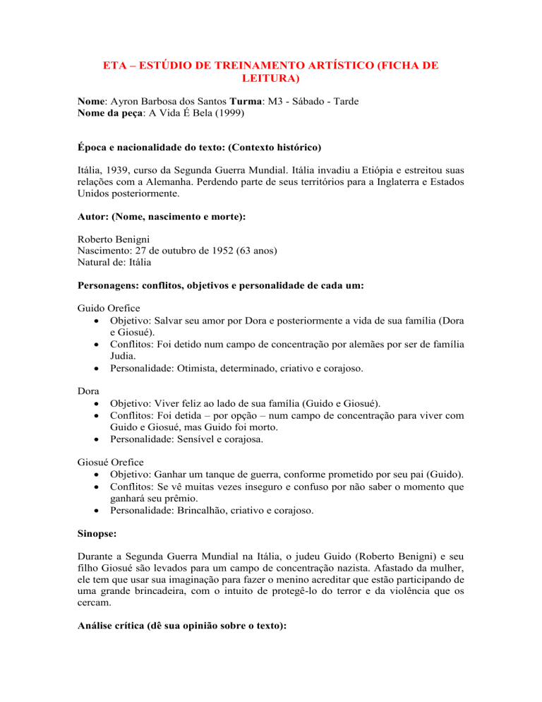 ETA – ESTÚDIO DE TREINAMENTO ARTÍSTICO (FICHA DE LEITURA) Nome: Ayron Barbosa dos Santos Turma: M3 - Sábado - Tarde Nome da peça: A Vida É Bela (1999) Época e nacionalidade do texto: (Contexto histórico) Itália, 1939, curso da Segunda Guerra Mundial. Itália invadiu a Etiópia e estreitou suas relações com a Alemanha. Perdendo parte de seus territórios para a Inglaterra e Estados Unidos posteriormente. Autor: (Nome, nascimento e morte): Roberto Benigni Nascimento: 27 de outubro de 1952 (63 anos) Natural de: Itália Personagens: conflitos, objetivos e personalidade de cada um: Guido Orefice Objetivo: Salvar seu amor por Dora e posteriormente a vida de sua família (Dora e Giosué). Conflitos: Foi detido num campo de concentração por alemães por ser de família Judia. Personalidade: Otimista, determinado, criativo e corajoso. Dora Objetivo: Viver feliz ao lado de sua família (Guido e Giosué). Conflitos: Foi detida – por opção – num campo de concentração para viver com Guido e Giosué, mas Guido foi morto. Personalidade: Sensível e corajosa. Giosué Orefice Objetivo: Ganhar um tanque de guerra, conforme prometido por seu pai (Guido). Conflitos: Se vê muitas vezes inseguro e confuso por não saber o momento que ganhará seu prêmio. Personalidade: Brincalhão, criativo e corajoso. Sinopse: Durante a Segunda Guerra Mundial na Itália, o judeu Guido (Roberto Benigni) e seu filho Giosué são levados para um campo de concentração nazista. Afastado da mulher, ele tem que usar sua imaginação para fazer o menino acreditar que estão participando de uma grande brincadeira, com o intuito de protegê-lo do terror e da violência que os cercam. Análise crítica (dê sua opinião sobre o texto): Este filme me parece, de maneira simbólica, uma flor nascendo no asfalto, pois Guido é a representação da bondade, da pureza, do otimismo e da coragem diante de opressão, preconceitos e males decorrentes da ignorância e maldade do ser humano. Giosué é a imagem da esperança pois vive em meio ao caos vislumbrando uma realidade criada por seu pai, mais pacífica. Dora é a oposição, pois mesmo de família rica tradicional italiana e professora de uma escola fascista, se deixa levar pelo amor que sente por Guido e Giosué, sofrendo com eles, sem precisão, a opressão nazista. Neste filme, comparando com o momento histórico da Itália, notamos também que há uma espécie de “marketing” por parte dos Estados Unidos, uma vez que se mostra herói no final do filme, salvando os judeus sobreviventes, entregando o prêmio ao garotinho indefeso e órfão de pai e o deixando são e salvo nos braços de sua mãe. Referências AQUI, História Estudo. Resenha do Filme: "A Vida é Bela". Disponível em: http://historiaestudoaqui.blogspot.com.br/2013/11/resenha-do-filme-vida-e-bela.html. Acesso em 12 de setembro de 2016 às 18h30min. LIVRE, Wikipédia – A enciclopédia. Roberto Benigni Disponível em: https://pt.wikipedia.org/wiki/Roberto_Benigni. Acesso em 12 de setembro de 2016 às 18h00min. NET, Segunda Guerra. Itália na Segunda Guerra Mundial – Principal Aliada da Alemanha. Disponível em: http://segundaguerra.net/italia-na-segunda-guerra-mundialprincipal-aliada-da-alemanha/. Acesso em 12 de setembro de 2016 às 18h20min.