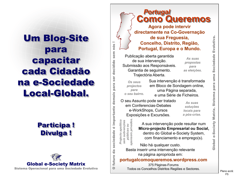 Portugal Global e-Society Matrix Sistema Operacional para uma Sociedade Evolutiva Publicação aberta garantida de sua intervenção. Submissão aos Responsáveis. Garantia de seguimento. Trajectória Aberta. As suas propostas para as eleições. Sua intervenção é transformada em Bloco de Sondagem online, uma Página separada, e uma Série de Ficheiros. O seu Assunto pode ser tratado As suas em Conferencias-Debates soluções e-WorkShops, Cursos locais para a pós-crise. Exposições e Excursões. Os seus projectos para o seu bairro. A sua intervenção pode resultar num Micro-projecto Empresarial ou Social, dentro do Global e-Society System, com financiamento e emprego(s). Não há qualquer custo. Basta inserir uma intervenção relevante na página aproprioda em: Global e-Society Matrix. Sistema para uma Sociedade Evolutiva. Participa ! Divulga ! Agora pode intervir directamente na Co-Governação de sua Freguesia, Concelho, Distrito, Região, Portugal, Europa e o Mundo. Projecto apolitico sem subvenções públicas ou sponsors privados. Um Blog-Site para capacitar cada Cidadão na e-Sociedade Local-Global. O futuro da sociedade é importante demais para ser decidido sem nós ! Como Queremos portugalcomoqueremos.wordpress.com 375 Páginas-Forums Todos os Concelhos Distritos Regiões e Sectores. Pleno ecrã: F5 Portugal como Queremos Plataforma de Co-Governação Portugal O futuro da sociedade é importante demais para ser decidido sem nós ! Programas e Planos Oficiais Media Oficiais Propostas Alternativas Glob-Chave Pessoal Conecção e Intervenção Directa e ProActiva Pessoal-Global Ferramentas de Co-Governação ProActivadisponiveis para cada Cidadão. Cada Ferramenta é objecto de um Blog/Site. Todos são conectados, mundialmente. dentro da Votar nas Eleições ? Sim, mas só dentro do Sistema de Co-Governação. Portugal como Queremos Inquéritos Ruas Co-Planificação Local Global e-Society DataBank O futuro da sociedade é importante demais para ser decidido sem nós ! e-Audits Públicos Entrevistas Públicas Discursos Públicos Programa MetaMedia Imprensa Radio Televisão Candidatos e Eleitos Impacto efectivo Relatórios Públicos na Governação Local-Global. Campanhas Sensibilização Finanças Publicas e Societais Platafoma de Co-Governação Portugal Programa de Governação e Plano de e-Transição 2010 – 2020+ Mundo Portugal Local e-Centros Locais Assembleias e-Societais de Co-Governação Local-Global Projectos Socio-economicos Locais em Redes e-Regionais Global e-Society Matrix Sistema Operacional para uma Sociedade Evolutiva portugalcomoqueremos.wordpress.com Portugal como Queremos Sistema Texto Objectos dos Textos Comunicação Relatorio Pedido Queixa Acusação Proposta Negaçãa Confismação Pergunta Projecto Assunto dos Textos Sector Tema Idea Evento Lugar Linguagem dos Textos ! Constructiva Com Referencia Factual Não-Emocional Não Pessoal Não Politica-Partidaria Não Publicitaria Comercial Textos não dignos são adaptados ou retirados Exemplos de Perguntas e Pedidos Publicos Orçamento Plantas Predios Lista de Ruas Lista de Bairros Lista de Projectos Programa 2010+ Folheto ? NewsLetter? Boletim Mensal ? Exemplos de Problemas Publicos Locais Atendimento desagradável Burocracia Sociedade O seu Texto Tratamento Seguimento Impacto ver Diagrama seguinte. Exemplos de Problemas com Empresas Publicidade Incorecta Poluição Exemplos de Problemas “Raizes” Locais e Familiais Barulho Musica TV Radio Lixo Cães Fogo Parking Carro Agressão Agressividade Verbal Personalidade Pessoal Global e-Society Matrix portugalcomoqueremos.wordpress.com Sistema Operacional para uma Sociedade Evolutiva Portugal como Queremos Sistema e Trajectoria 3 Iniciativas 1 Diaporama Entre o seu Texto Glob-Dossier Ficheiros Download 6 Tabelas e-Workshops Base de Dados Textos Videos Audios Fotos Conferencias Pégina separada Cursos Actualizações permanentes pela Glob-Redacção Exposições Excursões O seu Texto 4 2 Autoridades O seu Texto Programas Planos Empresas Respostas NonProfits Respostas Glob-Redacção junta Impactos do seu Text Medidas Outros Respostas Bloco Sondagem do seu Text Bloco Sondagem 7 Respostas e-Mails 8 5 Projectos Comunicação Social Imprensa Radio Televisão Global e-Society Matrix Sistema Operacional para uma Sociedade Evolutiva portugalcomoqueremos.wordpress.com Portugal como Queremos A sua Instituição Pública, Empresa ou Associação no Sistema 3 Diaporama Entre o seu Texto Ficheiros Voucher Offerta Glob-Dossier Ficheiros Download 6 Base de Dados Textos Videos Link Audios Video Fotos Autoridades O seu Texto Link Discurso Cursos Painel Exposições Visita Bloco Sondagem 7 Programas Planos Impactos do seu Text Medidas Outros Respostas Bloco Sondagem do seu Text O seu Texto Respostas Respostas Glob-Redacção junta 8 Actualizações permanentes pela Glob-Redacção Excursões Empresas NonProfits Pégina separada Conferencias Demo Respostas e-Mails Link e-Workshops Painel Tabelas Link 4 2 Link Iniciativas Diapositivo 1 5 Comunicação Social Imprensa Link Radio Televisão Projectos Acção Venda Compra Global e-Society Matrix Sistema Operacional para uma Sociedade Evolutiva portugalcomoqueremos.wordpress.com Crise ? Grego: escolha. Um Blog-Site para capacitar cada Cidadão na e-Sociedade Local-Global. Participa ! Divulga ! Global e-Society Matrix Sistema Operacional para uma Sociedade Evolutiva Uma Nova Cultura Societal. Interdependente Transparente ProActiva Participativa Constructiva Panergetica Intuitiva Holistica Evolutiva …