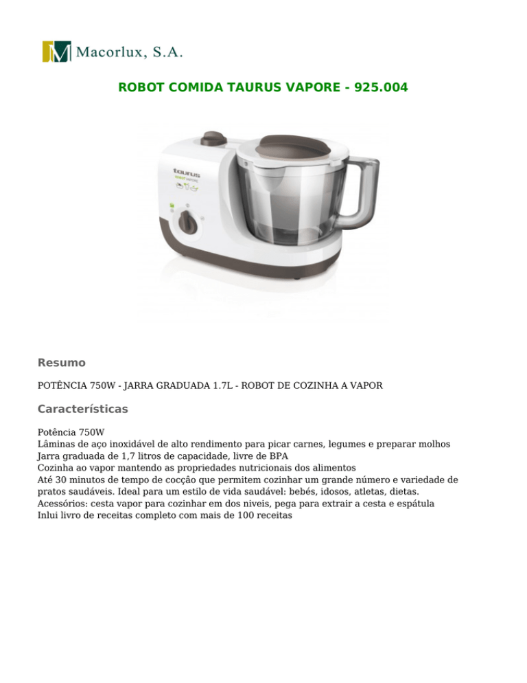 ROBOT COMIDA TAURUS VAPORE - 925.004 Resumo POTÊNCIA 750W - JARRA GRADUADA 1.7L - ROBOT DE COZINHA A VAPOR Características Potência 750W Lâminas de aço inoxidável de alto rendimento para picar carnes, legumes e preparar molhos Jarra graduada de 1,7 litros de capacidade, livre de BPA Cozinha ao vapor mantendo as propriedades nutricionais dos alimentos Até 30 minutos de tempo de cocçâo que permitem cozinhar um grande número e variedade de pratos saudáveis. Ideal para um estilo de vida saudável: bebés, idosos, atletas, dietas. Acessórios: cesta vapor para cozinhar em dos niveis, pega para extrair a cesta e espátula Inlui livro de receitas completo com mais de 100 receitas