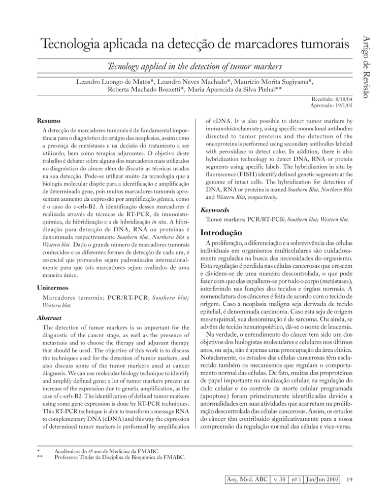 Tecnology applied in the detection of tumor markers Leandro Luongo de Matos*, Leandro Neves Machado*, Maurício Morita Sugiyama*, Roberta Machado Bozzetti*, Maria Aparecida da Silva Pinhal** Recebido: 8/10/04 Aprovado: 19/1/05 Resumo A detecção de marcadores tumorais é de fundamental importância para o diagnóstico do estágio das neoplasias, assim como a presença de metástases e na decisão do tratamento a ser utilizado, bem como terapias adjuvantes. O objetivo deste trabalho é debater sobre alguns dos marcadores mais utilizados no diagnóstico do câncer além de discutir as técnicas usadas na sua detecção. Pode-se utilizar muito da tecnologia que a biologia molecular dispõe para a identificação e amplificação de determinado gene, pois muitos marcadores tumorais apresentam aumento da expressão por amplificação gênica, como é o caso do c-erb-B2. A identificação desses marcadores é realizada através de técnicas de RT-PCR, de imunoistoquímica, de hibridização e a de hibridização in situ. A hibridização para detecção de DNA, RNA ou proteínas é denominada respectivamente Southern blot, Northern blot e Western blot. Dado o grande número de marcadores tumorais conhecidos e as diferentes formas de detecção de cada um, é essencial que protocolos sejam padronizados internacionalmente para que tais marcadores sejam avaliados de uma maneira única. Unitermos Marcadores tumorais; PCR/RT-PCR; Southern blot; Western blot. Abstract The detection of tumor markers is so important for the diagnostic of the cancer stage, as well as the presence of metastasis and to choose the therapy and adjuvant therapy that should be used. The objective of this work is to discuss the techniques used for the detection of tumor markers, and also discuss some of the tumor markers used at cancer diagnosis. We can use molecular biology technique to identify and amplify defined gene; a lot of tumor markers present an increase of the expression due to genetic amplification, as the case of c-erb-B2. The identification of defined tumor markers using some gene expression is done by RT-PCR techniques. This RT-PCR technique is able to transform a message RNA to complementary DNA (cDNA) and this way the expression of determined tumor markers is performed by amplification * ** of cDNA. It is also possible to detect tumor markers by immunohistochemistry, using specific monoclonal antibodies directed to tumor proteins and the detection of the oncoproteins is performed using secondary antibodies labeled with peroxidase to detect color. In addition, there is also hybridization technology to detect DNA, RNA or protein segments using specific labels. The hybridization in situ by fluorescence (FISH) identify defined genetic segments at the genome of intact cells. The hybridization for detection of DNA, RNA or proteins is named Southern Blot, Northern Blot and Western Blot, respectively. Keywords Tumor markers; PCR/RT-PCR; Southern blot; Western blot. Introdução A proliferação, a diferenciação e a sobrevivência das células individuais em organismos multicelulares são cuidadosamente reguladas na busca das necessidades do organismo. Esta regulação é perdida nas células cancerosas que crescem e dividem-se de uma maneira descontrolada, o que pode fazer com que elas espalhem-se por todo o corpo (metástases), interferindo nas funções dos tecidos e órgãos normais. A nomenclatura dos cânceres é feita de acordo com o tecido de origem. Caso a neoplasia maligna seja derivada de tecido epitelial, é denominada carcinoma. Caso esta seja de origem mesenquimal, sua denominação é de sarcoma. Ou ainda, se advêm de tecido hematopoiético, dá-se o nome de leucemia. Na verdade, o entendimento do câncer tem sido um dos objetivos dos biologistas moleculares e celulares nos últimos anos, ou seja, não é apenas uma preocupação da área clínica. Notadamente, os estudos das células cancerosas têm esclarecido também os mecanismos que regulam o comportamento normal das células. De fato, muitas das proproteínas de papel importante na sinalização celular, na regulação do ciclo celular e no controle da morte celular programada (apoptose) foram primeiramente identificadas devido a anormalidades em suas atividades que acarretam na proliferação descontrolada das células cancerosas. Assim, os estudos do câncer têm contribuído significativamente para a nossa compreensão da regulação normal das células e vice-versa. Acadêmicos do 4o ano de Medicina da FMABC. Professora Titular da Disciplina de Bioquímica da FMABC. Arq. Med. ABC v. 30 no 1 Jan/Jun 2005 19 Artigo de Revisão Tecnologia aplicada na detecção de marcadores tumorais Detecção de marcadores tumorais Os métodos descritos a seguir são importantes para o entendimento de como os marcadores tumorais são detectados no diagnóstico de neoplasias malignas1. Amplificação de DNA pela reação em cadeia da polimerase (PCR) Este método é utilizado para a obtenção de grandes quantidades de um segmento da molécula de DNA, o qual foi desenvolvido por Kary Mullis em 1988. O PCR é utilizado na detecção de determinados segmentos de DNA que podem caracterizar a presença de um patógeno, como, por exemplo, um DNA viral ou parasita, ou ainda detectar um marcador tumoral. A partir de uma seqüência da molécula de DNA conhecida, a reação de PCR amplifica um segmento do DNA in vitro. Essencialmente, um DNA polimerase específico é usado para replicações repetidas de um segmento de DNA definido. O número de moléculas de DNA aumenta exponencialmente, dobrando a cada ciclo de replicação, de modo que uma quantidade substancial de DNA pode ser obtida de um pequeno número de cópias moldes iniciais2. O procedimento geral para a amplificação por PCR é o seguinte: o material de partida pode ser tanto um fragmento de DNA clonado ou uma mistura de moléculas de DNA – por exemplo, DNA genômico de células humanas. Uma região e