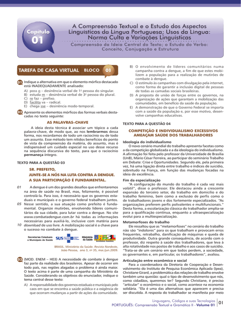A Compreensão Textual e o Estudo dos Aspectos Linguísticos da Língua Portuguesa; Usos da Língua: Norma Culta e Variações Linguísticas Capítulo 01 Compreensão da Ideia Central do Texto; o Estudo do Verbo: Conceito, Conjugação e Estrutura 01 01 Indique a alternativa em que o elemento mórfico destacado está INADEQUADAMENTE analisado: A) poss o – desinência verbal de 1a pessoa do singular. B) estuda m – desinência verbal de 3a pessoa do plural. C) re faz – prefixo. D) facilita va – radical. E) chega sse – desinência modo-temporal. 02 Apresente os elementos mórficos das formas verbais destacadas no texto seguinte: AS PALAVRAS-CHAVE A ideia desta técnica é associar um tópico a cada palavra-chave, de modo que, ao nos lembrarmos dessa forma, nos recordamos de todo um raciocínio ou de todo um assunto. Esse método tem nítidos benefícios do ponto de vista da compreensão da matéria, do assunto, mas é indispensável um cuidado especial no uso desse recurso na sequência discursiva do texto, para que o raciocínio permaneça íntegro. TEXTO PARA A QUESTÃO 03 SR. PREFEITO, JUNTE-SE A NÓS NA LUTA CONTRA A DENGUE. A SUA PARTICIPAÇÃO É FUNDAMENTAL. 01 A dengue é um dos grandes desafios que enfrentaremos na área de saúde no Brasil, mas, felizmente, é possível controlá-la. Para isso, é necessário que os governos estaduais e municipais e o governo federal trabalhem juntos. 05 Nesse sentido, a sua atuação como prefeito é fundamental. Organize mutirões, envolvendo líderes comunitários da sua cidade, para lutar contra a dengue. No site www.combatadengue.com.br há todas as informações necessárias para auxiliá-lo, inclusive com matéria para 10 download de uso livre. A mobilização social é a chave para o sucesso no combate à dengue. 1 BRASIL. Ministério da Saúde. Revista Nordeste, João Pessoa, ano 3, no 35, mai./jun.2009. 03 (MOD. ENEM – H03) A necessidade de combate à dengue faz parte da realidade dos brasileiros. Apesar de ocorrer em todo país, nas regiões alagadas o problema é ainda maior. O texto acima é parte de uma campanha do Ministério da Saúde. Considerando os objetivos do enunciador, indique o tema central desse texto: A) A responsabilidade dos governos estaduais e municipais pelo caos em que se encontra a saúde pública e a exigência de que ocorram mudanças a partir de ações da comunidade. B) O envolvimento de líderes comunitários numa campanha contra a dengue, a fim de que estes mobilizem a população para a realização de mutirões de combate à dengue. C) O estímulo às campanhas com divulgação pela internet, como forma de garantir a inclusão digital de pessoas de todas as camadas sociais brasileiras. D) A proposta de união de forças entre os governos, na organização de ações que garantam a mobilização das comunidades, em benefício da saúde da população. E) A demonstração de que o Governo Federal se importa com a saúde da população e, por esse motivo, desenvolve campanhas educativas. TEXTO PARA A QUESTÃO 04 COMPETIÇÃO E INDIVIDUALISMO EXCESSIVOS AMEAÇAM SAÚDE DOS TRABALHADORES Ideologia do individualismo O novo cenário mundial do trabalho apresenta facetas como a da competição globalizada e a da ideologia do individualismo. A afirmação foi feita pelo professor da Universidade de Brasília (UnB), Mário César Ferreira, ao participar do seminário Trabalho em Debate: Crise e Oportunidades. Segundo ele, pela primeira vez, há uma ligação direta entre trabalho e índices de suicídio, sobretudo na França, em função das mudanças focadas na ideia de excelência. Fim da especialização “A configuração do mundo do trabalho é cada vez mais volátil”, disse o professor. Ele destacou ainda a crescente expansão do terceiro setor, do trabalho em domicílio e do trabalho feminino, bem como a exclusão de perfis como o de trabalhadores jovens e dos fortemente especializados. “As organizações preferem perfis polivalentes e multifuncionais.” Desta forma, a escolarização clássica do trabalhador amplia-se para a qualificação contínua, enquanto a ultraespecialização evolui para a multiespecialização. Metamorfoses do trabalho Ele ressaltou que as “metamorfoses” no cenário do trabalho não são “indolores” para os que trabalham e provocam erros frequentes, retrabalho, danificação de máquinas e queda de produtividade. Outra grande consequência, de acordo com o professor, diz respeito à saúde dos trabalhadores, que leva à alta rotatividade nos postos de trabalho e aos casos de suicídio. “Trata-se de um cenário em que todos perdem, a sociedade, os governantes e, em particular, os trabalhadores”, avaliou. Articulação entre econômico e social Para a coordenadora da Diretoria de Cooperação e Desenvolvimento do Instituto de Pesquisa Econômica Aplicada (Ipea), Christiane Girard, a problemática das relações de trabalho envolve também uma questão: qual o tipo de desenvolvimento que nós, como cidadãos, queremos ter? Segundo Christiane, é preciso “articular” o econômico e o social, como acontece na economia solidária. “Ela é uma das alternativas que aparecem e precisa ser discutida. A resposta do trabalhador se manifesta por meio Linguagens, Códigos e suas Tecnologias PORTUGUÊS: Compreensão Textual e Gramática II – Volume 01 01 Disponível em: <www.diariodasaude.com.br>. (Adaptado). D) Qual o tipo de desenvolvimento que nós, como cidadãos, queremos ter? E) A gente não se pergunta o suficiente sobre o peso da gestão de trabalho. 04 (UERJ 2011 – ADAPTADA – MOD. ENEM – H18) Na coesão textual, os pronomes podem ser empregados para fazer a ligação entre o que está sendo dito e o que foi enunciado anteriormente. O pronome que estabelece ligação com uma parte do texto está na seguinte passagem: A) “A configuração do mundo do trabalho é cada vez mais volátil”. B) Outra grande consequência, de acordo com o professor, di