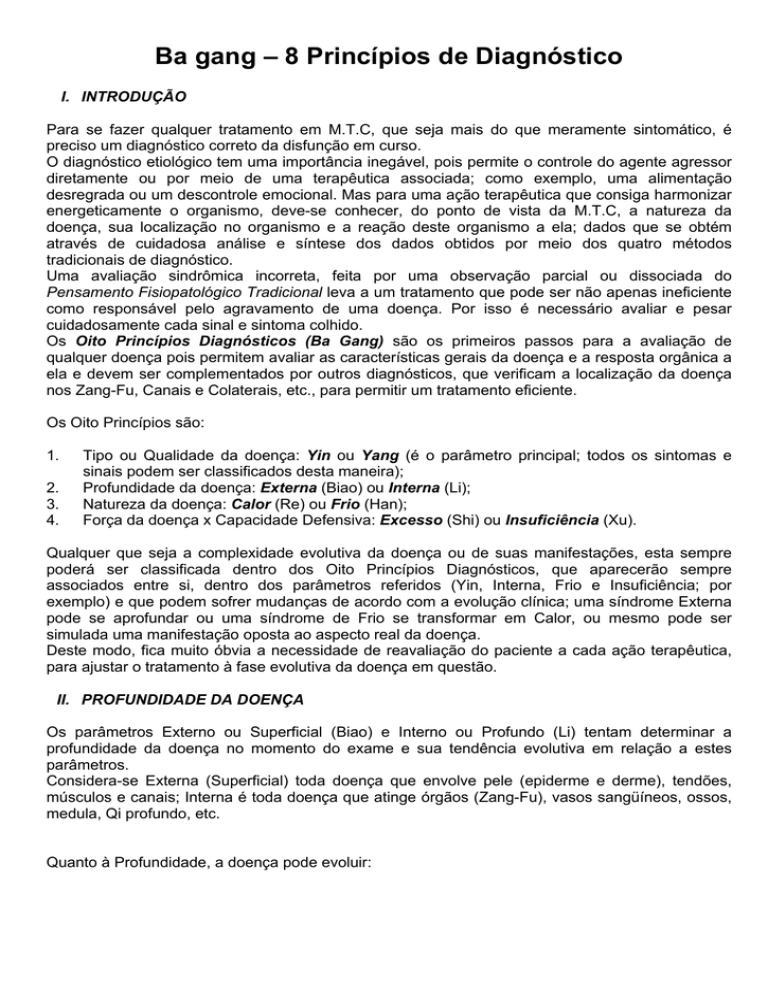 Ba gang – 8 Princípios de Diagnóstico I. INTRODUÇÃO Para se fazer qualquer tratamento em M.T.C, que seja mais do que meramente sintomático, é preciso um diagnóstico correto da disfunção em curso. O diagnóstico etiológico tem uma importância inegável, pois permite o controle do agente agressor diretamente ou por meio de uma terapêutica associada; como exemplo, uma alimentação desregrada ou um descontrole emocional. Mas para uma ação terapêutica que consiga harmonizar energeticamente o organismo, deve-se conhecer, do ponto de vista da M.T.C, a natureza da doença, sua localização no organismo e a reação deste organismo a ela; dados que se obtém através de cuidadosa análise e síntese dos dados obtidos por meio dos quatro métodos tradicionais de diagnóstico. Uma avaliação sindrômica incorreta, feita por uma observação parcial ou dissociada do Pensamento Fisiopatológico Tradicional leva a um tratamento que pode ser não apenas ineficiente como responsável pelo agravamento de uma doença. Por isso é necessário avaliar e pesar cuidadosamente cada sinal e sintoma colhido. Os Oito Princípios Diagnósticos (Ba Gang) são os primeiros passos para a avaliação de qualquer doença pois permitem avaliar as características gerais da doença e a resposta orgânica a ela e devem ser complementados por outros diagnósticos, que verificam a localização da doença nos Zang-Fu, Canais e Colaterais, etc., para permitir um tratamento eficiente. Os Oito Princípios são: 1. 2. 3. 4. Tipo ou Qualidade da doença: Yin ou Yang (é o parâmetro principal; todos os sintomas e sinais podem ser classificados desta maneira); Profundidade da doença: Externa (Biao) ou Interna (Li); Natureza da doença: Calor (Re) ou Frio (Han); Força da doença x Capacidade Defensiva: Excesso (Shi) ou Insuficiência (Xu). Qualquer que seja a complexidade evolutiva da doença ou de suas manifestações, esta sempre poderá ser classificada dentro dos Oito Princípios Diagnósticos, que aparecerão sempre associados entre si, dentro dos parâmetros referidos (Yin, Interna, Frio e Insuficiência; por exemplo) e que podem sofrer mudanças de acordo com a evolução clínica; uma síndrome Externa pode se aprofundar ou uma síndrome de Frio se transformar em Calor, ou mesmo pode ser simulada uma manifestação oposta ao aspecto real da doença. Deste modo, fica muito óbvia a necessidade de reavaliação do paciente a cada ação terapêutica, para ajustar o tratamento à fase evolutiva da doença em questão. II. PROFUNDIDADE DA DOENÇA Os parâmetros Externo ou Superficial (Biao) e Interno ou Profundo (Li) tentam determinar a profundidade da doença no momento do exame e sua tendência evolutiva em relação a estes parâmetros. Considera-se Externa (Superficial) toda doença que envolve pele (epiderme e derme), tendões, músculos e canais; Interna é toda doença que atinge órgãos (Zang-Fu), vasos sangüíneos, ossos, medula, Qi profundo, etc. Quanto à Profundidade, a doença pode evoluir: 2 1. 2. 3. 4. 5. 1. Aprofundamento de doença Externa, que passa a ser Interna e não mais Externa; Aprofundamento de doença Externa que ainda conserva aspectos Externos; Manutenção da doença a nível Externo; Doença apenas Interna que surge por desequilíbrio Yin/Yang interno; ataque direto ao interior por agente Externo (alimentação incorreta, por exemplo, atingindo o Estômago-Baçopâncreas); Doença Interna que se superficializa. A doença Externa só se aprofunda se há uma fraqueza da energia defensiva que permite este aprofundamento ou por um tratamento incorreto. Podemos considerar que tenha componente profundo, para efeito terapêutico, como uma doença Interna, devido à importância do interior do organismo e à necessidade de sua preservação. Síndrome Externa ou Superficial: Geralmente é causada por agressão à Superfície do organismo por um dos 6 Excessos ou Energias Perversas, ou por um traumatismo; se a energia defensiva é forte, permanece onde está, mas também pode ser o estágio precoce das doenças exógenas. Tem como característica um início geralmente súbito, com incubação curta e evolução rápida. Sintomas mais comuns: Febre; Temor ao Frio ou ao Vento; Cefaléia; Cervicalgia; Calafrios; Tosse; Transpiração espontânea; Irritação; Dolorimentos pelos membros e corpo; Pulso flutuante ou superficial; Pouca ou nenhuma alteração da saburra; Obstrução nasal e coriza. Fisiopatologicamente, tais sintomas se explicam pelo bloqueio da circulação de Energia Defensiva (Wei Qi) pelos excessos de Xie Qi que se localizam na pele e no tecido muscular; da congestão do Wei Qi surge a febre, de aspecto superficial. Como a regulação dos poros e o aquecimento dos músculos estão dificultados pelo bloqueio da Energia Defensiva, surge temor ao Vento e ao Frio. A pele é governada pelo Pulmão, que tem sua abertura no nariz; se a circulação energética da pele é agredida por fatores externos (Xie Qi) há obstrução da função de dispersão e descendência do Pulmão, com obstrução nasal, coriza, irritação na garganta e tosse. (Não se deve confundir, entretanto, com o quadro de aprofundamento da doença com lesão do Zang Pulmão). A perturbação da circulação superficial de energia pelos canais e colaterais leva aos dolorimentos pelo corpo, mialgia e sensação de cansaço nos membros; se há bloqueio das partes altas dos canais pode surgir cefaléia. Calafrios são sinais de doença Superficial, com Wei Qi fraco. Quando há bloqueio das vias respiratórias altas, o Qi Defensivo está baixo, quando há perspiração (transpiração com febre), é sinal de Wei Qi forte, tentando dispersar os Agentes Externos. 2. Síndrome Interna ou Profunda: É quando a doença está localizada no Interior do corpo (órgão, víscera, Qi Profundo, sangue, ossos, medula). Toda doença que tiver algum componente Interno deve ser considerada como tal, para efeito terapêutico. 