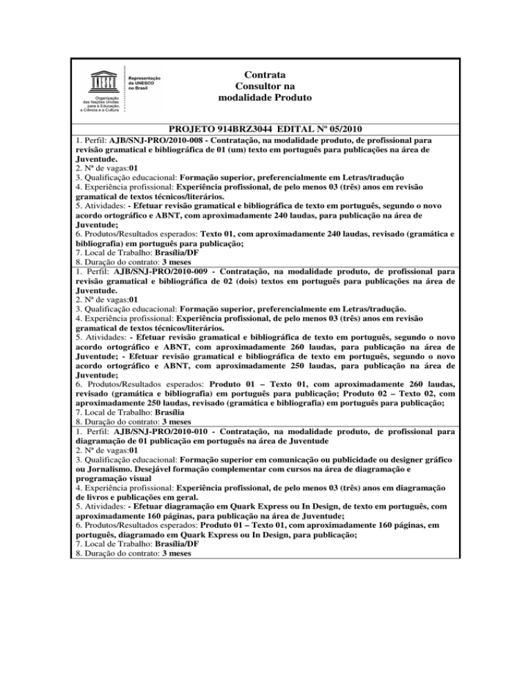 Contrata Consultor na modalidade Produto PROJETO 914BRZ3044 EDITAL Nº 05/2010 1. Perfil: AJB/SNJ-PRO/2010-008 - Contratação, na modalidade produto, de profissional para revisão gramatical e bibliográfica de 01 (um) texto em português para publicações na área de Juventude. 2. Nª de vagas:01 3. Qualificação educacional: Formação superior, preferencialmente em Letras/tradução 4. Experiência profissional: Experiência profissional, de pelo menos 03 (três) anos em revisão gramatical de textos técnicos/literários. 5. Atividades: - Efetuar revisão gramatical e bibliográfica de texto em português, segundo o novo acordo ortográfico e ABNT, com aproximadamente 240 laudas, para publicação na área de Juventude; 6. Produtos/Resultados esperados: Texto 01, com aproximadamente 240 laudas, revisado (gramática e bibliografia) em português para publicação; 7. Local de Trabalho: Brasília/DF 8. Duração do contrato: 3 meses 1. Perfil: AJB/SNJ-PRO/2010-009 - Contratação, na modalidade produto, de profissional para revisão gramatical e bibliográfica de 02 (dois) textos em português para publicações na área de Juventude. 2. Nª de vagas:01 3. Qualificação educacional: Formação superior, preferencialmente em Letras/tradução. 4. Experiência profissional: Experiência profissional, de pelo menos 03 (três) anos em revisão gramatical de textos técnicos/literários. 5. Atividades: - Efetuar revisão gramatical e bibliográfica de texto em português, segundo o novo acordo ortográfico e ABNT, com aproximadamente 260 laudas, para publicação na área de Juventude; - Efetuar revisão gramatical e bibliográfica de texto em português, segundo o novo acordo ortográfico e ABNT, com aproximadamente 250 laudas, para publicação na área de Juventude; 6. Produtos/Resultados esperados: Produto 01 – Texto 01, com aproximadamente 260 laudas, revisado (gramática e bibliografia) em português para publicação; Produto 02 – Texto 02, com aproximadamente 250 laudas, revisado (gramática e bibliografia) em português para publicação; 7. Local de Trabalho: Brasília 8. Duração do contrato: 3 meses 1. Perfil: AJB/SNJ-PRO/2010-010 - Contratação, na modalidade produto, de profissional para diagramação de 01 publicação em português na área de Juventude 2. Nª de vagas:01 3. Qualificação educacional: Formação superior em comunicação ou publicidade ou designer gráfico ou Jornalismo. Desejável formação complementar com cursos na área de diagramação e programação visual 4. Experiência profissional: Experiência profissional, de pelo menos 03 (três) anos em diagramação de livros e publicações em geral. 5. Atividades: - Efetuar diagramação em Quark Express ou In Design, de texto em português, com aproximadamente 160 páginas, para publicação na área de Juventude; 6. Produtos/Resultados esperados: Produto 01 – Texto 01, com aproximadamente 160 páginas, em português, diagramado em Quark Express ou In Design, para publicação; 7. Local de Trabalho: Brasília/DF 8. Duração do contrato: 3 meses 1. Perfil: AJB/SNJ-PRO/2010-011 - Contratação, na modalidade produto, de profissional para diagramação de 02 publicações em português na área de Juventude 2. Nª de vagas: 01 3. Qualificação educacional: Formação superior em comunicação ou publicidade ou designer gráfico ou Jornalismo. Desejável formação complementar com cursos na área de diagramação e programação visual 4. Experiência profissional: Experiência profissional, de pelo menos 03 (três) anos em diagramação de livros e publicações em geral. 5. Atividades: - Efetuar diagramação em Quark Express ou In Design, de texto em português, com aproximadamente 200 páginas, para publicação na área de Juventude; - Efetuar diagramação em Quark Express ou In Design, de texto em português, com aproximadamente 210 páginas, para publicação na área de Juventude; 6. Produtos/Resultados esperados: Produto 01 – Texto 01, com aproximadamente 200 páginas, em português, diagramado em Quark Express ou In Design, para publicação; Produto 02 – Texto 02, com aproximadamente 210 páginas, em português, diagramado em Quark Express ou In Design, para publicação; 7. Local de Trabalho: Brasilia/DF 8. Duração do contrato: 3 meses Os interessados deverão enviar o CV do dia 04/03/2010 2010 até o dia 11/03 11 03/2010 03 2010 no endereço eletrônico [email protected], [email protected] indicando o número do edital e o nome do perfil em que se candidata. Serão desconsiderados os CVs remetidos após a data limite indicada neste edital. Em atenção às disposições do decreto nº 5.151, de 22/07/2004, é vedada a contratação, a qualquer título, de servidores ativos da Administração Pública Federal, Estadual, do Distrito Federal ou Municipal, direta ou indireta, bem como empregados de suas subsidiárias ou controladas, no âmbito dos projetos de cooperação técnica internacional.