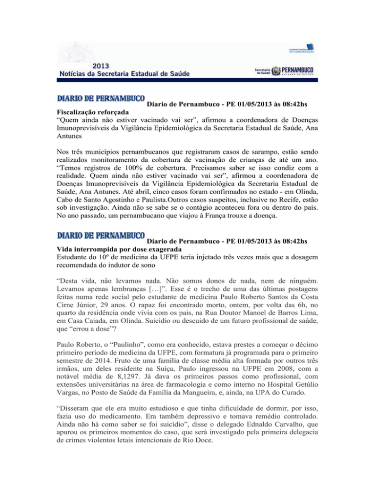 Diario de Pernambuco - PE 01/05/2013 às 08:42hs Fiscalização reforçada “Quem ainda não estiver vacinado vai ser”, afirmou a coordenadora de Doenças Imunoprevisíveis da Vigilância Epidemiológica da Secretaria Estadual de Saúde, Ana Antunes Nos três municípios pernambucanos que registraram casos de sarampo, estão sendo realizados monitoramento da cobertura de vacinação de crianças de até um ano. “Temos registros de 100% de cobertura. Precisamos saber se isso condiz com a realidade. Quem ainda não estiver vacinado vai ser”, afirmou a coordenadora de Doenças Imunoprevisíveis da Vigilância Epidemiológica da Secretaria Estadual de Saúde, Ana Antunes. Até abril, cinco casos foram confirmados no estado - em Olinda, Cabo de Santo Agostinho e Paulista.Outros casos suspeitos, inclusive no Recife, estão sob investigação. Ainda não se sabe se o contágio aconteceu fora ou dentro do país. No ano passado, um pernambucano que viajou à França trouxe a doença. Diario de Pernambuco - PE 01/05/2013 às 08:42hs Vida interrompida por dose exagerada Estudante do 10º de medicina da UFPE teria injetado três vezes mais que a dosagem recomendada do indutor de sono “Desta vida, não levamos nada. Não somos donos de nada, nem de ninguém. Levamos apenas lembranças […]”. Esse é o trecho de uma das últimas postagens feitas numa rede social pelo estudante de medicina Paulo Roberto Santos da Costa Cirne Júnior, 29 anos. O rapaz foi encontrado morto, ontem, por volta das 6h, no quarto da residência onde vivia com os pais, na Rua Doutor Manoel de Barros Lima, em Casa Caiada, em Olinda. Suicídio ou descuido de um futuro profissional de saúde, que “errou a dose”? Paulo Roberto, o “Paulinho”, como era conhecido, estava prestes a começar o décimo primeiro período de medicina da UFPE, com formatura já programada para o primeiro semestre de 2014. Fruto de uma família de classe média alta formada por outros três irmãos, um deles residente na Suíça, Paulo ingressou na UFPE em 2008, com a notável média de 8,1297. Já dava os primeiros passos como profissional, com extensões universitárias na área de farmacologia e como interno no Hospital Getúlio Vargas, no Posto de Saúde da Família da Mangueira, e, ainda, na UPA do Curado. “Disseram que ele era muito estudioso e que tinha dificuldade de dormir, por isso, fazia uso do medicamento. Era também depressivo e tomava remédio controlado. Ainda não há como saber se foi suicídio”, disse o delegado Ednaldo Carvalho, que apurou os primeiros momentos do caso, que será investigado pela primeira delegacia de crimes violentos letais intencionais de Rio Doce. A verdade é que a vida de Paulo Roberto passava longe do ideal de perfeição. Em 2011, o jovem foi preso em flagrante pelo furto de um notebook, crime pelo qual cumpriu, em liberdade condicional, pena de dois anos. Segundo a polícia, o rapaz tinha um quadro psiquiátrico delicado, necessitando fazer uso de medicamentos controlados contra uma depressão que se arrastava há anos. Por conta de uma insônia crônica, fazia uso de sedativos pesados, chegando ao ponto de, no ano passado, ser socorrido numa emergência por conta de outra crise provocado pelas drogas. Recentemente, havia discutido com a namorada, com quem estudava medicina. De acordo com a perícia, não havia lesão no corpo do estudante. “O que mais chama a atenção é a grande quantidade de medicamentos controlados, antiansiolíticos, da família do Diazepam, que foram encontrados num armário, fechado com cadeado. Foram quatro gavetas cheias de caixas de remédios”, disse o perito André do Amaral. Em recesso, a UFPE não chegou a decretar luto pela morte de Paulo Roberto, que será enterrado hoje, no Cemitério Morada da Paz, em Paulista. Abalados, familiares optaram pelo silêncio. O exemplo do estudante resta em suas próprias palavras, na citação que nortearia os planos de seu ano: “Às vezes você tem que morrer por dentro para levantar-se das suas próprias cinzas e acreditar em si mesmo e amar a si mesmo para se tornar uma nova pessoa”. Diario de Pernambuco - PE 01/05/2013 às 08:42hs Medicamentos serão rastreados A origem dos medicamentos encontrados no quarto do estudante de medicina Paulo Roberto Cirne Júnior deve ser investigada pela Agência Pernambucana de Saúde (Apevisa). De acordo com o gerente geral, Jaime Brito, é provável que o órgão faça parte da investigação para responder se houve crime na aquisição das substâncias de uso controlado, normalmente limitadas a quantidades ministráveis apenas pelo período de sessenta dias. Nesse caso, o registro dos lotes das substâncias servirá para rastrear onde o estudante de medicina os adquiriu e quem os forneceu. “É estranho que se tenha antiansiolíticos numa quantidade muito fora do normal. Em casos assim, pode-se verificar a procedência da prescrição médica, se houver, o que pode resultar numa denúncia ao Cremepe, caso o profissional responsável por todas as indicações seja o mesmo”, explica Brito. Segundo ele, apenas se configura crime de tráfico de entorpecentes, a hipótese de que os remédios tenham sido adquiridos em pontos de venda sem a devida prescrição médica ou, em último caso, se houve algum tipo de desvio de medicamentos de alguma unidade de saúde. “Tudo isso tem que ser verificado e apurado, caso sejamos acionados, como normalmente acontece”, explica. Jornal do Commercio - PE 01/05/2013 às 08:17hs Dia a Dia Rômulo recebe A Hemobrás recebe amanhã, no Memorial JK, no DF, o Selo de Pró-Equidade de Gênero e Raça da Presidência, em reconhecimento às empresas que promovem ambiente de trabalho mais igualitário. A ministra Eleonora Menicucci entrega o selo a Rômulo Maciel. Diario de Pernambuco - PE01/05/2013 às 08:33hs Quando os médicos viram os pacientes Cremepe apura 25 casos envolvendo os profissionais. Desses, 60% por algum tipo de dependência química 