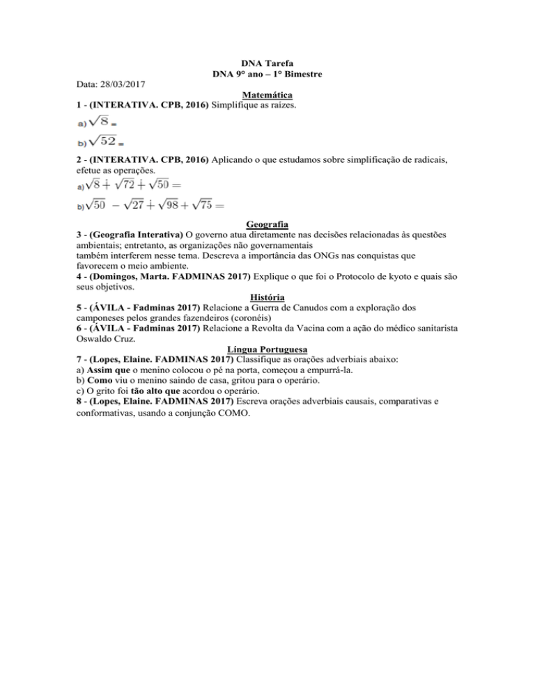 DNA Tarefa DNA 9° ano – 1° Bimestre Data: 28/03/2017 Matemática 1 - (INTERATIVA. CPB, 2016) Simplifique as raízes. 2 - (INTERATIVA. CPB, 2016) Aplicando o que estudamos sobre simplificação de radicais, efetue as operações. Geografia 3 - (Geografia Interativa) O governo atua diretamente nas decisões relacionadas às questões ambientais; entretanto, as organizações não governamentais também interferem nesse tema. Descreva a importância das ONGs nas conquistas que favorecem o meio ambiente. 4 - (Domingos, Marta. FADMINAS 2017) Explique o que foi o Protocolo de kyoto e quais são seus objetivos. História 5 - (ÁVILA - Fadminas 2017) Relacione a Guerra de Canudos com a exploração dos camponeses pelos grandes fazendeiros (coronéis) 6 - (ÁVILA - Fadminas 2017) Relacione a Revolta da Vacina com a ação do médico sanitarista Oswaldo Cruz. Língua Portuguesa 7 - (Lopes, Elaine. FADMINAS 2017) Classifique as orações adverbiais abaixo: a) Assim que o menino colocou o pé na porta, começou a empurrá-la. b) Como viu o menino saindo de casa, gritou para o operário. c) O grito foi tão alto que acordou o operário. 8 - (Lopes, Elaine. FADMINAS 2017) Escreva orações adverbiais causais, comparativas e conformativas, usando a conjunção COMO.