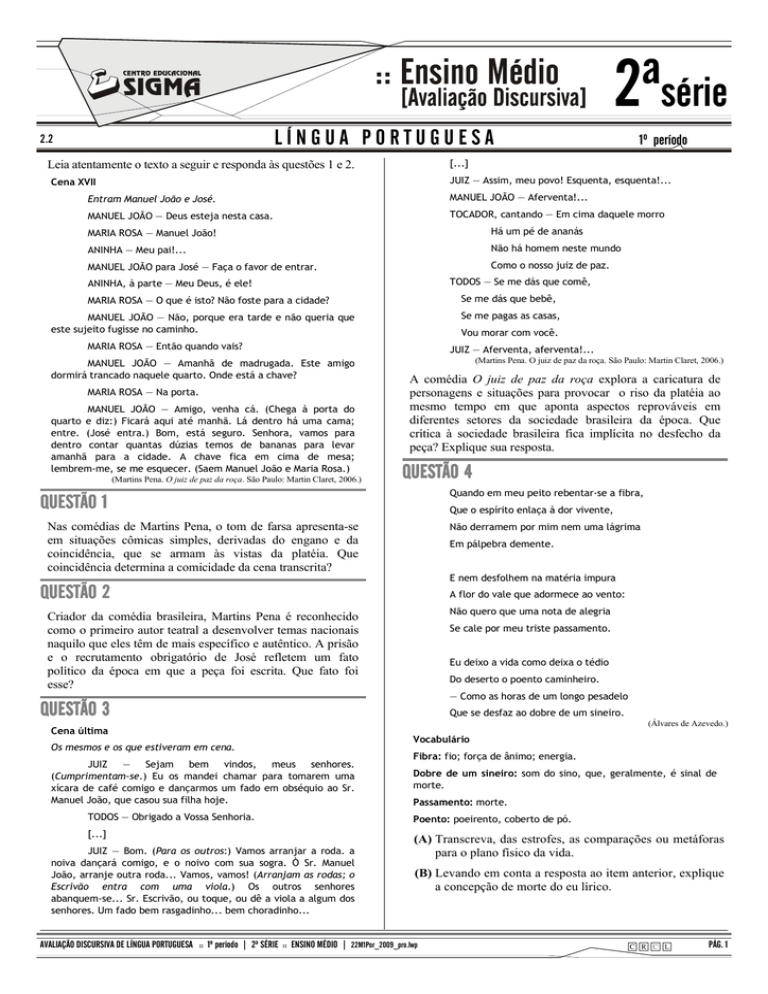 CENTRO EDUCACIONAL SIGMA :: 2ªsérie LÍNGUA PORTUGUESA 2.2 1º período [...] Leia atentamente o texto a seguir e responda às questões 1 e 2. JUIZ — Assim, meu povo! Esquenta, esquenta!... Cena XVII Entram Manuel João e José. MANUEL JOÃO — Aferventa!... MANUEL JOÃO — Deus esteja nesta casa. TOCADOR, cantando — Em cima daquele morro MARIA ROSA — Manuel João! Há um pé de ananás ANINHA — Meu pai!... Não há homem neste mundo MANUEL JOÃO para José — Faça o favor de entrar. Como o nosso juiz de paz. TODOS — Se me dás que comê, ANINHA, à parte — Meu Deus, é ele! Se me dás que bebê, MARIA ROSA — O que é isto? Não foste para a cidade? Se me pagas as casas, MANUEL JOÃO — Não, porque era tarde e não queria que este sujeito fugisse no caminho. Vou morar com você. MARIA ROSA — Então quando vais? MANUEL JOÃO — Amanhã de madrugada. Este amigo dormirá trancado naquele quarto. Onde está a chave? MARIA ROSA — Na porta. MANUEL JOÃO — Amigo, venha cá. (Chega à porta do quarto e diz:) Ficará aqui até manhã. Lá dentro há uma cama; entre. (José entra.) Bom, está seguro. Senhora, vamos para dentro contar quantas dúzias temos de bananas para levar amanhã para a cidade. A chave fica em cima de mesa; lembrem-me, se me esquecer. (Saem Manuel João e Maria Rosa.) (Martins Pena. O juiz de paz da roça. São Paulo: Martin Claret, 2006.) JUIZ — Aferventa, aferventa!... (Martins Pena. O juiz de paz da roça. São Paulo: Martin Claret, 2006.) A comédia O juiz de paz da roça explora a caricatura de personagens e situações para provocar o riso da platéia ao mesmo tempo em que aponta aspectos reprováveis em diferentes setores da sociedade brasileira da época. Que crítica à sociedade brasileira fica implícita no desfecho da peça? Explique sua resposta. QUESTÃO 4 Quando em meu peito rebentar-se a fibra, QUESTÃO 1 Que o espírito enlaça à dor vivente, Nas comédias de Martins Pena, o tom de farsa apresenta-se em situações cômicas simples, derivadas do engano e da coincidência, que se armam às vistas da platéia. Que coincidência determina a comicidade da cena transcrita? Não derramem por mim nem uma lágrima Em pálpebra demente. E nem desfolhem na matéria impura QUESTÃO 2 A flor do vale que adormece ao vento: Não quero que uma nota de alegria Criador da comédia brasileira, Martins Pena é reconhecido como o primeiro autor teatral a desenvolver temas nacionais naquilo que eles têm de mais específico e autêntico. A prisão e o recrutamento obrigatório de José refletem um fato político da época em que a peça foi escrita. Que fato foi esse? Se cale por meu triste passamento. Eu deixo a vida como deixa o tédio Do deserto o poento caminheiro. — Como as horas de um longo pesadelo QUESTÃO 3 Cena última Os mesmos e os que estiveram em cena. JUIZ — Sejam bem vindos, meus senhores. (Cumprimentam-se.) Eu os mandei chamar para tomarem uma xícara de café comigo e dançarmos um fado em obséquio ao Sr. Manuel João, que casou sua filha hoje. Que se desfaz ao dobre de um sineiro. (Álvares de Azevedo.) Vocabulário Fibra: fio; força de ânimo; energia. Dobre de um sineiro: som do sino, que, geralmente, é sinal de morte. Passamento: morte. TODOS — Obrigado a Vossa Senhoria. Poento: poeirento, coberto de pó. [...] (A) Transcreva, das estrofes, as comparações ou metáforas para o plano físico da vida. JUIZ — Bom. (Para os outros:) Vamos arranjar a roda. a noiva dançará comigo, e o noivo com sua sogra. Ò Sr. Manuel João, arranje outra roda... Vamos, vamos! (Arranjam as rodas; o Escrivão entra com uma viola.) Os outros senhores abanquem-se... Sr. Escrivão, ou toque, ou dê a viola a algum dos senhores. Um fado bem rasgadinho... bem choradinho... (B) Levando em conta a resposta ao item anterior, explique a concepção de morte do eu lírico. AVALIAÇÃO DISCURSIVA DE LÍNGUA PORTUGUESA :: 1º período | 2ª SÉRIE :: ENSINO MÉDIO | 22M1Por_2009_pro.lwp PÁG. 1 CENTRO EDUCACIONAL SIGMA :: (A) Na frase "Só falta batizá-la, dar-lhe nome cristão", ocorrem dois pronomes pessoais. Explique por que não se empregou duas vezes o mesmo pronome, já que, nos dois casos, o pronome é complemento do verbo. QUESTÃO 5 Nova canção do exílio Um sabiá na palmeira, longe. (B) Na última frase do primeiro parágrafo, o pronome pessoal lhe indica posse. A oração "quem lhe percorre os corredores" significa "quem percorre os seus corredores". Retire do texto outro pronome pessoal indicando posse. Estas aves cantam um outro canto. O céu cintila sobre flores úmidas. QUESTÃO 7 Vozes na mata, Observe os pronomes destacados na cena descrita a seguir. e o maior amor. Quando Juana entra, a princípio não a reconheço, pois ela caminha para mim contra um fundo rútilo, a grande janela por onde jorra a luz do sol. (...) Está sem chapéu: julgo ver-lhe nos cabelos negros vagos reflexos azulados. Ou tudo será obra de minha fantasia? Porque já começo a encará-la em termos de pintura. Fico a fazer-lhe o retrato, bem nessa postura. Desejo vivamente que este minuto se prolongue. É melhor que ela não fale, não se mova. Vamos fixar na tela esta imagem de humana e profunda beleza. Só, na noite, seria feliz: um sabiá, na palmeira, longe. Onde tudo é belo (Erico Veríssimo. Saga. Porto alegre, Globo, 1969. p. 119.) e fantástico, (A) Todos os pronomes destacados são de terceira pessoa. Classifique-os e identifique a função sintática de cada um deles na ordem em que aparecem no texto. só, na noite, seria feliz. (B) A que se referem, respectivamente, os pronomes demonstrativos encontrados nos seguintes trechos: "Fico a fazer-lhe o retrato, bem nessa postura" e em "Desejo vivamente que este minuto se prolongue"? (um sabiá, na palmeira, longe.) Ainda um grito de vida e Leia o texto a seguir e responda às questões 8, 9 e 10. voltar Carros letrados para onde tudo é belo A turma atrás do balcão do cartório do 1º Ofício de