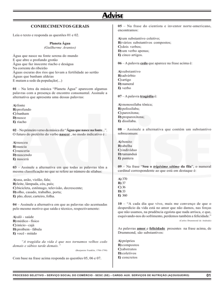 CONHECIMENTOS GERAIS 05 – Na frase do cientista e inventor norte-americano, encontramos: Leia o texto e responda as questões 01 e 02. Planeta Água (Guilherme Arantes) Água que nasce na fonte serena do mundo E que abre o profundo grotão Água que faz inocente riacho e deságua Na corrente do ribeirão Águas escuras dos rios que levam a fertilidade ao sertão Águas que banham aldeias E matam a sede da população(...) 01 – Na letra da música “Planeta Água” aparecem algumas palavras com a presença de encontro consonantal. Assinale a alternativa que apresenta uma dessas palavras: A) um substantivo coletivo; B) vários substantivos compostos; C) dois verbos; D) um verbo apenas; E) cinco artigos. 06 – A palavra cedo que aparece na frase acima é: A) substantivo B) advérbio C) artigo D) numeral E) verbo 07 – A palavra tragédia é: A) fonte B) profundo C) banham D) nasce E) riacho A) monossílaba tônica; B) polissílaba; C) paroxítona; D) proparoxítona; E) dissílaba. 02 – No primeiro verso da música diz “Água que nasce na fonte...”. O futuro do pretérito do verbo nascer , no modo indicativo é : 08 – Assinale a alternativa que contém um substantivo sobrecomum: A) nasceu B) nascia C) nasceria D) nascendo E) nascerá A) bonito B) abelha C) indivíduo D) tamanduá E) pantera 03 – Assinale a alternativa em que todas as palavras têm a mesma classificação no que se refere ao número de sílabas: 09 – Na frase “Sou o trigésimo sétimo da fila”, o numeral cardinal correspondente ao que está em destaque é: A) asa, anão, violão, fala; B) leite, lâmpada, céu, país; C) bicicleta, estômago, televisão, decrescente; D) olho, casado, trabalho, porta; E) pão, dizer, carteiro, folha. A) 370 B) 37 C) 36 D) 33 E) 360 04 – Assinale a alternativa em que as palavras são acentuadas pelo mesmo motivo que saída e técnico, respectivamente: 10 – “A cada dia que vivo, mais me convenço de que o desperdício da vida está no amor que não damos, nas forças que não usamos, na prudência egoísta que nada arrisca, e que, esquivando-nos do sofrimento, perdemos também a felicidade.” A) alô - saúde B) médico - físico C) início - cajá D) proíbem - fábula E) você - miúdo (Carlos Drummond de Andrade) As palavras amor e felicidade presentes na frase acima, de Drummond, são substantivos: “A tragédia da vida é que nos tornamos velhos cedo demais e sábios tarde demais.” (Benjamim Franklin, 1706-1790) Com base na frase acima responda as questões 05, 06 e 07. A) próprios B) compostos C) abstratos D) coletivos E) concretos PROCESSO SELETIVO – SERVIÇO SOCIAL DO COMÉRCIO - SESC (SE) – CARGO: AUX. SERVIÇOS DE NUTRIÇÃO (AÇOUGUEIRO) 01 11 – Os números naturais 0, 1, 2, 3, 4, 5, 6, 7, 8, e 9 também são conhecidos como algarismos: A) romanos; B) indo-arábicos; C) arábicos; D) romano-arábicos; E) egípcios. 17 – Se eu tenho 750 moedas de 1 centavo, eu tenho: A) R$ 7,50; B) R$ 70,50; C) R$ 75,00; D) R$ 75,50; E) R$ 705,50. 18 – O sucessor de 1.999 é: 12 – Aponte a alternativa abaixo em que NÃO aparece um número consecutivo. A) 1, 2, 3; B) 21, 22, 23; C) 101, 102, 103; D) 1010, 1011, 1012; E) 2010, 2012, 2013. A) 1.997; B) 1.999; C) 2.000; D) 2.100; E) 3.000. 19 – Se um kg de frutas e verduras juntas custa R$ 1.30, quanto custa 7 kg destes mesmos itens: Observe a imagem abaixo e responda as questões 03 e 04. 13 – O formato da imagem que aparece acima é de um: http://1.bp.blogspot.com/_6VhUGzk1WGQ/SoRcBJFiB8I/AAAAAAAABD4/LT-2QyorD5M/s400/ A) quadrado B) círculo C) retângulo D) triângulo E) losango 14 – A régua acima tem 15 centímetros, quantos centrímentos são necessários para formar um metro? A) 10 cm; B) 100 cm; C) 1000 cm; D) 101 cm; E) 110 cm. frutas.jpg A) R$ 7.10; B) R$ 7.90; C) R$ 8.30; D) R$ 9.10; E) R$ 9.30. 20 – Aponte a alternativa que apresenta a forma geométrica de um triângulo. A) D) B) E) 15 – Numa garrafa de refrigerante abaixo tem 290 ml, porém eu preciso de 1 litro para levar à festa. Marque a alternativa em que aparece a quantidade exata, para completar um litro: A) 350 ml de refrigerante; B) 400 ml de refrigerante; C) 500 ml de refrigerante; D) 610 ml de refrigerante; E) 710 ml de refrigerante. 16 – Se eu tenho 150 reais para gastar na minha feira da semana, e transformo esses reais em algarismo romano fica: C) A) CL B) DL C) ML D) LM E) IM PROCESSO SELETIVO – SERVIÇO SOCIAL DO COMÉRCIO - SESC (SE) – CARGO: AUX. SERVIÇOS DE NUTRIÇÃO (AÇOUGUEIRO) 02 CONHECIMENTOS ESPECÍFICOS 21 – O armazenamento de alimentos envolve alguns tipos de procedimentos básicos: I. Congelamento; II. Refrigeração; III. Esquentamento; IV. Estoque seco. Estão corretos os itens: A) I e II, apenas; B) I e III, apenas; C) I e IV, apenas; D) I, II e III, apenas; E) I, II e IV, apenas. 22 – Aponte a única alternativa INCORRETA sobre o armazenamento de produtos. A) Tudo deve estar identificado; B) O estoque e as embalagens devem ser mantidos limpos e secos; C) Produtos descartáveis podem ficar juntos a outros alimentos; D) O empilhamento no estoque deve ser alinhado e em altura que não prejudique as características do produto; E) Os alimentos não devem ficar armazenados junto a produtos de limpeza, químicos, de higiene e perfumaria. 23 – Todos os itens abaixo são causas de acidentes de trabalho, EXCETO: I. ato inseguro; II. condição insegura; III. fator pessoal de insegurança. Está (ao) corretos o (s) item (ns): 25 – Sobre o ambiente de trabalho, os riscos ocupacionais e o esforço físico intenso estão inseridos no grupo: A) físico; B) químico; C) biológico; D) ergonômico; E) de acidentes. 26 – Aponte a alternativa abaixo que NÃO apresenta fatores de diminuição de acidentes no trabalho. A) Sinalização de toda a empresa; B) Ausência de kit de primeiros socorros; C) Comissão Interna de Prevenção de Acidentes (CIPA) atuante; D) Utilização de chaves de segurança; E) Trei