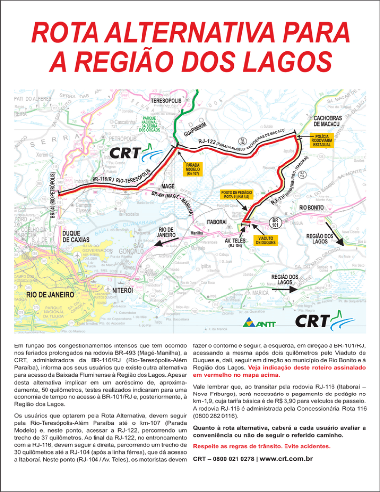 ROTA ALTERNATIVA PARA A REGIÃO DOS LAGOS IM IMIR P A GU RJ-122 (PA R AD RJ 122 A MO AS IR DE M ACA CU ) DE LO - C RJ 116 (Km 107) BR-040 (RIO-PETRÓPOLIS) POLÍCIA RODOVIÁRIA ESTADUAL A PARADA MODELO MAGÉ CACHOEIRAS DE MACACU CH PARQUE NACIONAL DA SERRA DOS ORGÃOS OE TERESÓPOLIS POSTO DE PEDÁGIO ROTA 11 (KM 1,9) RIO BONITO RIO DE JANEIRO DUQUE DE CAXIAS RIO DE JANEIRO BR 101 ITABORAÍ Manilha AV. TELES (RJ 104) NITERÓI Em função dos congestionamentos intensos que têm ocorrido nos feriados prolongados na rodovia BR-493 (Magé-Manilha), a CRT, administradora da BR-116/RJ (Rio-Teresópolis-Além Paraíba), informa aos seus usuários que existe outra alternativa para acesso da Baixada Fluminense à Região dos Lagos. Apesar desta alternativa implicar em um acréscimo de, aproximadamente, 50 quilômetros, testes realizados indicaram para uma economia de tempo no acesso à BR-101/RJ e, posteriormente, à Região dos Lagos. Os usuários que optarem pela Rota Alternativa, devem seguir pela Rio-Teresópolis-Além Paraíba até o km-107 (Parada Modelo) e, neste ponto, acessar a RJ-122, percorrendo um trecho de 37 quilômetros. Ao final da RJ-122, no entroncamento com a RJ-116, devem seguir à direita, percorrendo um trecho de 30 quilômetros até a RJ-104 (após a linha férrea), que dá acesso a Itaboraí. Neste ponto (RJ-104 / Av. Teles), os motoristas devem VIADUTO DE DUQUES REGIÃO DOS LAGOS REGIÃO DOS LAGOS fazer o contorno e seguir, à esquerda, em direção à BR-101/RJ, acessando a mesma após dois quilômetros pelo Viaduto de Duques e, dali, seguir em direção ao município de Rio Bonito e à Região dos Lagos. Veja indicação deste roteiro assinalado em vermelho no mapa acima. Vale lembrar que, ao transitar pela rodovia RJ-116 (Itaboraí – Nova Friburgo), será necessário o pagamento de pedágio no km-1,9, cuja tarifa básica é de R$ 3,90 para veículos de passeio. A rodovia RJ-116 é administrada pela Concessionária Rota 116 (0800 282 0116). Quanto à rota alternativa, caberá a cada usuário avaliar a conveniência ou não de seguir o referido caminho. Respeite as regras de trânsito. Evite acidentes. CRT – 0800 021 0278 | www.crt.com.br