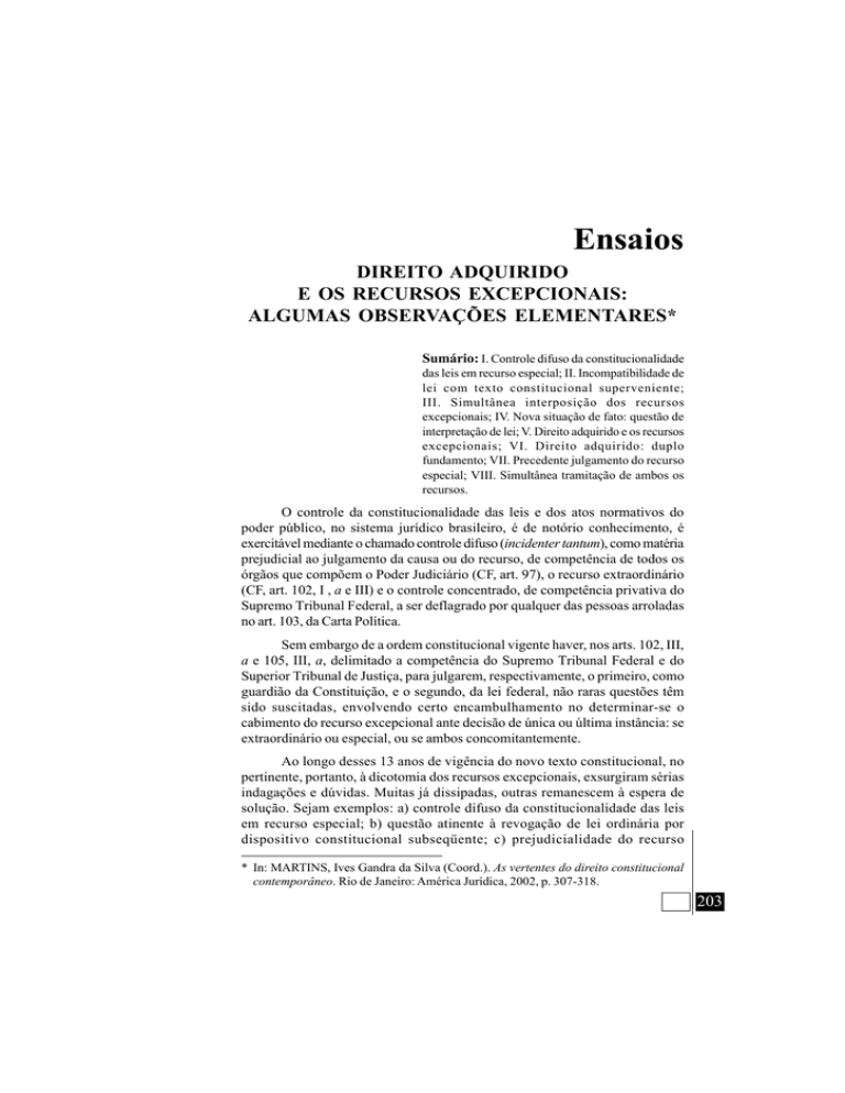 Ensaios DIREITO ADQUIRIDO E OS RECURSOS EXCEPCIONAIS: ALGUMAS OBSERVAÇÕES ELEMENTARES* Sumário: I. Controle difuso da constitucionalidade das leis em recurso especial; II. Incompatibilidade de lei com texto constitucional superveniente; III. Simultânea interposição dos recursos excepcionais; IV. Nova situação de fato: questão de interpretação de lei; V. Direito adquirido e os recursos excepcionais; VI. Direito adquirido: duplo fundamento; VII. Precedente julgamento do recurso especial; VIII. Simultânea tramitação de ambos os recursos. O controle da constitucionalidade das leis e dos atos normativos do poder público, no sistema jurídico brasileiro, é de notório conhecimento, é exercitável mediante o chamado controle difuso (incidenter tantum), como matéria prejudicial ao julgamento da causa ou do recurso, de competência de todos os órgãos que compõem o Poder Judiciário (CF, art. 97), o recurso extraordinário (CF, art. 102, I , a e III) e o controle concentrado, de competência privativa do Supremo Tribunal Federal, a ser deflagrado por qualquer das pessoas arroladas no art. 103, da Carta Política. Sem embargo de a ordem constitucional vigente haver, nos arts. 102, III, a e 105, III, a, delimitado a competência do Supremo Tribunal Federal e do Superior Tribunal de Justiça, para julgarem, respectivamente, o primeiro, como guardião da Constituição, e o segundo, da lei federal, não raras questões têm sido suscitadas, envolvendo certo encambulhamento no determinar-se o cabimento do recurso excepcional ante decisão de única ou última instância: se extraordinário ou especial, ou se ambos concomitantemente. Ao longo desses 13 anos de vigência do novo texto constitucional, no pertinente, portanto, à dicotomia dos recursos excepcionais, exsurgiram sérias indagações e dúvidas. Muitas já dissipadas, outras remanescem à espera de solução. Sejam exemplos: a) controle difuso da constitucionalidade das leis em recurso especial; b) questão atinente à revogação de lei ordinária por dispositivo constitucional subseqüente; c) prejudicialidade do recurso * In: MARTINS, Ives Gandra da Silva (Coord.). As vertentes do direito constitucional contemporâneo. Rio de Janeiro: América Jurídica, 2002, p. 307-318. 203 Coletânea de Julgados e Momentos Jurídicos dos Magistrados no TFR e STJ extraordinário em relação ao recurso especial; d) causas decididas, em única ou última instância, pelos Tribunais Regionais Federais ou pelos tribunais dos Estados, do Distrito Federal e Territórios, quando a decisão fundar-se em preceito legal e constitucional; e e) quando essa decisão tiver por fundamento direito adquirido. As questões a que se referem as alíneas a, b e c já estão solucionadas, como adiante se verá. Sobrevivem, contudo, as postas nas letras d e e que têm provocado acesas discussões e certa perplexidade. I. CONTROLE DIFUSO DA CONSTITUCIONALIDADE DAS LEIS EM RECURSO ESPECIAL A princípio, houve certa dúvida quanto ao Superior Tribunal de Justiça poder exercer o controle difuso da constitucionalidade das leis, em sede de recurso especial, à vista da índole desse recurso. Detendo-se, porém, na leitura do art. 97, da Constituição, em que não há exceção alguma, entendeu-se caber ao STJ, em recurso especial, incidenter tantum, desde que pelo “voto da maioria absoluta de seus membros ou dos membros do respectivo órgão especial”, de igual modo que os demais tribunais do país, declarar a inconstitucionalidade de lei ou ato normativo do Poder Público, observada, por conseguinte, a cláusula de reserva de plenário, cabendo dessa decisão recurso extraordinário para o Excelso Pretório. Lê-se na Argüição de Inconstitucionalidade no Recurso Especial n° 12.005/ RS (DJ 10.05.93), Relator Ministro Pádua Ribeiro: “(...) A Constituição, no seu artigo 105, inciso III, estabelece a competência desta Corte para julgar recurso especial, versando sobre matéria infraconstitucional. Mas outro artigo estabelece a competência de todos os Tribunais para declarar a inconstitucionalidade de lei ou ato normativo do Poder Público. Trata-se, portanto, de declaração incidenter tantum, não havendo qualquer razão plausível, à vista do nosso sistema constitucional, de negar-se apenas a um Tribunal, da hierarquia deste, poderes de incidentemente declarar a inconstitucionalidade de lei diante de um recurso especial que esteja a apreciar.” II. INCOMPATIBILIDADE DE LEI COM TEXTO CONSTITUCIONAL SUPERVENIENTE A hipótese de lei incompatível com texto constitucional superveniente tem sido considerada como revogação, consoante o precedente do Supremo Tribunal Federal na ADIN n° 415.8.600-DF, Relator o Min. Paulo Brossard, reafirmando antiga jurisprudência da Corte Maior. Cabe indagar se essa revogação é de natureza constitucional ou não. 204 Ministro José Arnaldo “A incompatibilidade de lei com nova Constituição importa em sua revogação por inconstitucionalidade superveniente. É próprio do recurso extraordinário – e não do recurso especial – a declaração de inconstitucionalidade superveniente” (STJ, RDA 202/224. No mesmo sentido: STF, RDA 203/243, in Theotonio Negrão, 32ª ed., nota 4ª ao art. 97, da Constituição, p. 31). Tratando-se, por conseguinte, de apuração de assimetria de lei anterior com a nova Constituição, implica exame de confronto entre a lei antes elaborada e o preceito constitucional sobrevindo, tema que se insere no âmbito do recurso extraordinário. No que se refere à apresentação simultânea dos recursos excepcionais, julgado o especial, os autos serão encaminhados ao STF para apreciação do extraordinário, se este não estiver prejudicado. Comumente, aí se encerra a via recursal com a proclamação da perda de objeto do extraordinário. III. SIMULTÂNEA INTERPOSIÇÃO DOS RECURSOS EXCEPCIONAIS De árdua solução têm-se revelado as hipóteses de, interpostos ambos os recursos, o e